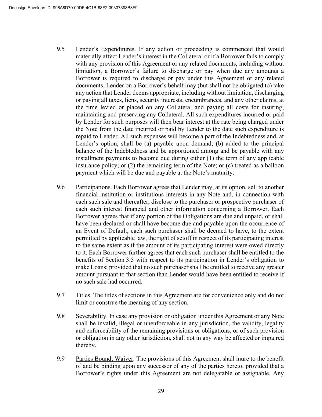 29 9.5 Lender’s Expenditures. If any action or proceeding is commenced that would materially affect Lender’s interest in the Collateral or if a Borrower fails to comply with any provision of this Agreement or any related documents, including without limitation, a Borrower’s failure to discharge or pay when due any amounts a Borrower is required to discharge or pay under this Agreement or any related documents, Lender on a Borrower’s behalf may (but shall not be obligated to) take any action that Lender deems appropriate, including without limitation, discharging or paying all taxes, liens, security interests, encumbrances, and any other claims, at the time levied or placed on any Collateral and paying all costs for insuring; maintaining and preserving any Collateral. All such expenditures incurred or paid by Lender for such purposes will then bear interest at the rate being charged under the Note from the date incurred or paid by Lender to the date such expenditure is repaid to Lender. All such expenses will become a part of the Indebtedness and, at Lender’s option, shall be (a) payable upon demand; (b) added to the principal balance of the Indebtedness and be apportioned among and be payable with any installment payments to become due during either (1) the term of any applicable insurance policy; or (2) the remaining term of the Note; or (c) treated as a balloon payment which will be due and payable at the Note’s maturity. 9.6 Participations. Each Borrower agrees that Lender may, at its option, sell to another financial institution or institutions interests in any Note and, in connection with each such sale and thereafter, disclose to the purchaser or prospective purchaser of each such interest financial and other information concerning a Borrower. Each Borrower agrees that if any portion of the Obligations are due and unpaid, or shall have been declared or shall have become due and payable upon the occurrence of an Event of Default, each such purchaser shall be deemed to have, to the extent permitted by applicable law, the right of setoff in respect of its participating interest to the same extent as if the amount of its participating interest were owed directly to it. Each Borrower further agrees that each such purchaser shall be entitled to the benefits of Section 3.5 with respect to its participation in Lender’s obligation to make Loans; provided that no such purchaser shall be entitled to receive any greater amount pursuant to that section than Lender would have been entitled to receive if no such sale had occurred. 9.7 Titles. The titles of sections in this Agreement are for convenience only and do not limit or construe the meaning of any section. 9.8 Severability. In case any provision or obligation under this Agreement or any Note shall be invalid, illegal or unenforceable in any jurisdiction, the validity, legality and enforceability of the remaining provisions or obligations, or of such provision or obligation in any other jurisdiction, shall not in any way be affected or impaired thereby. 9.9 Parties Bound; Waiver. The provisions of this Agreement shall inure to the benefit of and be binding upon any successor of any of the parties hereto; provided that a Borrower’s rights under this Agreement are not delegatable or assignable. Any Docusign Envelope ID: 996A8D70-00DF-4C1B-88F2-39337398B8F9