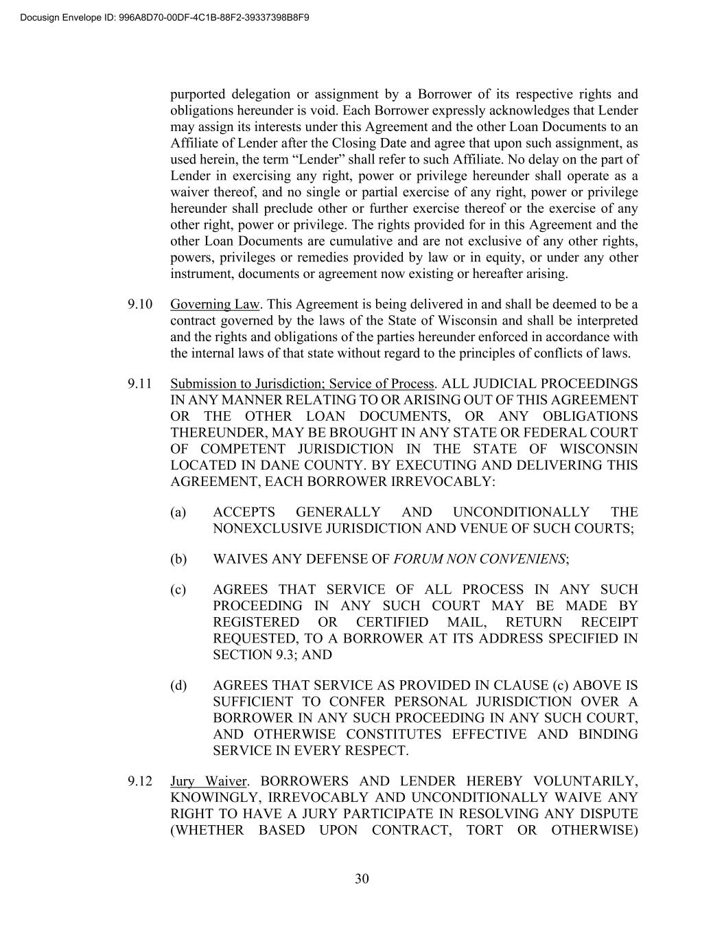 30 purported delegation or assignment by a Borrower of its respective rights and obligations hereunder is void. Each Borrower expressly acknowledges that Lender may assign its interests under this Agreement and the other Loan Documents to an Affiliate of Lender after the Closing Date and agree that upon such assignment, as used herein, the term “Lender” shall refer to such Affiliate. No delay on the part of Lender in exercising any right, power or privilege hereunder shall operate as a waiver thereof, and no single or partial exercise of any right, power or privilege hereunder shall preclude other or further exercise thereof or the exercise of any other right, power or privilege. The rights provided for in this Agreement and the other Loan Documents are cumulative and are not exclusive of any other rights, powers, privileges or remedies provided by law or in equity, or under any other instrument, documents or agreement now existing or hereafter arising. 9.10 Governing Law. This Agreement is being delivered in and shall be deemed to be a contract governed by the laws of the State of Wisconsin and shall be interpreted and the rights and obligations of the parties hereunder enforced in accordance with the internal laws of that state without regard to the principles of conflicts of laws. 9.11 Submission to Jurisdiction; Service of Process. ALL JUDICIAL PROCEEDINGS IN ANY MANNER RELATING TO OR ARISING OUT OF THIS AGREEMENT OR THE OTHER LOAN DOCUMENTS, OR ANY OBLIGATIONS THEREUNDER, MAY BE BROUGHT IN ANY STATE OR FEDERAL COURT OF COMPETENT JURISDICTION IN THE STATE OF WISCONSIN LOCATED IN DANE COUNTY. BY EXECUTING AND DELIVERING THIS AGREEMENT, EACH BORROWER IRREVOCABLY: (a) ACCEPTS GENERALLY AND UNCONDITIONALLY THE NONEXCLUSIVE JURISDICTION AND VENUE OF SUCH COURTS; (b) WAIVES ANY DEFENSE OF FORUM NON CONVENIENS; (c) AGREES THAT SERVICE OF ALL PROCESS IN ANY SUCH PROCEEDING IN ANY SUCH COURT MAY BE MADE BY REGISTERED OR CERTIFIED MAIL, RETURN RECEIPT REQUESTED, TO A BORROWER AT ITS ADDRESS SPECIFIED IN SECTION 9.3; AND (d) AGREES THAT SERVICE AS PROVIDED IN CLAUSE (c) ABOVE IS SUFFICIENT TO CONFER PERSONAL JURISDICTION OVER A BORROWER IN ANY SUCH PROCEEDING IN ANY SUCH COURT, AND OTHERWISE CONSTITUTES EFFECTIVE AND BINDING SERVICE IN EVERY RESPECT. 9.12 Jury Waiver. BORROWERS AND LENDER HEREBY VOLUNTARILY, KNOWINGLY, IRREVOCABLY AND UNCONDITIONALLY WAIVE ANY RIGHT TO HAVE A JURY PARTICIPATE IN RESOLVING ANY DISPUTE (WHETHER BASED UPON CONTRACT, TORT OR OTHERWISE) Docusign Envelope ID: 996A8D70-00DF-4C1B-88F2-39337398B8F9