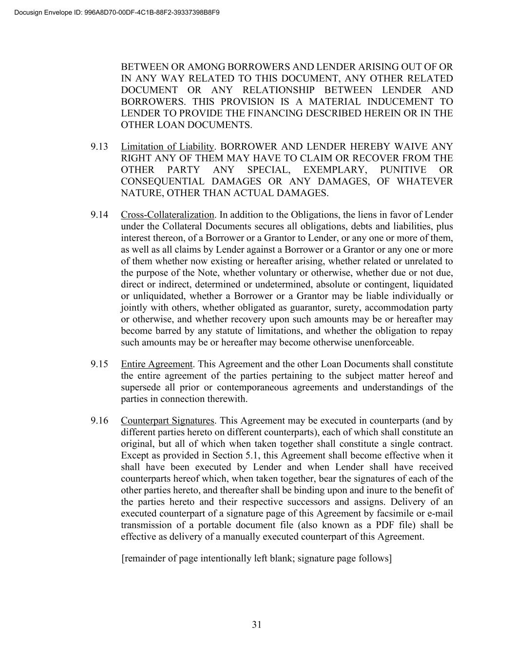 31 BETWEEN OR AMONG BORROWERS AND LENDER ARISING OUT OF OR IN ANY WAY RELATED TO THIS DOCUMENT, ANY OTHER RELATED DOCUMENT OR ANY RELATIONSHIP BETWEEN LENDER AND BORROWERS. THIS PROVISION IS A MATERIAL INDUCEMENT TO LENDER TO PROVIDE THE FINANCING DESCRIBED HEREIN OR IN THE OTHER LOAN DOCUMENTS. 9.13 Limitation of Liability. BORROWER AND LENDER HEREBY WAIVE ANY RIGHT ANY OF THEM MAY HAVE TO CLAIM OR RECOVER FROM THE OTHER PARTY ANY SPECIAL, EXEMPLARY, PUNITIVE OR CONSEQUENTIAL DAMAGES OR ANY DAMAGES, OF WHATEVER NATURE, OTHER THAN ACTUAL DAMAGES. 9.14 Cross-Collateralization. In addition to the Obligations, the liens in favor of Lender under the Collateral Documents secures all obligations, debts and liabilities, plus interest thereon, of a Borrower or a Grantor to Lender, or any one or more of them, as well as all claims by Lender against a Borrower or a Grantor or any one or more of them whether now existing or hereafter arising, whether related or unrelated to the purpose of the Note, whether voluntary or otherwise, whether due or not due, direct or indirect, determined or undetermined, absolute or contingent, liquidated or unliquidated, whether a Borrower or a Grantor may be liable individually or jointly with others, whether obligated as guarantor, surety, accommodation party or otherwise, and whether recovery upon such amounts may be or hereafter may become barred by any statute of limitations, and whether the obligation to repay such amounts may be or hereafter may become otherwise unenforceable. 9.15 Entire Agreement. This Agreement and the other Loan Documents shall constitute the entire agreement of the parties pertaining to the subject matter hereof and supersede all prior or contemporaneous agreements and understandings of the parties in connection therewith. 9.16 Counterpart Signatures. This Agreement may be executed in counterparts (and by different parties hereto on different counterparts), each of which shall constitute an original, but all of which when taken together shall constitute a single contract. Except as provided in Section 5.1, this Agreement shall become effective when it shall have been executed by Lender and when Lender shall have received counterparts hereof which, when taken together, bear the signatures of each of the other parties hereto, and thereafter shall be binding upon and inure to the benefit of the parties hereto and their respective successors and assigns. Delivery of an executed counterpart of a signature page of this Agreement by facsimile or e-mail transmission of a portable document file (also known as a PDF file) shall be effective as delivery of a manually executed counterpart of this Agreement. [remainder of page intentionally left blank; signature page follows] Docusign Envelope ID: 996A8D70-00DF-4C1B-88F2-39337398B8F9
