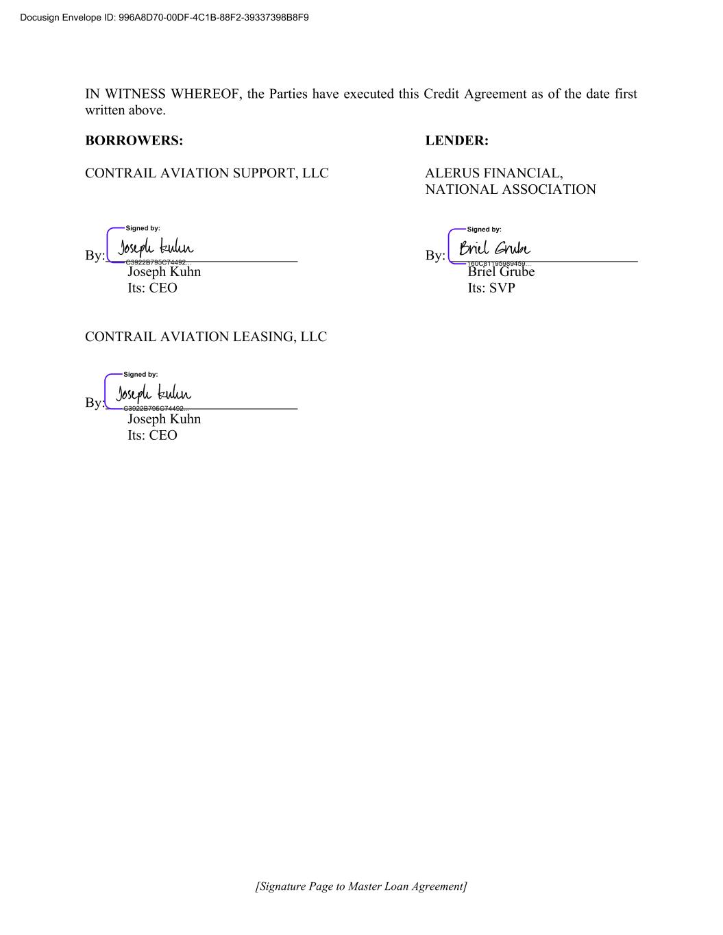 [Signature Page to Master Loan Agreement] IN WITNESS WHEREOF, the Parties have executed this Credit Agreement as of the date first written above. BORROWERS: LENDER: CONTRAIL AVIATION SUPPORT, LLC ALERUS FINANCIAL, NATIONAL ASSOCIATION By: By: Joseph Kuhn Briel Grube Its: CEO Its: SVP CONTRAIL AVIATION LEASING, LLC By: Joseph Kuhn Its: CEO Docusign Envelope ID: 996A8D70-00DF-4C1B-88F2-39337398B8F9