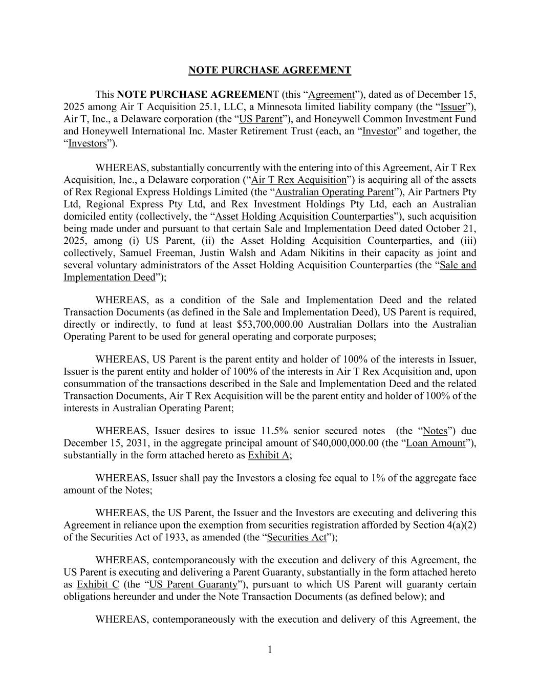 1 NOTE PURCHASE AGREEMENT This NOTE PURCHASE AGREEMENT (this “Agreement”), dated as of December 15, 2025 among Air T Acquisition 25.1, LLC, a Minnesota limited liability company (the “Issuer”), Air T, Inc., a Delaware corporation (the “US Parent”), and Honeywell Common Investment Fund and Honeywell International Inc. Master Retirement Trust (each, an “Investor” and together, the “Investors”). WHEREAS, substantially concurrently with the entering into of this Agreement, Air T Rex Acquisition, Inc., a Delaware corporation (“Air T Rex Acquisition”) is acquiring all of the assets of Rex Regional Express Holdings Limited (the “Australian Operating Parent”), Air Partners Pty Ltd, Regional Express Pty Ltd, and Rex Investment Holdings Pty Ltd, each an Australian domiciled entity (collectively, the “Asset Holding Acquisition Counterparties”), such acquisition being made under and pursuant to that certain Sale and Implementation Deed dated October 21, 2025, among (i) US Parent, (ii) the Asset Holding Acquisition Counterparties, and (iii) collectively, Samuel Freeman, Justin Walsh and Adam Nikitins in their capacity as joint and several voluntary administrators of the Asset Holding Acquisition Counterparties (the “Sale and Implementation Deed”); WHEREAS, as a condition of the Sale and Implementation Deed and the related Transaction Documents (as defined in the Sale and Implementation Deed), US Parent is required, directly or indirectly, to fund at least $53,700,000.00 Australian Dollars into the Australian Operating Parent to be used for general operating and corporate purposes; WHEREAS, US Parent is the parent entity and holder of 100% of the interests in Issuer, Issuer is the parent entity and holder of 100% of the interests in Air T Rex Acquisition and, upon consummation of the transactions described in the Sale and Implementation Deed and the related Transaction Documents, Air T Rex Acquisition will be the parent entity and holder of 100% of the interests in Australian Operating Parent; WHEREAS, Issuer desires to issue 11.5% senior secured notes (the “Notes”) due December 15, 2031, in the aggregate principal amount of $40,000,000.00 (the “Loan Amount”), substantially in the form attached hereto as Exhibit A; WHEREAS, Issuer shall pay the Investors a closing fee equal to 1% of the aggregate face amount of the Notes; WHEREAS, the US Parent, the Issuer and the Investors are executing and delivering this Agreement in reliance upon the exemption from securities registration afforded by Section 4(a)(2) of the Securities Act of 1933, as amended (the “Securities Act”); WHEREAS, contemporaneously with the execution and delivery of this Agreement, the US Parent is executing and delivering a Parent Guaranty, substantially in the form attached hereto as Exhibit C (the “US Parent Guaranty”), pursuant to which US Parent will guaranty certain obligations hereunder and under the Note Transaction Documents (as defined below); and WHEREAS, contemporaneously with the execution and delivery of this Agreement, the