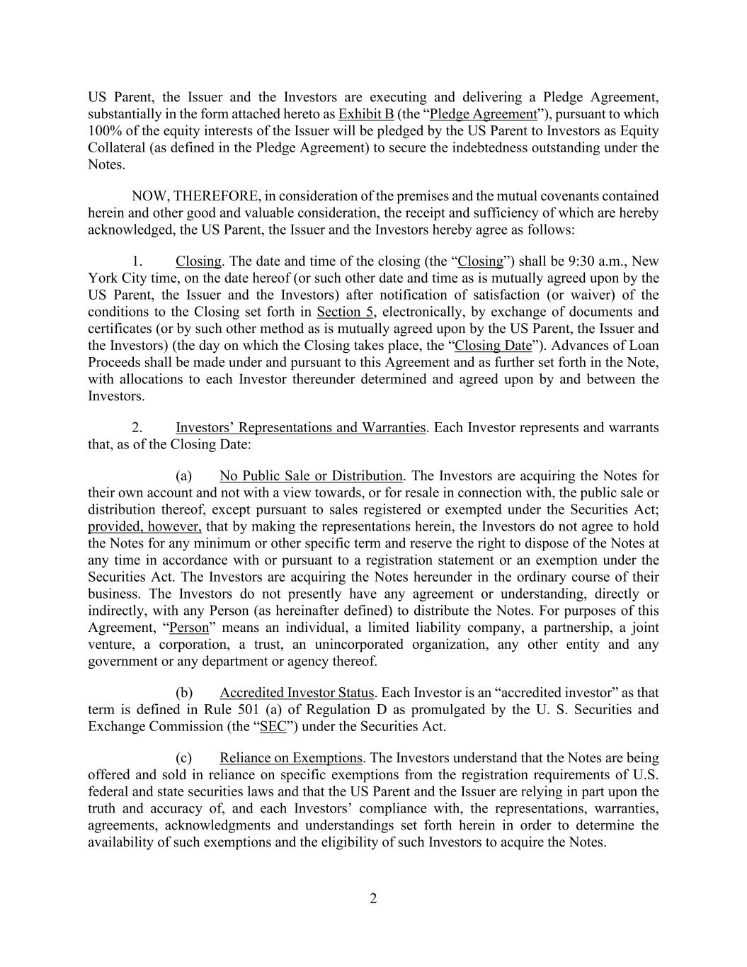 2 US Parent, the Issuer and the Investors are executing and delivering a Pledge Agreement, substantially in the form attached hereto as Exhibit B (the “Pledge Agreement”), pursuant to which 100% of the equity interests of the Issuer will be pledged by the US Parent to Investors as Equity Collateral (as defined in the Pledge Agreement) to secure the indebtedness outstanding under the Notes. NOW, THEREFORE, in consideration of the premises and the mutual covenants contained herein and other good and valuable consideration, the receipt and sufficiency of which are hereby acknowledged, the US Parent, the Issuer and the Investors hereby agree as follows: 1. Closing. The date and time of the closing (the “Closing”) shall be 9:30 a.m., New York City time, on the date hereof (or such other date and time as is mutually agreed upon by the US Parent, the Issuer and the Investors) after notification of satisfaction (or waiver) of the conditions to the Closing set forth in Section 5, electronically, by exchange of documents and certificates (or by such other method as is mutually agreed upon by the US Parent, the Issuer and the Investors) (the day on which the Closing takes place, the “Closing Date”). Advances of Loan Proceeds shall be made under and pursuant to this Agreement and as further set forth in the Note, with allocations to each Investor thereunder determined and agreed upon by and between the Investors. 2. Investors’ Representations and Warranties. Each Investor represents and warrants that, as of the Closing Date: (a) No Public Sale or Distribution. The Investors are acquiring the Notes for their own account and not with a view towards, or for resale in connection with, the public sale or distribution thereof, except pursuant to sales registered or exempted under the Securities Act; provided, however, that by making the representations herein, the Investors do not agree to hold the Notes for any minimum or other specific term and reserve the right to dispose of the Notes at any time in accordance with or pursuant to a registration statement or an exemption under the Securities Act. The Investors are acquiring the Notes hereunder in the ordinary course of their business. The Investors do not presently have any agreement or understanding, directly or indirectly, with any Person (as hereinafter defined) to distribute the Notes. For purposes of this Agreement, “Person” means an individual, a limited liability company, a partnership, a joint venture, a corporation, a trust, an unincorporated organization, any other entity and any government or any department or agency thereof. (b) Accredited Investor Status. Each Investor is an “accredited investor” as that term is defined in Rule 501 (a) of Regulation D as promulgated by the U. S. Securities and Exchange Commission (the “SEC”) under the Securities Act. (c) Reliance on Exemptions. The Investors understand that the Notes are being offered and sold in reliance on specific exemptions from the registration requirements of U.S. federal and state securities laws and that the US Parent and the Issuer are relying in part upon the truth and accuracy of, and each Investors’ compliance with, the representations, warranties, agreements, acknowledgments and understandings set forth herein in order to determine the availability of such exemptions and the eligibility of such Investors to acquire the Notes.