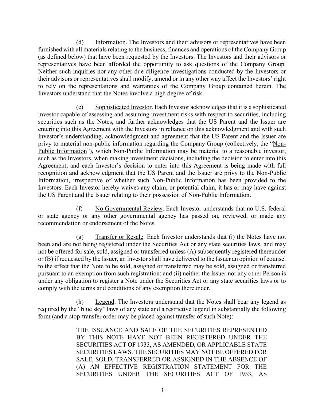 3 (d) Information. The Investors and their advisors or representatives have been furnished with all materials relating to the business, finances and operations of the Company Group (as defined below) that have been requested by the Investors. The Investors and their advisors or representatives have been afforded the opportunity to ask questions of the Company Group. Neither such inquiries nor any other due diligence investigations conducted by the Investors or their advisors or representatives shall modify, amend or in any other way affect the Investors’ right to rely on the representations and warranties of the Company Group contained herein. The Investors understand that the Notes involve a high degree of risk. (e) Sophisticated Investor. Each Investor acknowledges that it is a sophisticated investor capable of assessing and assuming investment risks with respect to securities, including securities such as the Notes, and further acknowledges that the US Parent and the Issuer are entering into this Agreement with the Investors in reliance on this acknowledgment and with such Investor’s understanding, acknowledgment and agreement that the US Parent and the Issuer are privy to material non-public information regarding the Company Group (collectively, the “Non- Public Information”), which Non-Public Information may be material to a reasonable investor, such as the Investors, when making investment decisions, including the decision to enter into this Agreement, and each Investor’s decision to enter into this Agreement is being made with full recognition and acknowledgment that the US Parent and the Issuer are privy to the Non-Public Information, irrespective of whether such Non-Public Information has been provided to the Investors. Each Investor hereby waives any claim, or potential claim, it has or may have against the US Parent and the Issuer relating to their possession of Non-Public Information. (f) No Governmental Review. Each Investor understands that no U.S. federal or state agency or any other governmental agency has passed on, reviewed, or made any recommendation or endorsement of the Notes. (g) Transfer or Resale. Each Investor understands that (i) the Notes have not been and are not being registered under the Securities Act or any state securities laws, and may not be offered for sale, sold, assigned or transferred unless (A) subsequently registered thereunder or (B) if requested by the Issuer, an Investor shall have delivered to the Issuer an opinion of counsel to the effect that the Note to be sold, assigned or transferred may be sold, assigned or transferred pursuant to an exemption from such registration; and (ii) neither the Issuer nor any other Person is under any obligation to register a Note under the Securities Act or any state securities laws or to comply with the terms and conditions of any exemption thereunder. (h) Legend. The Investors understand that the Notes shall bear any legend as required by the “blue sky” laws of any state and a restrictive legend in substantially the following form (and a stop-transfer order may be placed against transfer of such Note): THE ISSUANCE AND SALE OF THE SECURITIES REPRESENTED BY THIS NOTE HAVE NOT BEEN REGISTERED UNDER THE SECURITIES ACT OF 1933, AS AMENDED, OR APPLICABLE STATE SECURITIES LAWS. THE SECURITIES MAY NOT BE OFFERED FOR SALE, SOLD, TRANSFERRED OR ASSIGNED IN THE ABSENCE OF (A) AN EFFECTIVE REGISTRATION STATEMENT FOR THE SECURITIES UNDER THE SECURITIES ACT OF 1933, AS