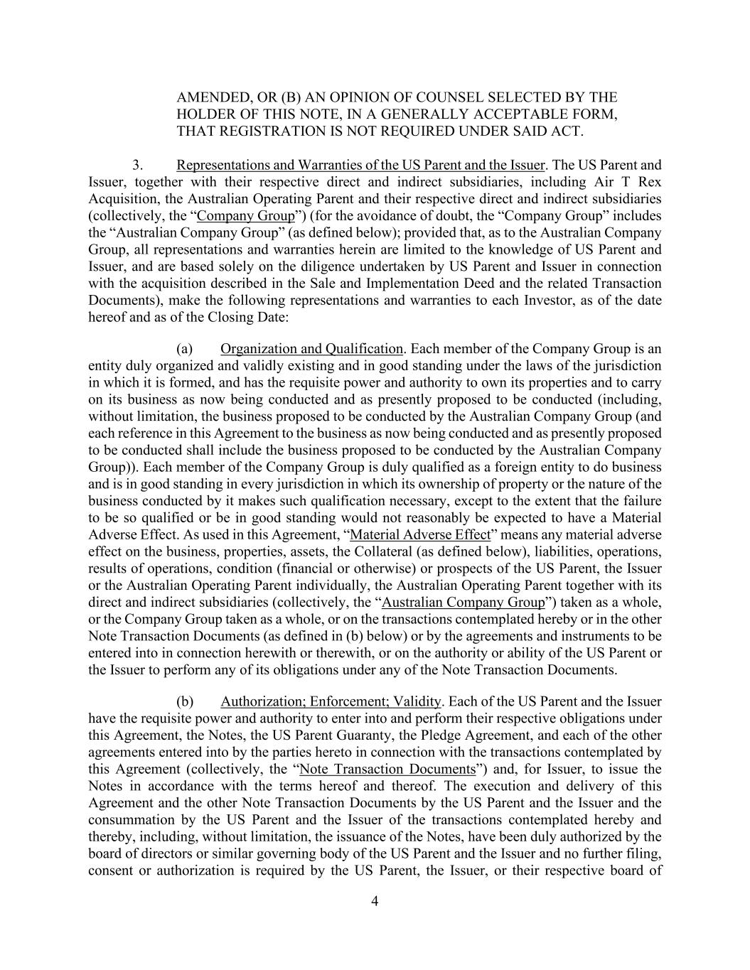 4 AMENDED, OR (B) AN OPINION OF COUNSEL SELECTED BY THE HOLDER OF THIS NOTE, IN A GENERALLY ACCEPTABLE FORM, THAT REGISTRATION IS NOT REQUIRED UNDER SAID ACT. 3. Representations and Warranties of the US Parent and the Issuer. The US Parent and Issuer, together with their respective direct and indirect subsidiaries, including Air T Rex Acquisition, the Australian Operating Parent and their respective direct and indirect subsidiaries (collectively, the “Company Group”) (for the avoidance of doubt, the “Company Group” includes the “Australian Company Group” (as defined below); provided that, as to the Australian Company Group, all representations and warranties herein are limited to the knowledge of US Parent and Issuer, and are based solely on the diligence undertaken by US Parent and Issuer in connection with the acquisition described in the Sale and Implementation Deed and the related Transaction Documents), make the following representations and warranties to each Investor, as of the date hereof and as of the Closing Date: (a) Organization and Qualification. Each member of the Company Group is an entity duly organized and validly existing and in good standing under the laws of the jurisdiction in which it is formed, and has the requisite power and authority to own its properties and to carry on its business as now being conducted and as presently proposed to be conducted (including, without limitation, the business proposed to be conducted by the Australian Company Group (and each reference in this Agreement to the business as now being conducted and as presently proposed to be conducted shall include the business proposed to be conducted by the Australian Company Group)). Each member of the Company Group is duly qualified as a foreign entity to do business and is in good standing in every jurisdiction in which its ownership of property or the nature of the business conducted by it makes such qualification necessary, except to the extent that the failure to be so qualified or be in good standing would not reasonably be expected to have a Material Adverse Effect. As used in this Agreement, “Material Adverse Effect” means any material adverse effect on the business, properties, assets, the Collateral (as defined below), liabilities, operations, results of operations, condition (financial or otherwise) or prospects of the US Parent, the Issuer or the Australian Operating Parent individually, the Australian Operating Parent together with its direct and indirect subsidiaries (collectively, the “Australian Company Group”) taken as a whole, or the Company Group taken as a whole, or on the transactions contemplated hereby or in the other Note Transaction Documents (as defined in (b) below) or by the agreements and instruments to be entered into in connection herewith or therewith, or on the authority or ability of the US Parent or the Issuer to perform any of its obligations under any of the Note Transaction Documents. (b) Authorization; Enforcement; Validity. Each of the US Parent and the Issuer have the requisite power and authority to enter into and perform their respective obligations under this Agreement, the Notes, the US Parent Guaranty, the Pledge Agreement, and each of the other agreements entered into by the parties hereto in connection with the transactions contemplated by this Agreement (collectively, the “Note Transaction Documents”) and, for Issuer, to issue the Notes in accordance with the terms hereof and thereof. The execution and delivery of this Agreement and the other Note Transaction Documents by the US Parent and the Issuer and the consummation by the US Parent and the Issuer of the transactions contemplated hereby and thereby, including, without limitation, the issuance of the Notes, have been duly authorized by the board of directors or similar governing body of the US Parent and the Issuer and no further filing, consent or authorization is required by the US Parent, the Issuer, or their respective board of