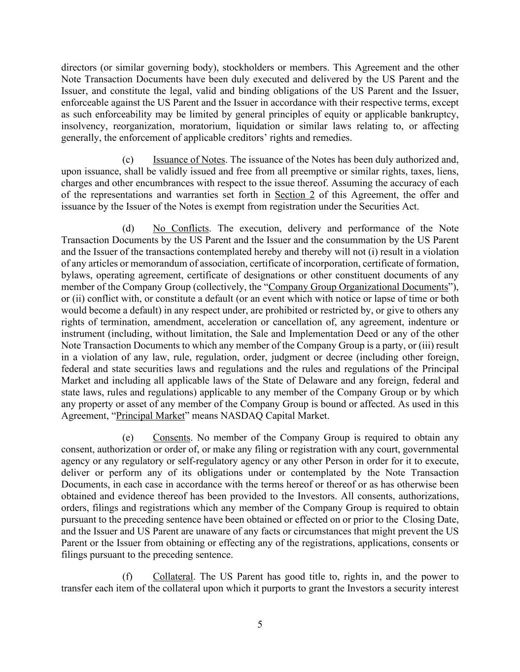 5 directors (or similar governing body), stockholders or members. This Agreement and the other Note Transaction Documents have been duly executed and delivered by the US Parent and the Issuer, and constitute the legal, valid and binding obligations of the US Parent and the Issuer, enforceable against the US Parent and the Issuer in accordance with their respective terms, except as such enforceability may be limited by general principles of equity or applicable bankruptcy, insolvency, reorganization, moratorium, liquidation or similar laws relating to, or affecting generally, the enforcement of applicable creditors’ rights and remedies. (c) Issuance of Notes. The issuance of the Notes has been duly authorized and, upon issuance, shall be validly issued and free from all preemptive or similar rights, taxes, liens, charges and other encumbrances with respect to the issue thereof. Assuming the accuracy of each of the representations and warranties set forth in Section 2 of this Agreement, the offer and issuance by the Issuer of the Notes is exempt from registration under the Securities Act. (d) No Conflicts. The execution, delivery and performance of the Note Transaction Documents by the US Parent and the Issuer and the consummation by the US Parent and the Issuer of the transactions contemplated hereby and thereby will not (i) result in a violation of any articles or memorandum of association, certificate of incorporation, certificate of formation, bylaws, operating agreement, certificate of designations or other constituent documents of any member of the Company Group (collectively, the “Company Group Organizational Documents”), or (ii) conflict with, or constitute a default (or an event which with notice or lapse of time or both would become a default) in any respect under, are prohibited or restricted by, or give to others any rights of termination, amendment, acceleration or cancellation of, any agreement, indenture or instrument (including, without limitation, the Sale and Implementation Deed or any of the other Note Transaction Documents to which any member of the Company Group is a party, or (iii) result in a violation of any law, rule, regulation, order, judgment or decree (including other foreign, federal and state securities laws and regulations and the rules and regulations of the Principal Market and including all applicable laws of the State of Delaware and any foreign, federal and state laws, rules and regulations) applicable to any member of the Company Group or by which any property or asset of any member of the Company Group is bound or affected. As used in this Agreement, “Principal Market” means NASDAQ Capital Market. (e) Consents. No member of the Company Group is required to obtain any consent, authorization or order of, or make any filing or registration with any court, governmental agency or any regulatory or self-regulatory agency or any other Person in order for it to execute, deliver or perform any of its obligations under or contemplated by the Note Transaction Documents, in each case in accordance with the terms hereof or thereof or as has otherwise been obtained and evidence thereof has been provided to the Investors. All consents, authorizations, orders, filings and registrations which any member of the Company Group is required to obtain pursuant to the preceding sentence have been obtained or effected on or prior to the Closing Date, and the Issuer and US Parent are unaware of any facts or circumstances that might prevent the US Parent or the Issuer from obtaining or effecting any of the registrations, applications, consents or filings pursuant to the preceding sentence. (f) Collateral. The US Parent has good title to, rights in, and the power to transfer each item of the collateral upon which it purports to grant the Investors a security interest