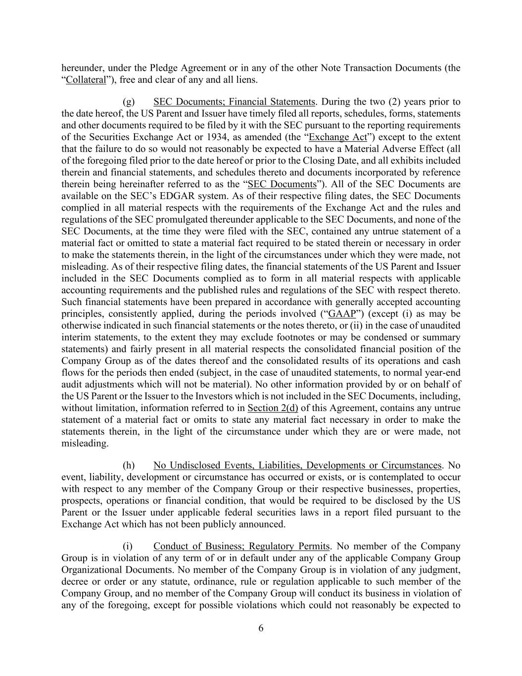 6 hereunder, under the Pledge Agreement or in any of the other Note Transaction Documents (the “Collateral”), free and clear of any and all liens. (g) SEC Documents; Financial Statements. During the two (2) years prior to the date hereof, the US Parent and Issuer have timely filed all reports, schedules, forms, statements and other documents required to be filed by it with the SEC pursuant to the reporting requirements of the Securities Exchange Act or 1934, as amended (the “Exchange Act”) except to the extent that the failure to do so would not reasonably be expected to have a Material Adverse Effect (all of the foregoing filed prior to the date hereof or prior to the Closing Date, and all exhibits included therein and financial statements, and schedules thereto and documents incorporated by reference therein being hereinafter referred to as the “SEC Documents”). All of the SEC Documents are available on the SEC’s EDGAR system. As of their respective filing dates, the SEC Documents complied in all material respects with the requirements of the Exchange Act and the rules and regulations of the SEC promulgated thereunder applicable to the SEC Documents, and none of the SEC Documents, at the time they were filed with the SEC, contained any untrue statement of a material fact or omitted to state a material fact required to be stated therein or necessary in order to make the statements therein, in the light of the circumstances under which they were made, not misleading. As of their respective filing dates, the financial statements of the US Parent and Issuer included in the SEC Documents complied as to form in all material respects with applicable accounting requirements and the published rules and regulations of the SEC with respect thereto. Such financial statements have been prepared in accordance with generally accepted accounting principles, consistently applied, during the periods involved (“GAAP”) (except (i) as may be otherwise indicated in such financial statements or the notes thereto, or (ii) in the case of unaudited interim statements, to the extent they may exclude footnotes or may be condensed or summary statements) and fairly present in all material respects the consolidated financial position of the Company Group as of the dates thereof and the consolidated results of its operations and cash flows for the periods then ended (subject, in the case of unaudited statements, to normal year-end audit adjustments which will not be material). No other information provided by or on behalf of the US Parent or the Issuer to the Investors which is not included in the SEC Documents, including, without limitation, information referred to in Section 2(d) of this Agreement, contains any untrue statement of a material fact or omits to state any material fact necessary in order to make the statements therein, in the light of the circumstance under which they are or were made, not misleading. (h) No Undisclosed Events, Liabilities, Developments or Circumstances. No event, liability, development or circumstance has occurred or exists, or is contemplated to occur with respect to any member of the Company Group or their respective businesses, properties, prospects, operations or financial condition, that would be required to be disclosed by the US Parent or the Issuer under applicable federal securities laws in a report filed pursuant to the Exchange Act which has not been publicly announced. (i) Conduct of Business; Regulatory Permits. No member of the Company Group is in violation of any term of or in default under any of the applicable Company Group Organizational Documents. No member of the Company Group is in violation of any judgment, decree or order or any statute, ordinance, rule or regulation applicable to such member of the Company Group, and no member of the Company Group will conduct its business in violation of any of the foregoing, except for possible violations which could not reasonably be expected to