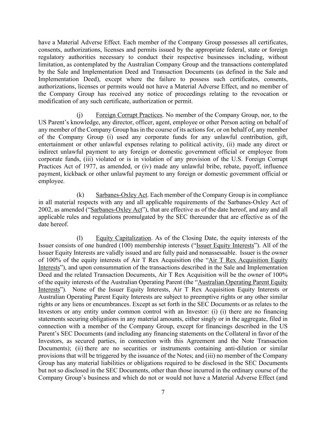 7 have a Material Adverse Effect. Each member of the Company Group possesses all certificates, consents, authorizations, licenses and permits issued by the appropriate federal, state or foreign regulatory authorities necessary to conduct their respective businesses including, without limitation, as contemplated by the Australian Company Group and the transactions contemplated by the Sale and Implementation Deed and Transaction Documents (as defined in the Sale and Implementation Deed), except where the failure to possess such certificates, consents, authorizations, licenses or permits would not have a Material Adverse Effect, and no member of the Company Group has received any notice of proceedings relating to the revocation or modification of any such certificate, authorization or permit. (j) Foreign Corrupt Practices. No member of the Company Group, nor, to the US Parent’s knowledge, any director, officer, agent, employee or other Person acting on behalf of any member of the Company Group has in the course of its actions for, or on behalf of, any member of the Company Group (i) used any corporate funds for any unlawful contribution, gift, entertainment or other unlawful expenses relating to political activity, (ii) made any direct or indirect unlawful payment to any foreign or domestic government official or employee from corporate funds, (iii) violated or is in violation of any provision of the U.S. Foreign Corrupt Practices Act of 1977, as amended, or (iv) made any unlawful bribe, rebate, payoff, influence payment, kickback or other unlawful payment to any foreign or domestic government official or employee. (k) Sarbanes-Oxley Act. Each member of the Company Group is in compliance in all material respects with any and all applicable requirements of the Sarbanes-Oxley Act of 2002, as amended (“Sarbanes-Oxley Act”), that are effective as of the date hereof, and any and all applicable rules and regulations promulgated by the SEC thereunder that are effective as of the date hereof. (l) Equity Capitalization. As of the Closing Date, the equity interests of the Issuer consists of one hundred (100) membership interests (“Issuer Equity Interests”). All of the Issuer Equity Interests are validly issued and are fully paid and nonassessable. Issuer is the owner of 100% of the equity interests of Air T Rex Acquisition (the “Air T Rex Acquisition Equity Interests”), and upon consummation of the transactions described in the Sale and Implementation Deed and the related Transaction Documents, Air T Rex Acquisition will be the owner of 100% of the equity interests of the Australian Operating Parent (the “Australian Operating Parent Equity Interests”). None of the Issuer Equity Interests, Air T Rex Acquisition Equity Interests or Australian Operating Parent Equity Interests are subject to preemptive rights or any other similar rights or any liens or encumbrances. Except as set forth in the SEC Documents or as relates to the Investors or any entity under common control with an Investor: (i) (i) there are no financing statements securing obligations in any material amounts, either singly or in the aggregate, filed in connection with a member of the Company Group, except for financings described in the US Parent’s SEC Documents (and including any financing statements on the Collateral in favor of the Investors, as secured parties, in connection with this Agreement and the Note Transaction Documents); (ii) there are no securities or instruments containing anti-dilution or similar provisions that will be triggered by the issuance of the Notes; and (iii) no member of the Company Group has any material liabilities or obligations required to be disclosed in the SEC Documents but not so disclosed in the SEC Documents, other than those incurred in the ordinary course of the Company Group’s business and which do not or would not have a Material Adverse Effect (and