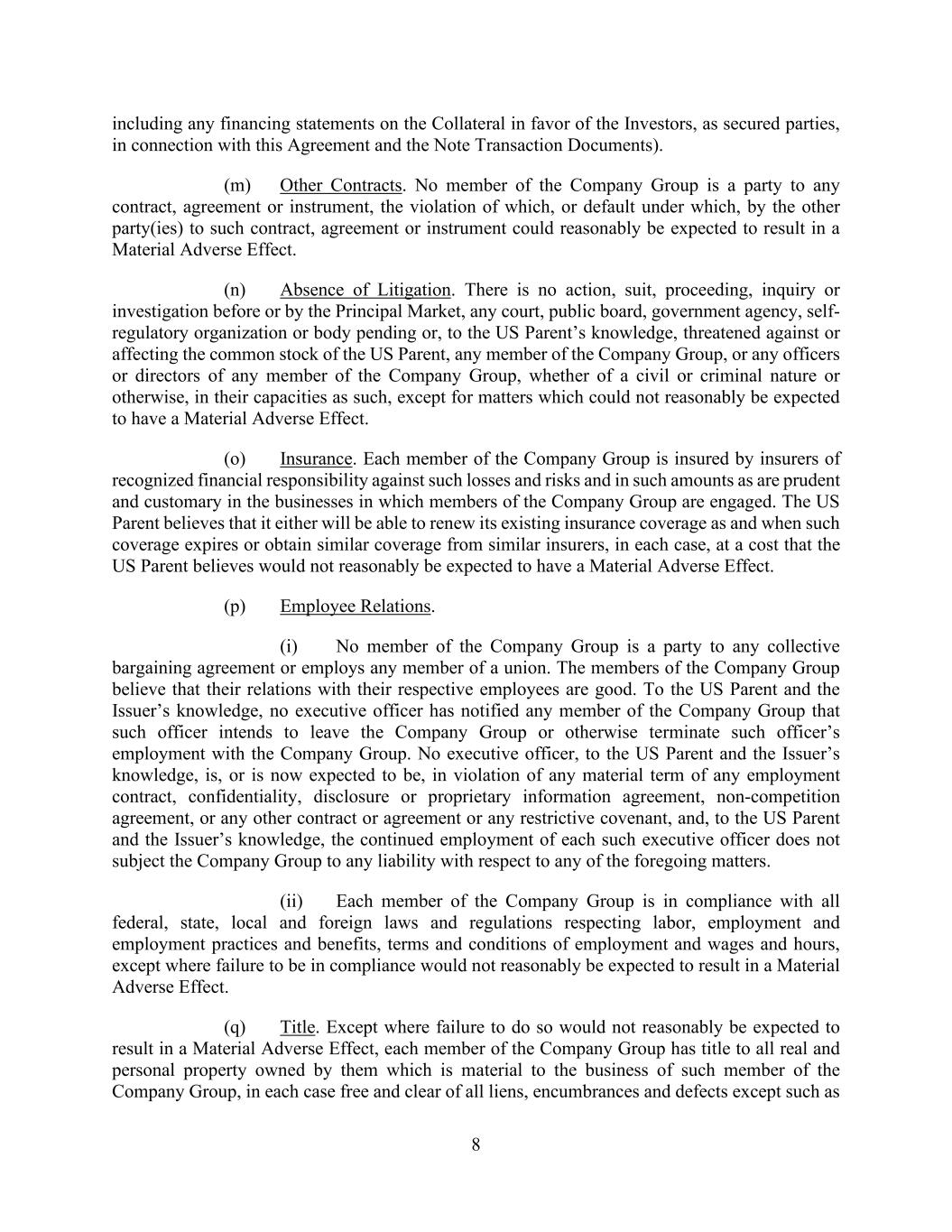 8 including any financing statements on the Collateral in favor of the Investors, as secured parties, in connection with this Agreement and the Note Transaction Documents). (m) Other Contracts. No member of the Company Group is a party to any contract, agreement or instrument, the violation of which, or default under which, by the other party(ies) to such contract, agreement or instrument could reasonably be expected to result in a Material Adverse Effect. (n) Absence of Litigation. There is no action, suit, proceeding, inquiry or investigation before or by the Principal Market, any court, public board, government agency, self- regulatory organization or body pending or, to the US Parent’s knowledge, threatened against or affecting the common stock of the US Parent, any member of the Company Group, or any officers or directors of any member of the Company Group, whether of a civil or criminal nature or otherwise, in their capacities as such, except for matters which could not reasonably be expected to have a Material Adverse Effect. (o) Insurance. Each member of the Company Group is insured by insurers of recognized financial responsibility against such losses and risks and in such amounts as are prudent and customary in the businesses in which members of the Company Group are engaged. The US Parent believes that it either will be able to renew its existing insurance coverage as and when such coverage expires or obtain similar coverage from similar insurers, in each case, at a cost that the US Parent believes would not reasonably be expected to have a Material Adverse Effect. (p) Employee Relations. (i) No member of the Company Group is a party to any collective bargaining agreement or employs any member of a union. The members of the Company Group believe that their relations with their respective employees are good. To the US Parent and the Issuer’s knowledge, no executive officer has notified any member of the Company Group that such officer intends to leave the Company Group or otherwise terminate such officer’s employment with the Company Group. No executive officer, to the US Parent and the Issuer’s knowledge, is, or is now expected to be, in violation of any material term of any employment contract, confidentiality, disclosure or proprietary information agreement, non-competition agreement, or any other contract or agreement or any restrictive covenant, and, to the US Parent and the Issuer’s knowledge, the continued employment of each such executive officer does not subject the Company Group to any liability with respect to any of the foregoing matters. (ii) Each member of the Company Group is in compliance with all federal, state, local and foreign laws and regulations respecting labor, employment and employment practices and benefits, terms and conditions of employment and wages and hours, except where failure to be in compliance would not reasonably be expected to result in a Material Adverse Effect. (q) Title. Except where failure to do so would not reasonably be expected to result in a Material Adverse Effect, each member of the Company Group has title to all real and personal property owned by them which is material to the business of such member of the Company Group, in each case free and clear of all liens, encumbrances and defects except such as