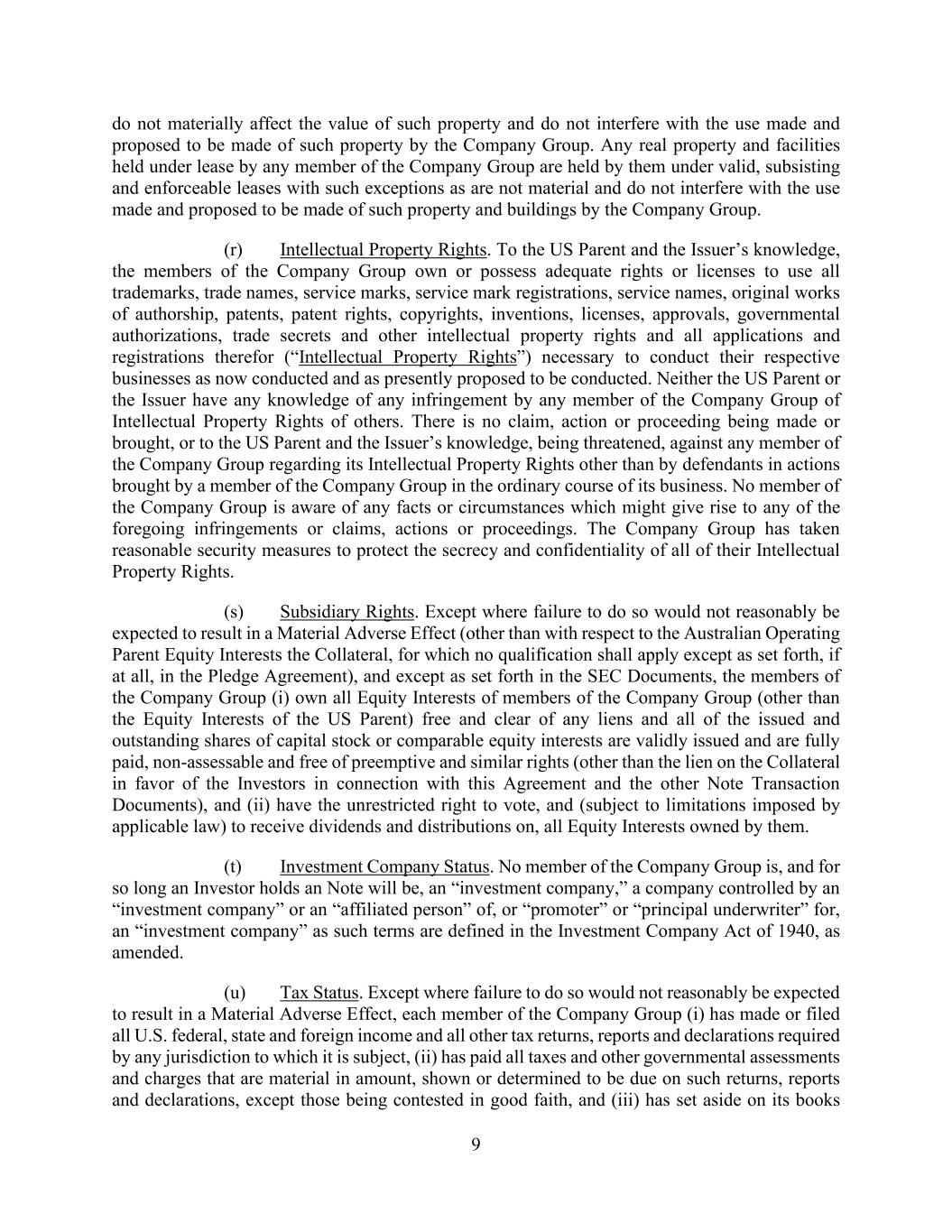 9 do not materially affect the value of such property and do not interfere with the use made and proposed to be made of such property by the Company Group. Any real property and facilities held under lease by any member of the Company Group are held by them under valid, subsisting and enforceable leases with such exceptions as are not material and do not interfere with the use made and proposed to be made of such property and buildings by the Company Group. (r) Intellectual Property Rights. To the US Parent and the Issuer’s knowledge, the members of the Company Group own or possess adequate rights or licenses to use all trademarks, trade names, service marks, service mark registrations, service names, original works of authorship, patents, patent rights, copyrights, inventions, licenses, approvals, governmental authorizations, trade secrets and other intellectual property rights and all applications and registrations therefor (“Intellectual Property Rights”) necessary to conduct their respective businesses as now conducted and as presently proposed to be conducted. Neither the US Parent or the Issuer have any knowledge of any infringement by any member of the Company Group of Intellectual Property Rights of others. There is no claim, action or proceeding being made or brought, or to the US Parent and the Issuer’s knowledge, being threatened, against any member of the Company Group regarding its Intellectual Property Rights other than by defendants in actions brought by a member of the Company Group in the ordinary course of its business. No member of the Company Group is aware of any facts or circumstances which might give rise to any of the foregoing infringements or claims, actions or proceedings. The Company Group has taken reasonable security measures to protect the secrecy and confidentiality of all of their Intellectual Property Rights. (s) Subsidiary Rights. Except where failure to do so would not reasonably be expected to result in a Material Adverse Effect (other than with respect to the Australian Operating Parent Equity Interests the Collateral, for which no qualification shall apply except as set forth, if at all, in the Pledge Agreement), and except as set forth in the SEC Documents, the members of the Company Group (i) own all Equity Interests of members of the Company Group (other than the Equity Interests of the US Parent) free and clear of any liens and all of the issued and outstanding shares of capital stock or comparable equity interests are validly issued and are fully paid, non-assessable and free of preemptive and similar rights (other than the lien on the Collateral in favor of the Investors in connection with this Agreement and the other Note Transaction Documents), and (ii) have the unrestricted right to vote, and (subject to limitations imposed by applicable law) to receive dividends and distributions on, all Equity Interests owned by them. (t) Investment Company Status. No member of the Company Group is, and for so long an Investor holds an Note will be, an “investment company,” a company controlled by an “investment company” or an “affiliated person” of, or “promoter” or “principal underwriter” for, an “investment company” as such terms are defined in the Investment Company Act of 1940, as amended. (u) Tax Status. Except where failure to do so would not reasonably be expected to result in a Material Adverse Effect, each member of the Company Group (i) has made or filed all U.S. federal, state and foreign income and all other tax returns, reports and declarations required by any jurisdiction to which it is subject, (ii) has paid all taxes and other governmental assessments and charges that are material in amount, shown or determined to be due on such returns, reports and declarations, except those being contested in good faith, and (iii) has set aside on its books