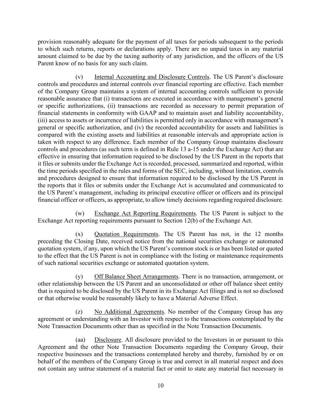 10 provision reasonably adequate for the payment of all taxes for periods subsequent to the periods to which such returns, reports or declarations apply. There are no unpaid taxes in any material amount claimed to be due by the taxing authority of any jurisdiction, and the officers of the US Parent know of no basis for any such claim. (v) Internal Accounting and Disclosure Controls. The US Parent’s disclosure controls and procedures and internal controls over financial reporting are effective. Each member of the Company Group maintains a system of internal accounting controls sufficient to provide reasonable assurance that (i) transactions are executed in accordance with management’s general or specific authorizations, (ii) transactions are recorded as necessary to permit preparation of financial statements in conformity with GAAP and to maintain asset and liability accountability, (iii) access to assets or incurrence of liabilities is permitted only in accordance with management’s general or specific authorization, and (iv) the recorded accountability for assets and liabilities is compared with the existing assets and liabilities at reasonable intervals and appropriate action is taken with respect to any difference. Each member of the Company Group maintains disclosure controls and procedures (as such term is defined in Rule 13 a-15 under the Exchange Act) that are effective in ensuring that information required to be disclosed by the US Parent in the reports that it files or submits under the Exchange Act is recorded, processed, summarized and reported, within the time periods specified in the rules and forms of the SEC, including, without limitation, controls and procedures designed to ensure that information required to be disclosed by the US Parent in the reports that it files or submits under the Exchange Act is accumulated and communicated to the US Parent’s management, including its principal executive officer or officers and its principal financial officer or officers, as appropriate, to allow timely decisions regarding required disclosure. (w) Exchange Act Reporting Requirements. The US Parent is subject to the Exchange Act reporting requirements pursuant to Section 12(b) of the Exchange Act. (x) Quotation Requirements. The US Parent has not, in the 12 months preceding the Closing Date, received notice from the national securities exchange or automated quotation system, if any, upon which the US Parent’s common stock is or has been listed or quoted to the effect that the US Parent is not in compliance with the listing or maintenance requirements of such national securities exchange or automated quotation system. (y) Off Balance Sheet Arrangements. There is no transaction, arrangement, or other relationship between the US Parent and an unconsolidated or other off balance sheet entity that is required to be disclosed by the US Parent in its Exchange Act filings and is not so disclosed or that otherwise would be reasonably likely to have a Material Adverse Effect. (z) No Additional Agreements. No member of the Company Group has any agreement or understanding with an Investor with respect to the transactions contemplated by the Note Transaction Documents other than as specified in the Note Transaction Documents. (aa) Disclosure. All disclosure provided to the Investors in or pursuant to this Agreement and the other Note Transaction Documents regarding the Company Group, their respective businesses and the transactions contemplated hereby and thereby, furnished by or on behalf of the members of the Company Group is true and correct in all material respect and does not contain any untrue statement of a material fact or omit to state any material fact necessary in