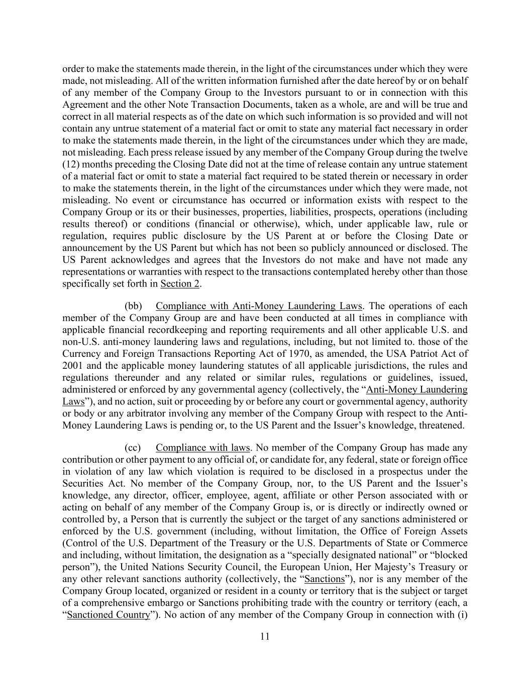 11 order to make the statements made therein, in the light of the circumstances under which they were made, not misleading. All of the written information furnished after the date hereof by or on behalf of any member of the Company Group to the Investors pursuant to or in connection with this Agreement and the other Note Transaction Documents, taken as a whole, are and will be true and correct in all material respects as of the date on which such information is so provided and will not contain any untrue statement of a material fact or omit to state any material fact necessary in order to make the statements made therein, in the light of the circumstances under which they are made, not misleading. Each press release issued by any member of the Company Group during the twelve (12) months preceding the Closing Date did not at the time of release contain any untrue statement of a material fact or omit to state a material fact required to be stated therein or necessary in order to make the statements therein, in the light of the circumstances under which they were made, not misleading. No event or circumstance has occurred or information exists with respect to the Company Group or its or their businesses, properties, liabilities, prospects, operations (including results thereof) or conditions (financial or otherwise), which, under applicable law, rule or regulation, requires public disclosure by the US Parent at or before the Closing Date or announcement by the US Parent but which has not been so publicly announced or disclosed. The US Parent acknowledges and agrees that the Investors do not make and have not made any representations or warranties with respect to the transactions contemplated hereby other than those specifically set forth in Section 2. (bb) Compliance with Anti-Money Laundering Laws. The operations of each member of the Company Group are and have been conducted at all times in compliance with applicable financial recordkeeping and reporting requirements and all other applicable U.S. and non-U.S. anti-money laundering laws and regulations, including, but not limited to. those of the Currency and Foreign Transactions Reporting Act of 1970, as amended, the USA Patriot Act of 2001 and the applicable money laundering statutes of all applicable jurisdictions, the rules and regulations thereunder and any related or similar rules, regulations or guidelines, issued, administered or enforced by any governmental agency (collectively, the “Anti-Money Laundering Laws”), and no action, suit or proceeding by or before any court or governmental agency, authority or body or any arbitrator involving any member of the Company Group with respect to the Anti- Money Laundering Laws is pending or, to the US Parent and the Issuer’s knowledge, threatened. (cc) Compliance with laws. No member of the Company Group has made any contribution or other payment to any official of, or candidate for, any federal, state or foreign office in violation of any law which violation is required to be disclosed in a prospectus under the Securities Act. No member of the Company Group, nor, to the US Parent and the Issuer’s knowledge, any director, officer, employee, agent, affiliate or other Person associated with or acting on behalf of any member of the Company Group is, or is directly or indirectly owned or controlled by, a Person that is currently the subject or the target of any sanctions administered or enforced by the U.S. government (including, without limitation, the Office of Foreign Assets (Control of the U.S. Department of the Treasury or the U.S. Departments of State or Commerce and including, without limitation, the designation as a “specially designated national” or “blocked person”), the United Nations Security Council, the European Union, Her Majesty’s Treasury or any other relevant sanctions authority (collectively, the “Sanctions”), nor is any member of the Company Group located, organized or resident in a county or territory that is the subject or target of a comprehensive embargo or Sanctions prohibiting trade with the country or territory (each, a “Sanctioned Country”). No action of any member of the Company Group in connection with (i)