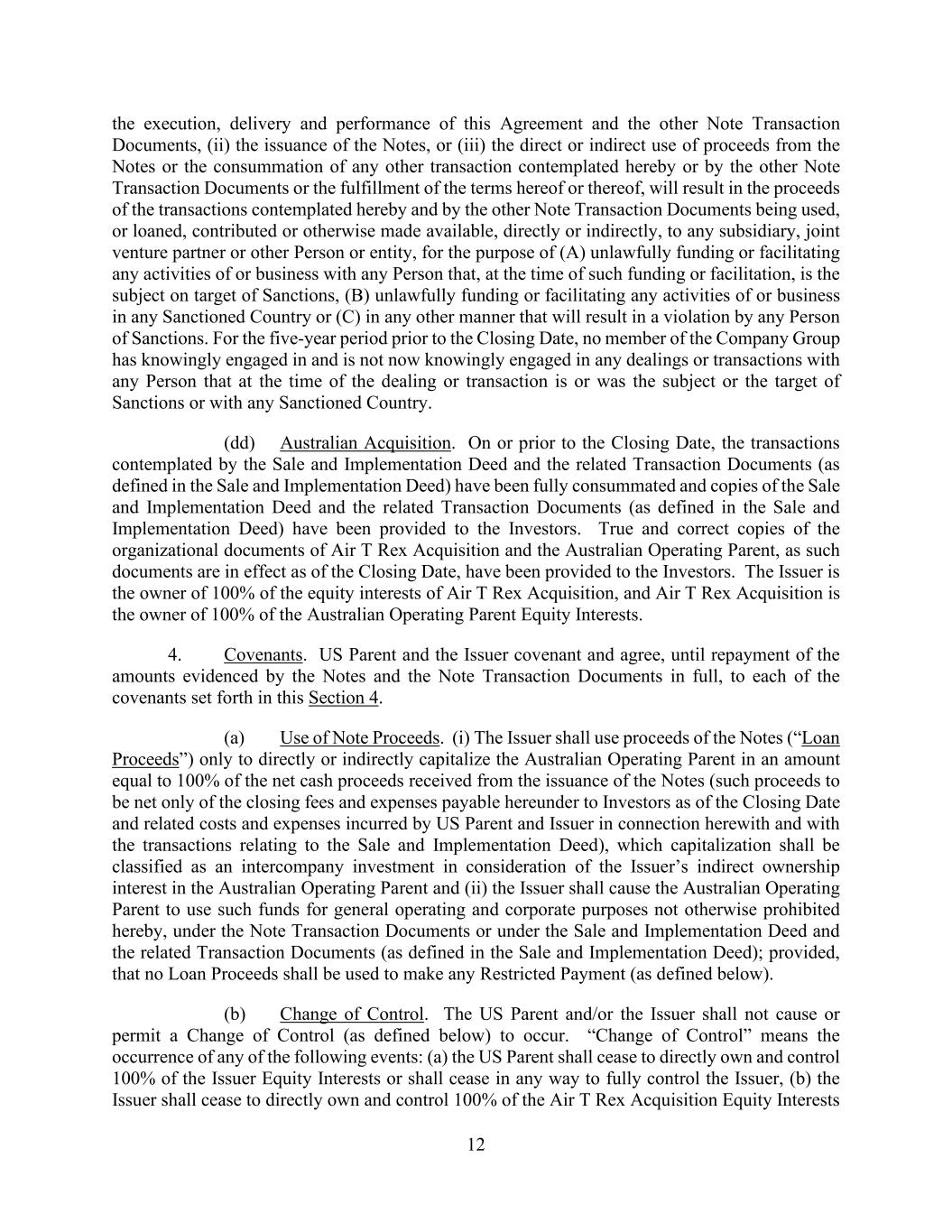 12 the execution, delivery and performance of this Agreement and the other Note Transaction Documents, (ii) the issuance of the Notes, or (iii) the direct or indirect use of proceeds from the Notes or the consummation of any other transaction contemplated hereby or by the other Note Transaction Documents or the fulfillment of the terms hereof or thereof, will result in the proceeds of the transactions contemplated hereby and by the other Note Transaction Documents being used, or loaned, contributed or otherwise made available, directly or indirectly, to any subsidiary, joint venture partner or other Person or entity, for the purpose of (A) unlawfully funding or facilitating any activities of or business with any Person that, at the time of such funding or facilitation, is the subject on target of Sanctions, (B) unlawfully funding or facilitating any activities of or business in any Sanctioned Country or (C) in any other manner that will result in a violation by any Person of Sanctions. For the five-year period prior to the Closing Date, no member of the Company Group has knowingly engaged in and is not now knowingly engaged in any dealings or transactions with any Person that at the time of the dealing or transaction is or was the subject or the target of Sanctions or with any Sanctioned Country. (dd) Australian Acquisition. On or prior to the Closing Date, the transactions contemplated by the Sale and Implementation Deed and the related Transaction Documents (as defined in the Sale and Implementation Deed) have been fully consummated and copies of the Sale and Implementation Deed and the related Transaction Documents (as defined in the Sale and Implementation Deed) have been provided to the Investors. True and correct copies of the organizational documents of Air T Rex Acquisition and the Australian Operating Parent, as such documents are in effect as of the Closing Date, have been provided to the Investors. The Issuer is the owner of 100% of the equity interests of Air T Rex Acquisition, and Air T Rex Acquisition is the owner of 100% of the Australian Operating Parent Equity Interests. 4. Covenants. US Parent and the Issuer covenant and agree, until repayment of the amounts evidenced by the Notes and the Note Transaction Documents in full, to each of the covenants set forth in this Section 4. (a) Use of Note Proceeds. (i) The Issuer shall use proceeds of the Notes (“Loan Proceeds”) only to directly or indirectly capitalize the Australian Operating Parent in an amount equal to 100% of the net cash proceeds received from the issuance of the Notes (such proceeds to be net only of the closing fees and expenses payable hereunder to Investors as of the Closing Date and related costs and expenses incurred by US Parent and Issuer in connection herewith and with the transactions relating to the Sale and Implementation Deed), which capitalization shall be classified as an intercompany investment in consideration of the Issuer’s indirect ownership interest in the Australian Operating Parent and (ii) the Issuer shall cause the Australian Operating Parent to use such funds for general operating and corporate purposes not otherwise prohibited hereby, under the Note Transaction Documents or under the Sale and Implementation Deed and the related Transaction Documents (as defined in the Sale and Implementation Deed); provided, that no Loan Proceeds shall be used to make any Restricted Payment (as defined below). (b) Change of Control. The US Parent and/or the Issuer shall not cause or permit a Change of Control (as defined below) to occur. “Change of Control” means the occurrence of any of the following events: (a) the US Parent shall cease to directly own and control 100% of the Issuer Equity Interests or shall cease in any way to fully control the Issuer, (b) the Issuer shall cease to directly own and control 100% of the Air T Rex Acquisition Equity Interests