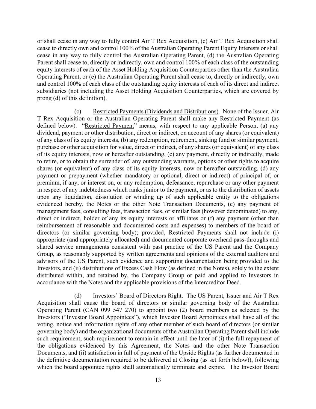 13 or shall cease in any way to fully control Air T Rex Acquisition, (c) Air T Rex Acquisition shall cease to directly own and control 100% of the Australian Operating Parent Equity Interests or shall cease in any way to fully control the Australian Operating Parent, (d) the Australian Operating Parent shall cease to, directly or indirectly, own and control 100% of each class of the outstanding equity interests of each of the Asset Holding Acquisition Counterparties other than the Australian Operating Parent, or (e) the Australian Operating Parent shall cease to, directly or indirectly, own and control 100% of each class of the outstanding equity interests of each of its direct and indirect subsidiaries (not including the Asset Holding Acquisition Counterparties, which are covered by prong (d) of this definition). (c) Restricted Payments (Dividends and Distributions). None of the Issuer, Air T Rex Acquisition or the Australian Operating Parent shall make any Restricted Payment (as defined below). “Restricted Payment” means, with respect to any applicable Person, (a) any dividend, payment or other distribution, direct or indirect, on account of any shares (or equivalent) of any class of its equity interests, (b) any redemption, retirement, sinking fund or similar payment, purchase or other acquisition for value, direct or indirect, of any shares (or equivalent) of any class of its equity interests, now or hereafter outstanding, (c) any payment, directly or indirectly, made to retire, or to obtain the surrender of, any outstanding warrants, options or other rights to acquire shares (or equivalent) of any class of its equity interests, now or hereafter outstanding, (d) any payment or prepayment (whether mandatory or optional, direct or indirect) of principal of, or premium, if any, or interest on, or any redemption, defeasance, repurchase or any other payment in respect of any indebtedness which ranks junior to the payment, or as to the distribution of assets upon any liquidation, dissolution or winding up of such applicable entity to the obligations evidenced hereby, the Notes or the other Note Transaction Documents, (e) any payment of management fees, consulting fees, transaction fees, or similar fees (however denominated) to any, direct or indirect, holder of any its equity interests or affiliates or (f) any payment (other than reimbursement of reasonable and documented costs and expenses) to members of the board of directors (or similar governing body); provided, Restricted Payments shall not include (i) appropriate (and appropriately allocated) and documented corporate overhead pass-throughs and shared service arrangements consistent with past practice of the US Parent and the Company Group, as reasonably supported by written agreements and opinions of the external auditors and advisors of the US Parent, such evidence and supporting documentation being provided to the Investors, and (ii) distributions of Excess Cash Flow (as defined in the Notes), solely to the extent distributed within, and retained by, the Company Group or paid and applied to Investors in accordance with the Notes and the applicable provisions of the Intercreditor Deed. (d) Investors’ Board of Directors Right. The US Parent, Issuer and Air T Rex Acquisition shall cause the board of directors or similar governing body of the Australian Operating Parent (CAN 099 547 270) to appoint two (2) board members as selected by the Investors (“Investor Board Appointees”), which Investor Board Appointees shall have all of the voting, notice and information rights of any other member of such board of directors (or similar governing body) and the organizational documents of the Australian Operating Parent shall include such requirement, such requirement to remain in effect until the later of (i) the full repayment of the obligations evidenced by this Agreement, the Notes and the other Note Transaction Documents, and (ii) satisfaction in full of payment of the Upside Rights (as further documented in the definitive documentation required to be delivered at Closing (as set forth below)), following which the board appointee rights shall automatically terminate and expire. The Investor Board