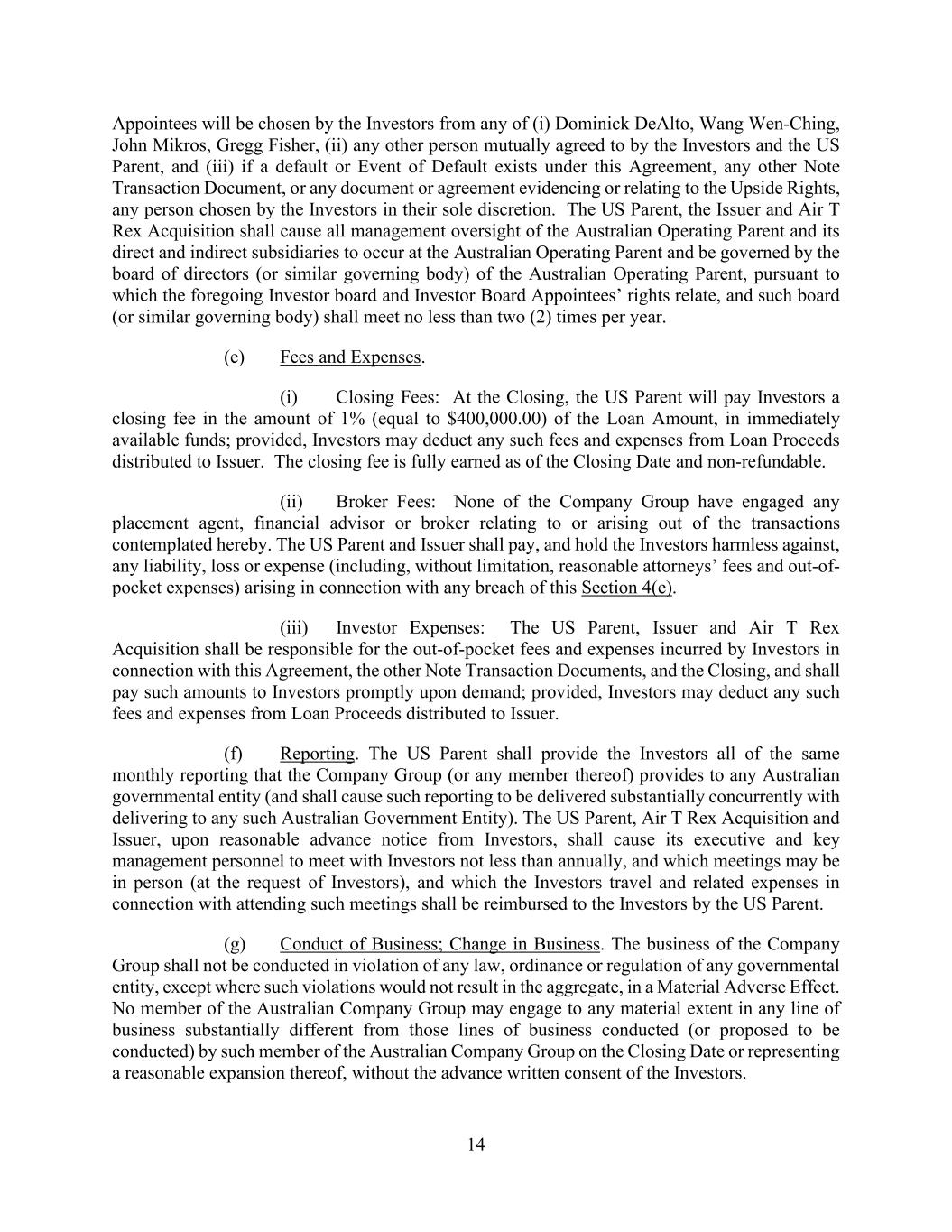 14 Appointees will be chosen by the Investors from any of (i) Dominick DeAlto, Wang Wen-Ching, John Mikros, Gregg Fisher, (ii) any other person mutually agreed to by the Investors and the US Parent, and (iii) if a default or Event of Default exists under this Agreement, any other Note Transaction Document, or any document or agreement evidencing or relating to the Upside Rights, any person chosen by the Investors in their sole discretion. The US Parent, the Issuer and Air T Rex Acquisition shall cause all management oversight of the Australian Operating Parent and its direct and indirect subsidiaries to occur at the Australian Operating Parent and be governed by the board of directors (or similar governing body) of the Australian Operating Parent, pursuant to which the foregoing Investor board and Investor Board Appointees’ rights relate, and such board (or similar governing body) shall meet no less than two (2) times per year. (e) Fees and Expenses. (i) Closing Fees: At the Closing, the US Parent will pay Investors a closing fee in the amount of 1% (equal to $400,000.00) of the Loan Amount, in immediately available funds; provided, Investors may deduct any such fees and expenses from Loan Proceeds distributed to Issuer. The closing fee is fully earned as of the Closing Date and non-refundable. (ii) Broker Fees: None of the Company Group have engaged any placement agent, financial advisor or broker relating to or arising out of the transactions contemplated hereby. The US Parent and Issuer shall pay, and hold the Investors harmless against, any liability, loss or expense (including, without limitation, reasonable attorneys’ fees and out-of- pocket expenses) arising in connection with any breach of this Section 4(e). (iii) Investor Expenses: The US Parent, Issuer and Air T Rex Acquisition shall be responsible for the out-of-pocket fees and expenses incurred by Investors in connection with this Agreement, the other Note Transaction Documents, and the Closing, and shall pay such amounts to Investors promptly upon demand; provided, Investors may deduct any such fees and expenses from Loan Proceeds distributed to Issuer. (f) Reporting. The US Parent shall provide the Investors all of the same monthly reporting that the Company Group (or any member thereof) provides to any Australian governmental entity (and shall cause such reporting to be delivered substantially concurrently with delivering to any such Australian Government Entity). The US Parent, Air T Rex Acquisition and Issuer, upon reasonable advance notice from Investors, shall cause its executive and key management personnel to meet with Investors not less than annually, and which meetings may be in person (at the request of Investors), and which the Investors travel and related expenses in connection with attending such meetings shall be reimbursed to the Investors by the US Parent. (g) Conduct of Business; Change in Business. The business of the Company Group shall not be conducted in violation of any law, ordinance or regulation of any governmental entity, except where such violations would not result in the aggregate, in a Material Adverse Effect. No member of the Australian Company Group may engage to any material extent in any line of business substantially different from those lines of business conducted (or proposed to be conducted) by such member of the Australian Company Group on the Closing Date or representing a reasonable expansion thereof, without the advance written consent of the Investors.