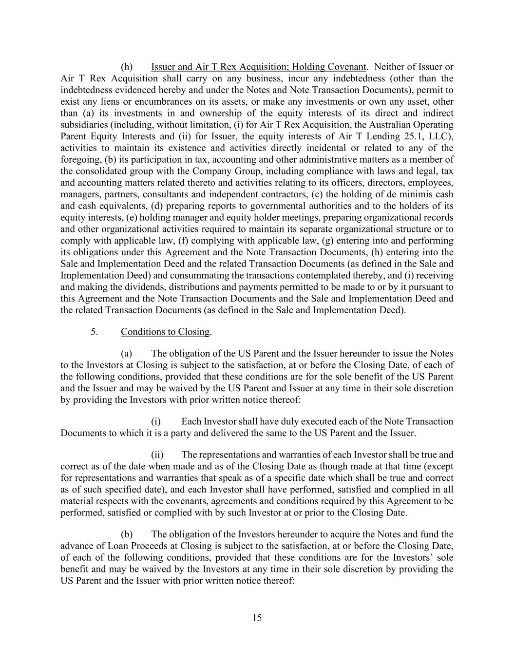 15 (h) Issuer and Air T Rex Acquisition; Holding Covenant. Neither of Issuer or Air T Rex Acquisition shall carry on any business, incur any indebtedness (other than the indebtedness evidenced hereby and under the Notes and Note Transaction Documents), permit to exist any liens or encumbrances on its assets, or make any investments or own any asset, other than (a) its investments in and ownership of the equity interests of its direct and indirect subsidiaries (including, without limitation, (i) for Air T Rex Acquisition, the Australian Operating Parent Equity Interests and (ii) for Issuer, the equity interests of Air T Lending 25.1, LLC), activities to maintain its existence and activities directly incidental or related to any of the foregoing, (b) its participation in tax, accounting and other administrative matters as a member of the consolidated group with the Company Group, including compliance with laws and legal, tax and accounting matters related thereto and activities relating to its officers, directors, employees, managers, partners, consultants and independent contractors, (c) the holding of de minimis cash and cash equivalents, (d) preparing reports to governmental authorities and to the holders of its equity interests, (e) holding manager and equity holder meetings, preparing organizational records and other organizational activities required to maintain its separate organizational structure or to comply with applicable law, (f) complying with applicable law, (g) entering into and performing its obligations under this Agreement and the Note Transaction Documents, (h) entering into the Sale and Implementation Deed and the related Transaction Documents (as defined in the Sale and Implementation Deed) and consummating the transactions contemplated thereby, and (i) receiving and making the dividends, distributions and payments permitted to be made to or by it pursuant to this Agreement and the Note Transaction Documents and the Sale and Implementation Deed and the related Transaction Documents (as defined in the Sale and Implementation Deed). 5. Conditions to Closing. (a) The obligation of the US Parent and the Issuer hereunder to issue the Notes to the Investors at Closing is subject to the satisfaction, at or before the Closing Date, of each of the following conditions, provided that these conditions are for the sole benefit of the US Parent and the Issuer and may be waived by the US Parent and Issuer at any time in their sole discretion by providing the Investors with prior written notice thereof: (i) Each Investor shall have duly executed each of the Note Transaction Documents to which it is a party and delivered the same to the US Parent and the Issuer. (ii) The representations and warranties of each Investor shall be true and correct as of the date when made and as of the Closing Date as though made at that time (except for representations and warranties that speak as of a specific date which shall be true and correct as of such specified date), and each Investor shall have performed, satisfied and complied in all material respects with the covenants, agreements and conditions required by this Agreement to be performed, satisfied or complied with by such Investor at or prior to the Closing Date. (b) The obligation of the Investors hereunder to acquire the Notes and fund the advance of Loan Proceeds at Closing is subject to the satisfaction, at or before the Closing Date, of each of the following conditions, provided that these conditions are for the Investors’ sole benefit and may be waived by the Investors at any time in their sole discretion by providing the US Parent and the Issuer with prior written notice thereof: