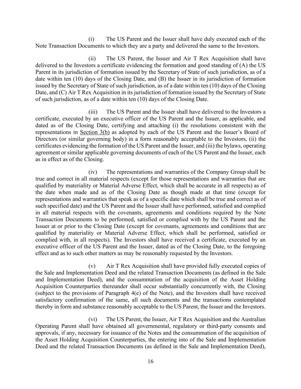 16 (i) The US Parent and the Issuer shall have duly executed each of the Note Transaction Documents to which they are a party and delivered the same to the Investors. (ii) The US Parent, the Issuer and Air T Rex Acquisition shall have delivered to the Investors a certificate evidencing the formation and good standing of (A) the US Parent in its jurisdiction of formation issued by the Secretary of State of such jurisdiction, as of a date within ten (10) days of the Closing Date, and (B) the Issuer in its jurisdiction of formation issued by the Secretary of State of such jurisdiction, as of a date within ten (10) days of the Closing Date, and (C) Air T Rex Acquisition in its jurisdiction of formation issued by the Secretary of State of such jurisdiction, as of a date within ten (10) days of the Closing Date. (iii) The US Parent and the Issuer shall have delivered to the Investors a certificate, executed by an executive officer of the US Parent and the Issuer, as applicable, and dated as of the Closing Date, certifying and attaching (i) the resolutions consistent with the representations in Section 3(b) as adopted by each of the US Parent and the Issuer’s Board of Directors (or similar governing body) in a form reasonably acceptable to the Investors, (ii) the certificates evidencing the formation of the US Parent and the Issuer, and (iii) the bylaws, operating agreement or similar applicable governing documents of each of the US Parent and the Issuer, each as in effect as of the Closing. (iv) The representations and warranties of the Company Group shall be true and correct in all material respects (except for those representations and warranties that are qualified by materiality or Material Adverse Effect, which shall be accurate in all respects) as of the date when made and as of the Closing Date as though made at that time (except for representations and warranties that speak as of a specific date which shall be true and correct as of such specified date) and the US Parent and the Issuer shall have performed, satisfied and complied in all material respects with the covenants, agreements and conditions required by the Note Transaction Documents to be performed, satisfied or complied with by the US Parent and the Issuer at or prior to the Closing Date (except for covenants, agreements and conditions that are qualified by materiality or Material Adverse Effect, which shall be performed, satisfied or complied with, in all respects). The Investors shall have received a certificate, executed by an executive officer of the US Parent and the Issuer, dated as of the Closing Date, to the foregoing effect and as to such other matters as may be reasonably requested by the Investors. (v) Air T Rex Acquisition shall have provided fully executed copies of the Sale and Implementation Deed and the related Transaction Documents (as defined in the Sale and Implementation Deed), and the consummation of the acquisition of the Asset Holding Acquisition Counterparties thereunder shall occur substantially concurrently with, the Closing (subject to the provisions of Paragraph 4(e) of the Note), and the Investors shall have received satisfactory confirmation of the same, all such documents and the transactions contemplated thereby in form and substance reasonably acceptable to the US Parent, the Issuer and the Investors. (vi) The US Parent, the Issuer, Air T Rex Acquisition and the Australian Operating Parent shall have obtained all governmental, regulatory or third-party consents and approvals, if any, necessary for issuance of the Notes and the consummation of the acquisition of the Asset Holding Acquisition Counterparties, the entering into of the Sale and Implementation Deed and the related Transaction Documents (as defined in the Sale and Implementation Deed),