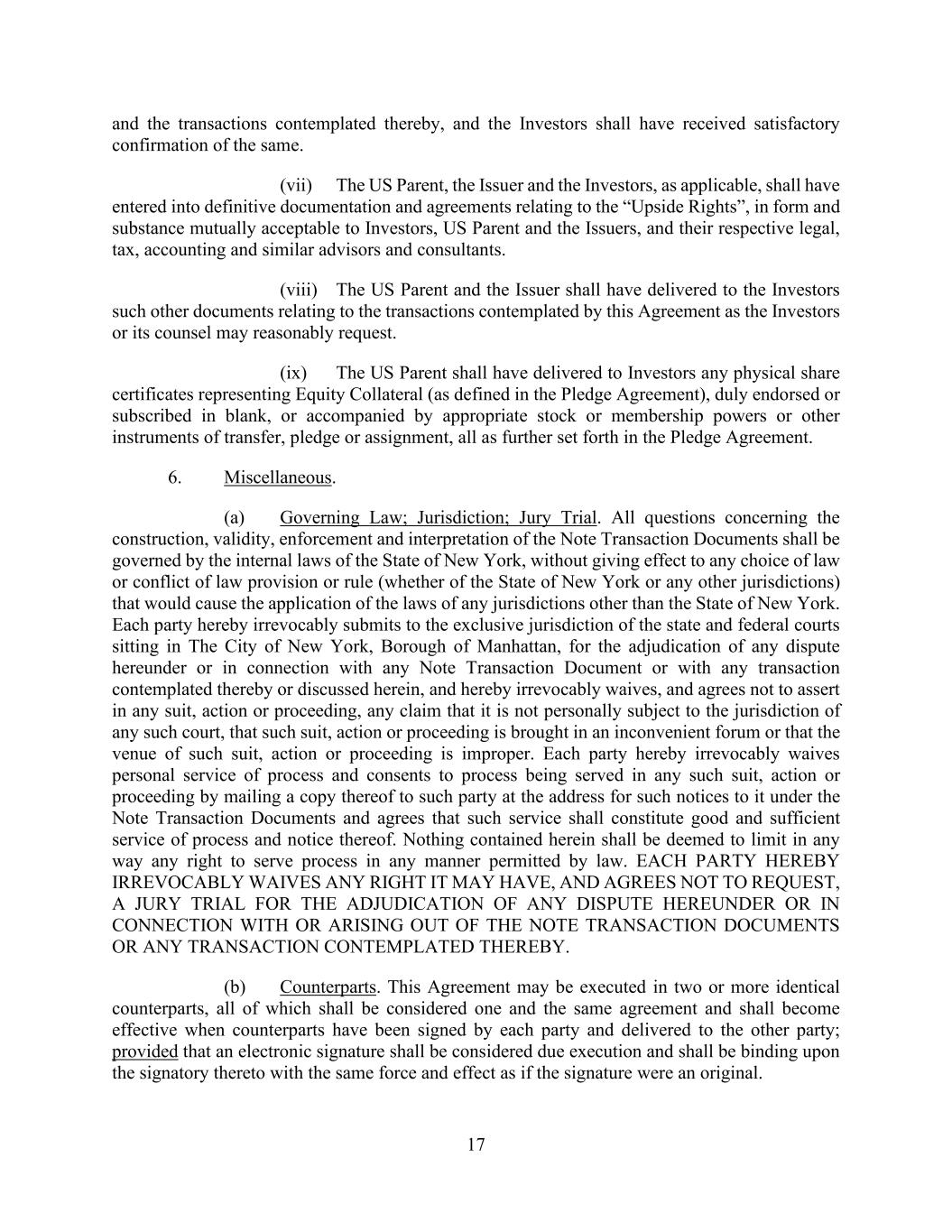 17 and the transactions contemplated thereby, and the Investors shall have received satisfactory confirmation of the same. (vii) The US Parent, the Issuer and the Investors, as applicable, shall have entered into definitive documentation and agreements relating to the “Upside Rights”, in form and substance mutually acceptable to Investors, US Parent and the Issuers, and their respective legal, tax, accounting and similar advisors and consultants. (viii) The US Parent and the Issuer shall have delivered to the Investors such other documents relating to the transactions contemplated by this Agreement as the Investors or its counsel may reasonably request. (ix) The US Parent shall have delivered to Investors any physical share certificates representing Equity Collateral (as defined in the Pledge Agreement), duly endorsed or subscribed in blank, or accompanied by appropriate stock or membership powers or other instruments of transfer, pledge or assignment, all as further set forth in the Pledge Agreement. 6. Miscellaneous. (a) Governing Law; Jurisdiction; Jury Trial. All questions concerning the construction, validity, enforcement and interpretation of the Note Transaction Documents shall be governed by the internal laws of the State of New York, without giving effect to any choice of law or conflict of law provision or rule (whether of the State of New York or any other jurisdictions) that would cause the application of the laws of any jurisdictions other than the State of New York. Each party hereby irrevocably submits to the exclusive jurisdiction of the state and federal courts sitting in The City of New York, Borough of Manhattan, for the adjudication of any dispute hereunder or in connection with any Note Transaction Document or with any transaction contemplated thereby or discussed herein, and hereby irrevocably waives, and agrees not to assert in any suit, action or proceeding, any claim that it is not personally subject to the jurisdiction of any such court, that such suit, action or proceeding is brought in an inconvenient forum or that the venue of such suit, action or proceeding is improper. Each party hereby irrevocably waives personal service of process and consents to process being served in any such suit, action or proceeding by mailing a copy thereof to such party at the address for such notices to it under the Note Transaction Documents and agrees that such service shall constitute good and sufficient service of process and notice thereof. Nothing contained herein shall be deemed to limit in any way any right to serve process in any manner permitted by law. EACH PARTY HEREBY IRREVOCABLY WAIVES ANY RIGHT IT MAY HAVE, AND AGREES NOT TO REQUEST, A JURY TRIAL FOR THE ADJUDICATION OF ANY DISPUTE HEREUNDER OR IN CONNECTION WITH OR ARISING OUT OF THE NOTE TRANSACTION DOCUMENTS OR ANY TRANSACTION CONTEMPLATED THEREBY. (b) Counterparts. This Agreement may be executed in two or more identical counterparts, all of which shall be considered one and the same agreement and shall become effective when counterparts have been signed by each party and delivered to the other party; provided that an electronic signature shall be considered due execution and shall be binding upon the signatory thereto with the same force and effect as if the signature were an original.