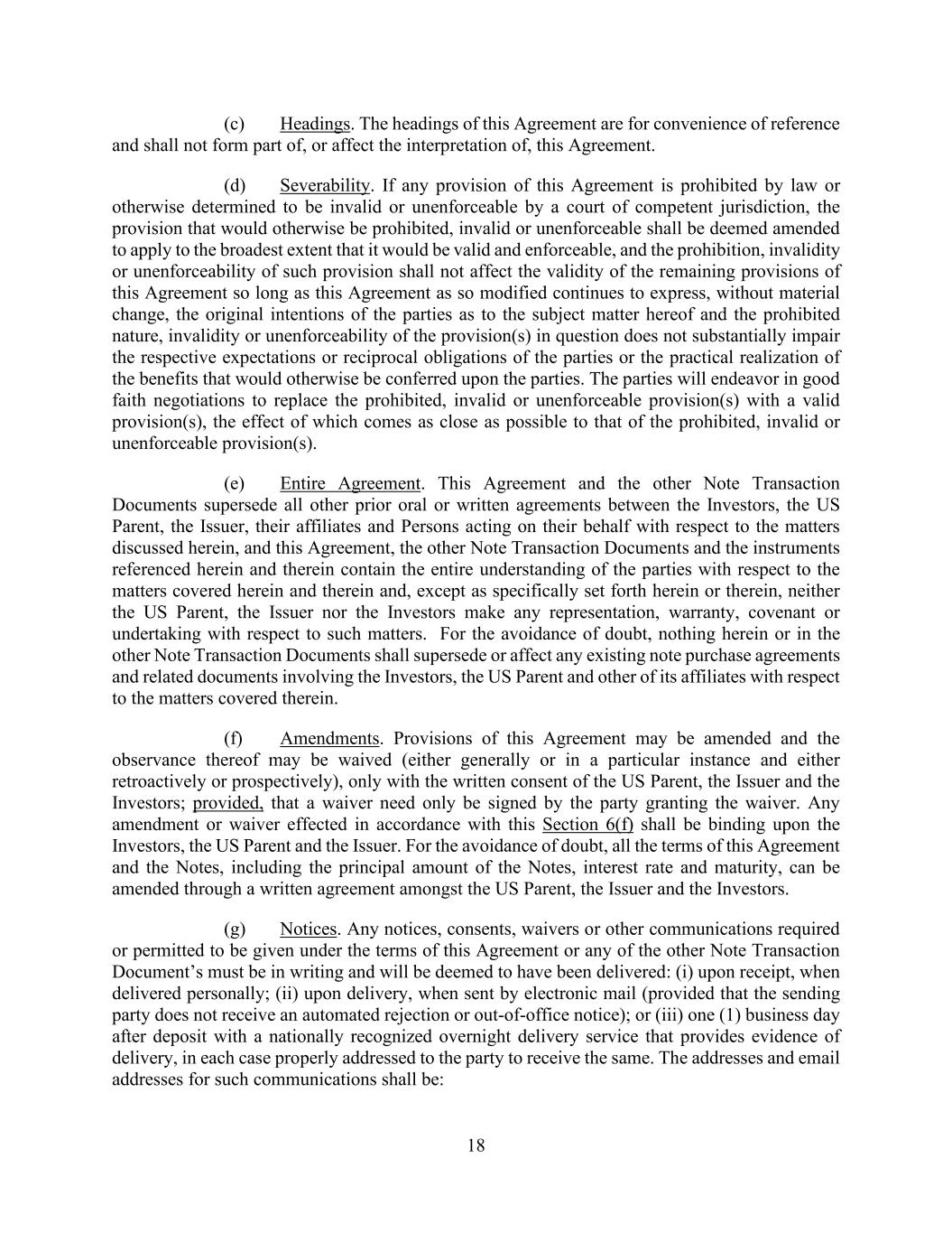 18 (c) Headings. The headings of this Agreement are for convenience of reference and shall not form part of, or affect the interpretation of, this Agreement. (d) Severability. If any provision of this Agreement is prohibited by law or otherwise determined to be invalid or unenforceable by a court of competent jurisdiction, the provision that would otherwise be prohibited, invalid or unenforceable shall be deemed amended to apply to the broadest extent that it would be valid and enforceable, and the prohibition, invalidity or unenforceability of such provision shall not affect the validity of the remaining provisions of this Agreement so long as this Agreement as so modified continues to express, without material change, the original intentions of the parties as to the subject matter hereof and the prohibited nature, invalidity or unenforceability of the provision(s) in question does not substantially impair the respective expectations or reciprocal obligations of the parties or the practical realization of the benefits that would otherwise be conferred upon the parties. The parties will endeavor in good faith negotiations to replace the prohibited, invalid or unenforceable provision(s) with a valid provision(s), the effect of which comes as close as possible to that of the prohibited, invalid or unenforceable provision(s). (e) Entire Agreement. This Agreement and the other Note Transaction Documents supersede all other prior oral or written agreements between the Investors, the US Parent, the Issuer, their affiliates and Persons acting on their behalf with respect to the matters discussed herein, and this Agreement, the other Note Transaction Documents and the instruments referenced herein and therein contain the entire understanding of the parties with respect to the matters covered herein and therein and, except as specifically set forth herein or therein, neither the US Parent, the Issuer nor the Investors make any representation, warranty, covenant or undertaking with respect to such matters. For the avoidance of doubt, nothing herein or in the other Note Transaction Documents shall supersede or affect any existing note purchase agreements and related documents involving the Investors, the US Parent and other of its affiliates with respect to the matters covered therein. (f) Amendments. Provisions of this Agreement may be amended and the observance thereof may be waived (either generally or in a particular instance and either retroactively or prospectively), only with the written consent of the US Parent, the Issuer and the Investors; provided, that a waiver need only be signed by the party granting the waiver. Any amendment or waiver effected in accordance with this Section 6(f) shall be binding upon the Investors, the US Parent and the Issuer. For the avoidance of doubt, all the terms of this Agreement and the Notes, including the principal amount of the Notes, interest rate and maturity, can be amended through a written agreement amongst the US Parent, the Issuer and the Investors. (g) Notices. Any notices, consents, waivers or other communications required or permitted to be given under the terms of this Agreement or any of the other Note Transaction Document’s must be in writing and will be deemed to have been delivered: (i) upon receipt, when delivered personally; (ii) upon delivery, when sent by electronic mail (provided that the sending party does not receive an automated rejection or out-of-office notice); or (iii) one (1) business day after deposit with a nationally recognized overnight delivery service that provides evidence of delivery, in each case properly addressed to the party to receive the same. The addresses and email addresses for such communications shall be: