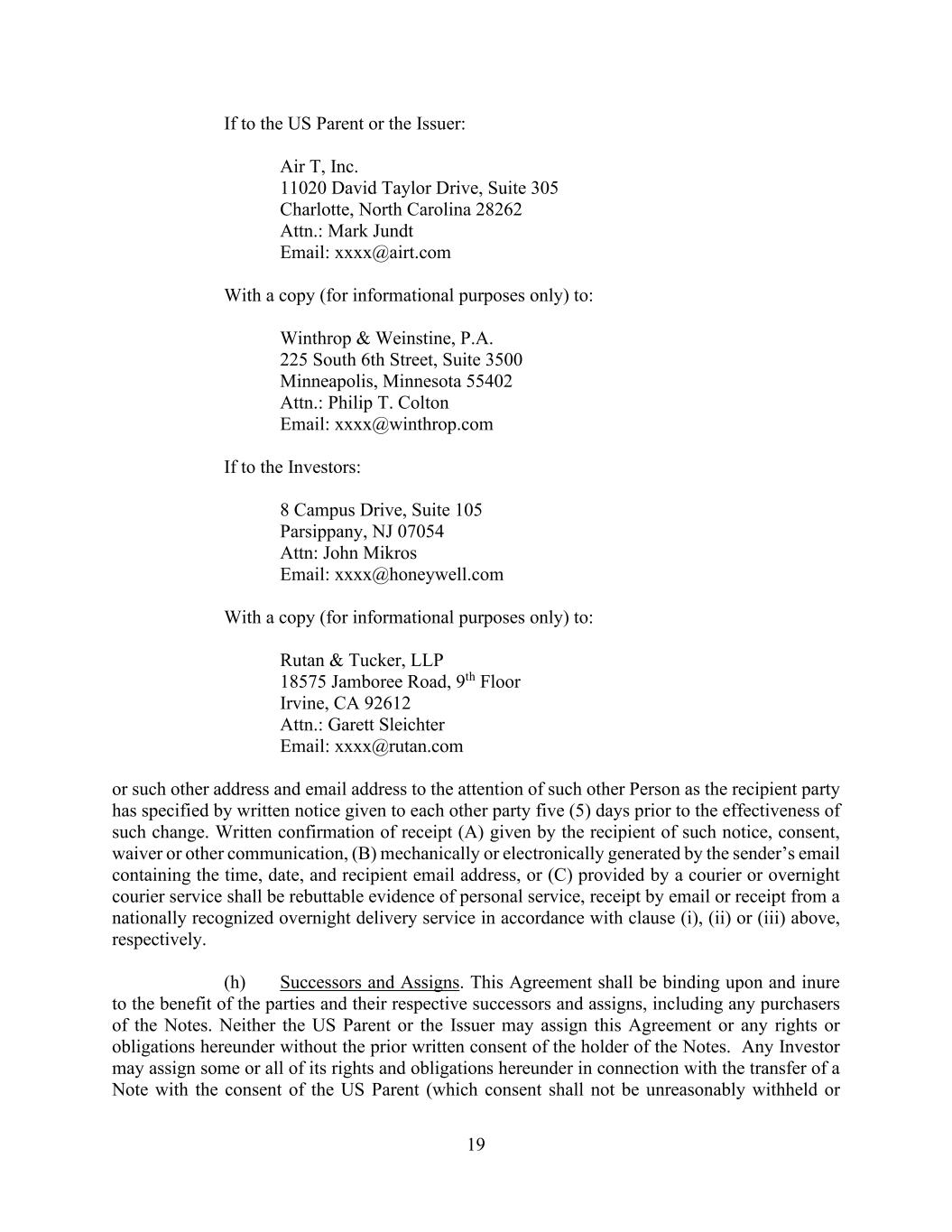 19 If to the US Parent or the Issuer: Air T, Inc. 11020 David Taylor Drive, Suite 305 Charlotte, North Carolina 28262 Attn.: Mark Jundt Email: xxxx@airt.com With a copy (for informational purposes only) to: Winthrop & Weinstine, P.A. 225 South 6th Street, Suite 3500 Minneapolis, Minnesota 55402 Attn.: Philip T. Colton Email: xxxx@winthrop.com If to the Investors: 8 Campus Drive, Suite 105 Parsippany, NJ 07054 Attn: John Mikros Email: xxxx@honeywell.com With a copy (for informational purposes only) to: Rutan & Tucker, LLP 18575 Jamboree Road, 9th Floor Irvine, CA 92612 Attn.: Garett Sleichter Email: xxxx@rutan.com or such other address and email address to the attention of such other Person as the recipient party has specified by written notice given to each other party five (5) days prior to the effectiveness of such change. Written confirmation of receipt (A) given by the recipient of such notice, consent, waiver or other communication, (B) mechanically or electronically generated by the sender’s email containing the time, date, and recipient email address, or (C) provided by a courier or overnight courier service shall be rebuttable evidence of personal service, receipt by email or receipt from a nationally recognized overnight delivery service in accordance with clause (i), (ii) or (iii) above, respectively. (h) Successors and Assigns. This Agreement shall be binding upon and inure to the benefit of the parties and their respective successors and assigns, including any purchasers of the Notes. Neither the US Parent or the Issuer may assign this Agreement or any rights or obligations hereunder without the prior written consent of the holder of the Notes. Any Investor may assign some or all of its rights and obligations hereunder in connection with the transfer of a Note with the consent of the US Parent (which consent shall not be unreasonably withheld or