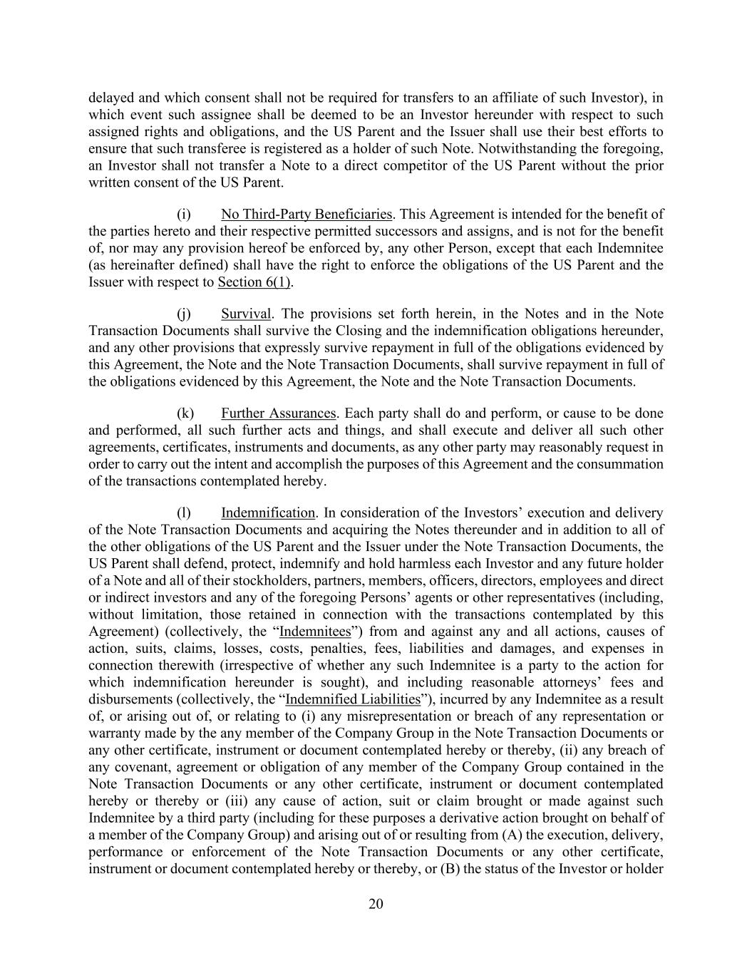 20 delayed and which consent shall not be required for transfers to an affiliate of such Investor), in which event such assignee shall be deemed to be an Investor hereunder with respect to such assigned rights and obligations, and the US Parent and the Issuer shall use their best efforts to ensure that such transferee is registered as a holder of such Note. Notwithstanding the foregoing, an Investor shall not transfer a Note to a direct competitor of the US Parent without the prior written consent of the US Parent. (i) No Third-Party Beneficiaries. This Agreement is intended for the benefit of the parties hereto and their respective permitted successors and assigns, and is not for the benefit of, nor may any provision hereof be enforced by, any other Person, except that each Indemnitee (as hereinafter defined) shall have the right to enforce the obligations of the US Parent and the Issuer with respect to Section 6(1). (j) Survival. The provisions set forth herein, in the Notes and in the Note Transaction Documents shall survive the Closing and the indemnification obligations hereunder, and any other provisions that expressly survive repayment in full of the obligations evidenced by this Agreement, the Note and the Note Transaction Documents, shall survive repayment in full of the obligations evidenced by this Agreement, the Note and the Note Transaction Documents. (k) Further Assurances. Each party shall do and perform, or cause to be done and performed, all such further acts and things, and shall execute and deliver all such other agreements, certificates, instruments and documents, as any other party may reasonably request in order to carry out the intent and accomplish the purposes of this Agreement and the consummation of the transactions contemplated hereby. (l) Indemnification. In consideration of the Investors’ execution and delivery of the Note Transaction Documents and acquiring the Notes thereunder and in addition to all of the other obligations of the US Parent and the Issuer under the Note Transaction Documents, the US Parent shall defend, protect, indemnify and hold harmless each Investor and any future holder of a Note and all of their stockholders, partners, members, officers, directors, employees and direct or indirect investors and any of the foregoing Persons’ agents or other representatives (including, without limitation, those retained in connection with the transactions contemplated by this Agreement) (collectively, the “Indemnitees”) from and against any and all actions, causes of action, suits, claims, losses, costs, penalties, fees, liabilities and damages, and expenses in connection therewith (irrespective of whether any such Indemnitee is a party to the action for which indemnification hereunder is sought), and including reasonable attorneys’ fees and disbursements (collectively, the “Indemnified Liabilities”), incurred by any Indemnitee as a result of, or arising out of, or relating to (i) any misrepresentation or breach of any representation or warranty made by the any member of the Company Group in the Note Transaction Documents or any other certificate, instrument or document contemplated hereby or thereby, (ii) any breach of any covenant, agreement or obligation of any member of the Company Group contained in the Note Transaction Documents or any other certificate, instrument or document contemplated hereby or thereby or (iii) any cause of action, suit or claim brought or made against such Indemnitee by a third party (including for these purposes a derivative action brought on behalf of a member of the Company Group) and arising out of or resulting from (A) the execution, delivery, performance or enforcement of the Note Transaction Documents or any other certificate, instrument or document contemplated hereby or thereby, or (B) the status of the Investor or holder