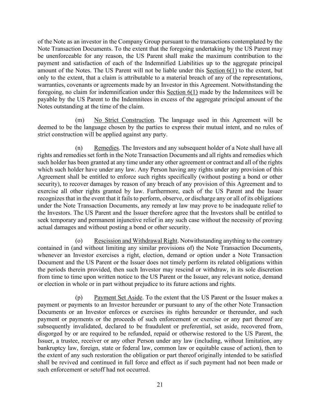 21 of the Note as an investor in the Company Group pursuant to the transactions contemplated by the Note Transaction Documents. To the extent that the foregoing undertaking by the US Parent may be unenforceable for any reason, the US Parent shall make the maximum contribution to the payment and satisfaction of each of the Indemnified Liabilities up to the aggregate principal amount of the Notes. The US Parent will not be liable under this Section 6(1) to the extent, but only to the extent, that a claim is attributable to a material breach of any of the representations, warranties, covenants or agreements made by an Investor in this Agreement. Notwithstanding the foregoing, no claim for indemnification under this Section 6(1) made by the Indemnitees will be payable by the US Parent to the Indemnitees in excess of the aggregate principal amount of the Notes outstanding at the time of the claim. (m) No Strict Construction. The language used in this Agreement will be deemed to be the language chosen by the parties to express their mutual intent, and no rules of strict construction will be applied against any party. (n) Remedies. The Investors and any subsequent holder of a Note shall have all rights and remedies set forth in the Note Transaction Documents and all rights and remedies which such holder has been granted at any time under any other agreement or contract and all of the rights which such holder have under any law. Any Person having any rights under any provision of this Agreement shall be entitled to enforce such rights specifically (without posting a bond or other security), to recover damages by reason of any breach of any provision of this Agreement and to exercise all other rights granted by law. Furthermore, each of the US Parent and the Issuer recognizes that in the event that it fails to perform, observe, or discharge any or all of its obligations under the Note Transaction Documents, any remedy at law may prove to be inadequate relief to the Investors. The US Parent and the Issuer therefore agree that the Investors shall be entitled to seek temporary and permanent injunctive relief in any such case without the necessity of proving actual damages and without posting a bond or other security. (o) Rescission and Withdrawal Right. Notwithstanding anything to the contrary contained in (and without limiting any similar provisions of) the Note Transaction Documents, whenever an Investor exercises a right, election, demand or option under a Note Transaction Document and the US Parent or the Issuer does not timely perform its related obligations within the periods therein provided, then such Investor may rescind or withdraw, in its sole discretion from time to time upon written notice to the US Parent or the Issuer, any relevant notice, demand or election in whole or in part without prejudice to its future actions and rights. (p) Payment Set Aside. To the extent that the US Parent or the Issuer makes a payment or payments to an Investor hereunder or pursuant to any of the other Note Transaction Documents or an Investor enforces or exercises its rights hereunder or thereunder, and such payment or payments or the proceeds of such enforcement or exercise or any part thereof are subsequently invalidated, declared to be fraudulent or preferential, set aside, recovered from, disgorged by or are required to be refunded, repaid or otherwise restored to the US Parent, the Issuer, a trustee, receiver or any other Person under any law (including, without limitation, any bankruptcy law, foreign, state or federal law, common law or equitable cause of action), then to the extent of any such restoration the obligation or part thereof originally intended to be satisfied shall be revived and continued in full force and effect as if such payment had not been made or such enforcement or setoff had not occurred.