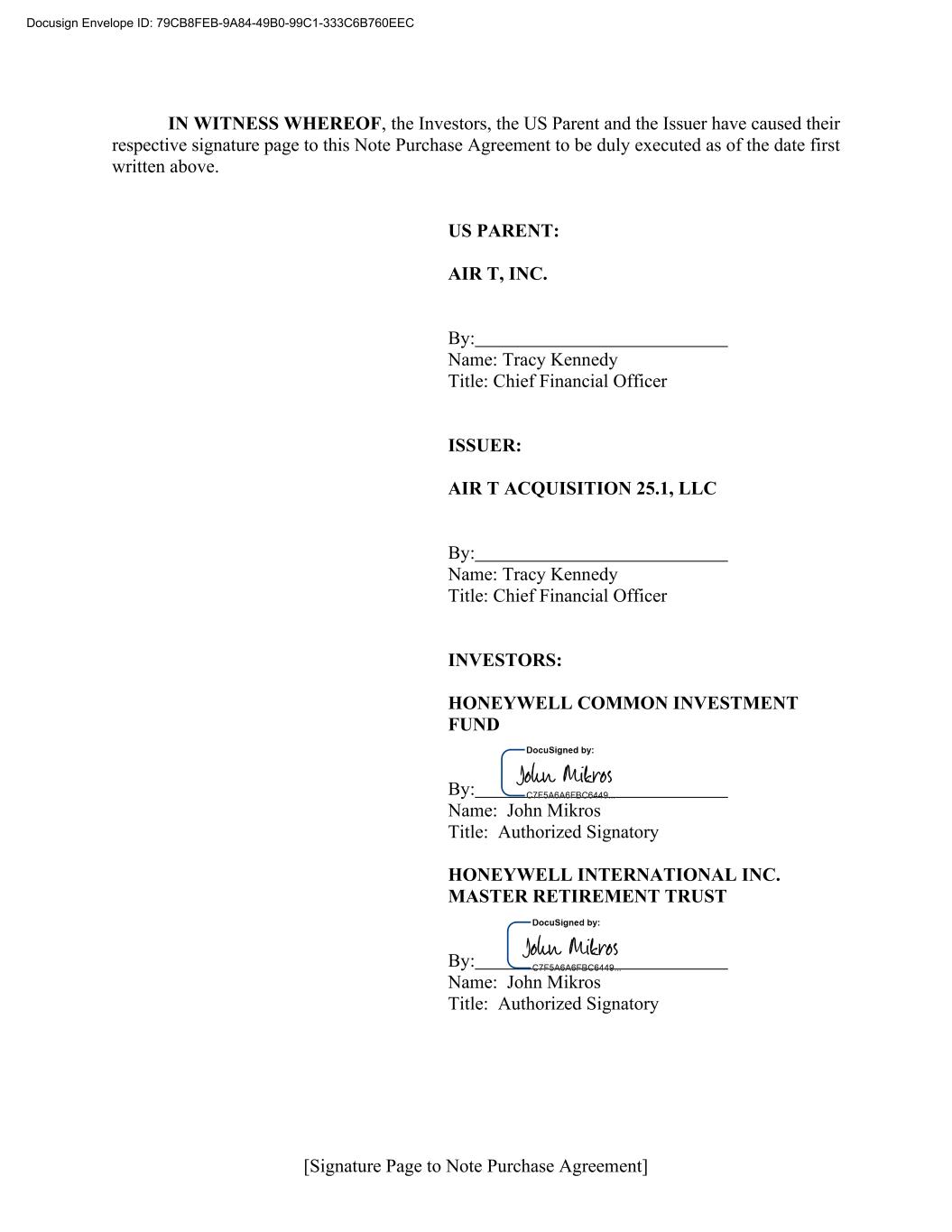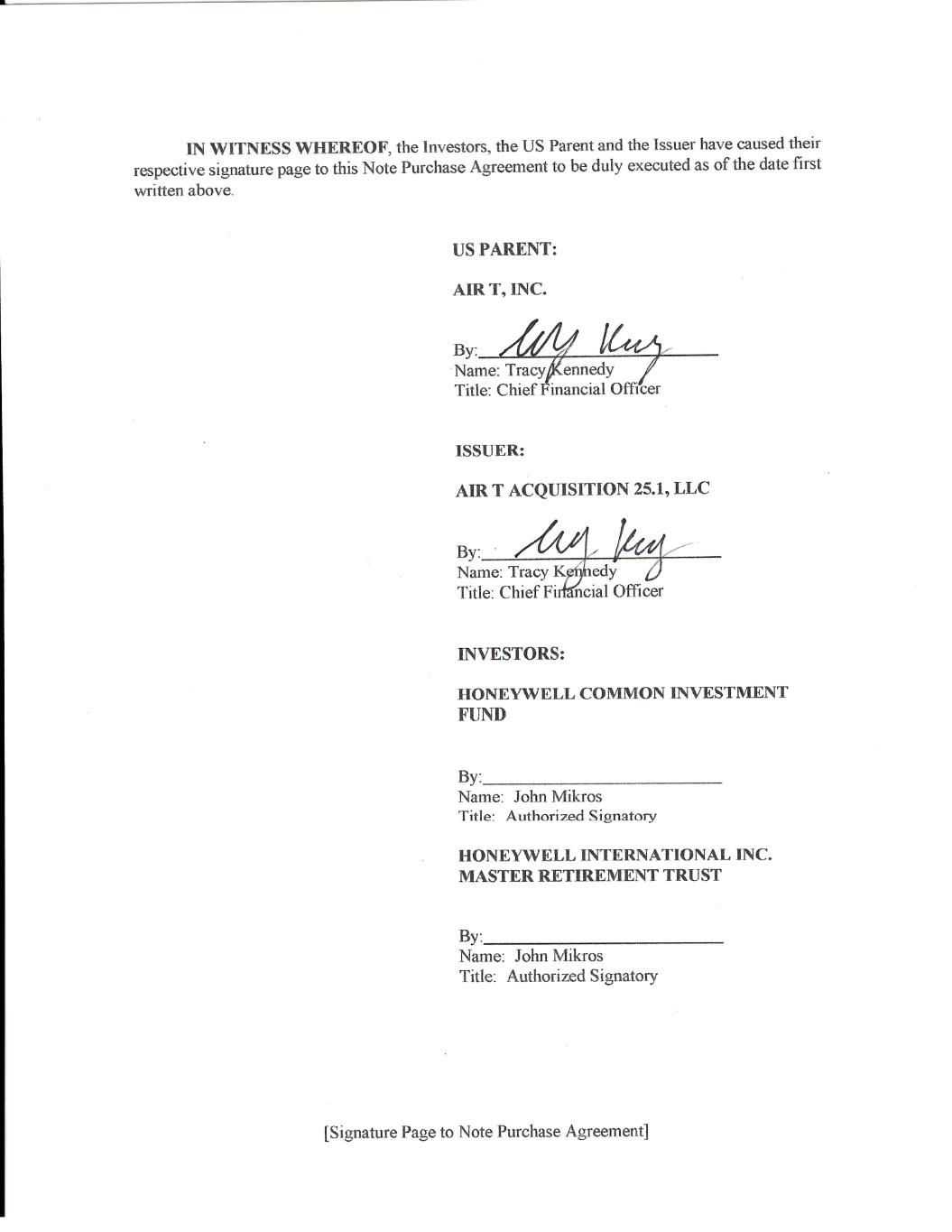 [Signature Page to Note Purchase Agreement] IN WITNESS WHEREOF, the Investors, the US Parent and the Issuer have caused their respective signature page to this Note Purchase Agreement to be duly executed as of the date first written above. US PARENT: AIR T, INC. By: Name: Tracy Kennedy Title: Chief Financial Officer ISSUER: AIR T ACQUISITION 25.1, LLC By: Name: Tracy Kennedy Title: Chief Financial Officer INVESTORS: HONEYWELL COMMON INVESTMENT FUND By: Name: John Mikros Title: Authorized Signatory HONEYWELL INTERNATIONAL INC. MASTER RETIREMENT TRUST By: Name: John Mikros Title: Authorized Signatory Docusign Envelope ID: 79CB8FEB-9A84-49B0-99C1-333C6B760EEC