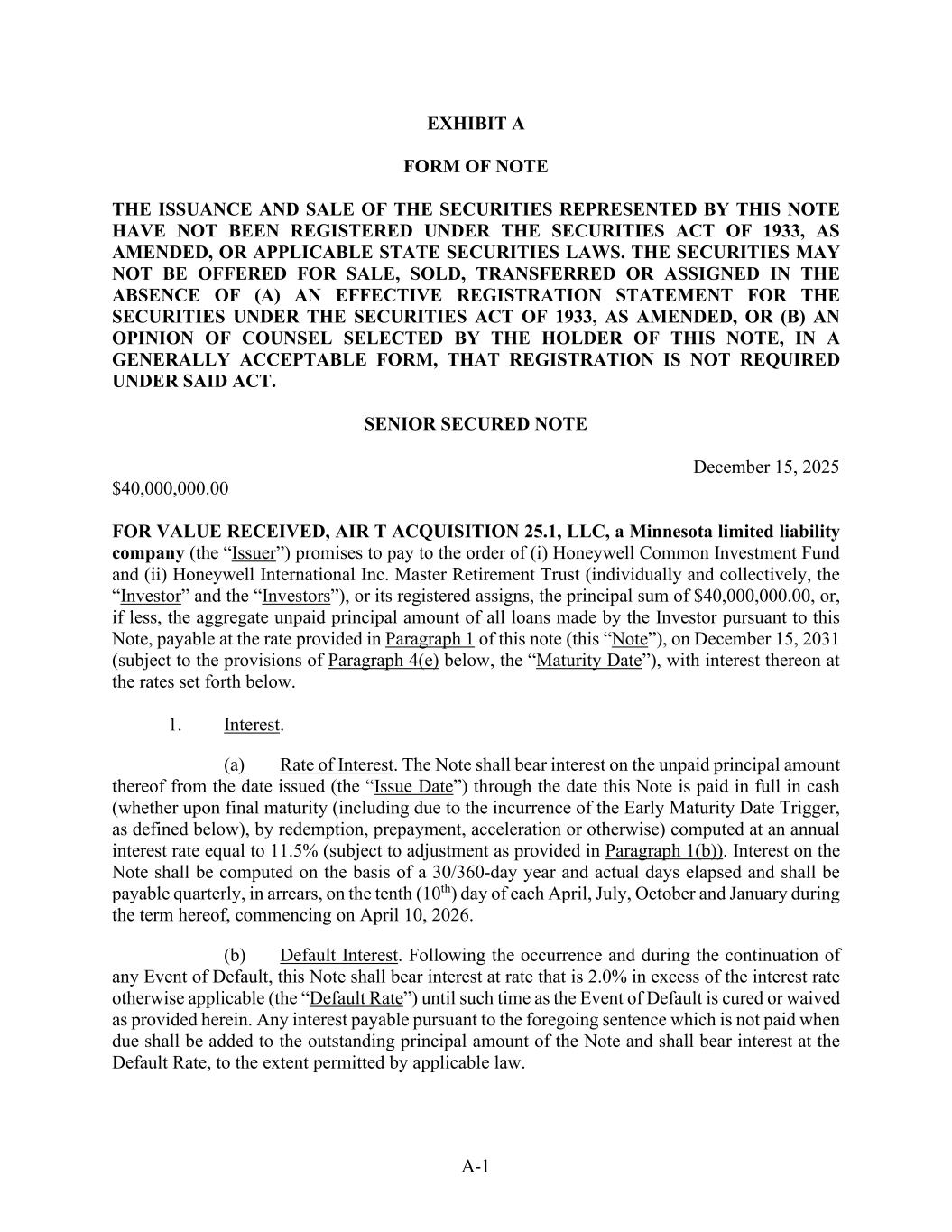 A-1 EXHIBIT A FORM OF NOTE THE ISSUANCE AND SALE OF THE SECURITIES REPRESENTED BY THIS NOTE HAVE NOT BEEN REGISTERED UNDER THE SECURITIES ACT OF 1933, AS AMENDED, OR APPLICABLE STATE SECURITIES LAWS. THE SECURITIES MAY NOT BE OFFERED FOR SALE, SOLD, TRANSFERRED OR ASSIGNED IN THE ABSENCE OF (A) AN EFFECTIVE REGISTRATION STATEMENT FOR THE SECURITIES UNDER THE SECURITIES ACT OF 1933, AS AMENDED, OR (B) AN OPINION OF COUNSEL SELECTED BY THE HOLDER OF THIS NOTE, IN A GENERALLY ACCEPTABLE FORM, THAT REGISTRATION IS NOT REQUIRED UNDER SAID ACT. SENIOR SECURED NOTE December 15, 2025 $40,000,000.00 FOR VALUE RECEIVED, AIR T ACQUISITION 25.1, LLC, a Minnesota limited liability company (the “Issuer”) promises to pay to the order of (i) Honeywell Common Investment Fund and (ii) Honeywell International Inc. Master Retirement Trust (individually and collectively, the “Investor” and the “Investors”), or its registered assigns, the principal sum of $40,000,000.00, or, if less, the aggregate unpaid principal amount of all loans made by the Investor pursuant to this Note, payable at the rate provided in Paragraph 1 of this note (this “Note”), on December 15, 2031 (subject to the provisions of Paragraph 4(e) below, the “Maturity Date”), with interest thereon at the rates set forth below. 1. Interest. (a) Rate of Interest. The Note shall bear interest on the unpaid principal amount thereof from the date issued (the “Issue Date”) through the date this Note is paid in full in cash (whether upon final maturity (including due to the incurrence of the Early Maturity Date Trigger, as defined below), by redemption, prepayment, acceleration or otherwise) computed at an annual interest rate equal to 11.5% (subject to adjustment as provided in Paragraph 1(b)). Interest on the Note shall be computed on the basis of a 30/360-day year and actual days elapsed and shall be payable quarterly, in arrears, on the tenth (10th) day of each April, July, October and January during the term hereof, commencing on April 10, 2026. (b) Default Interest. Following the occurrence and during the continuation of any Event of Default, this Note shall bear interest at rate that is 2.0% in excess of the interest rate otherwise applicable (the “Default Rate”) until such time as the Event of Default is cured or waived as provided herein. Any interest payable pursuant to the foregoing sentence which is not paid when due shall be added to the outstanding principal amount of the Note and shall bear interest at the Default Rate, to the extent permitted by applicable law.