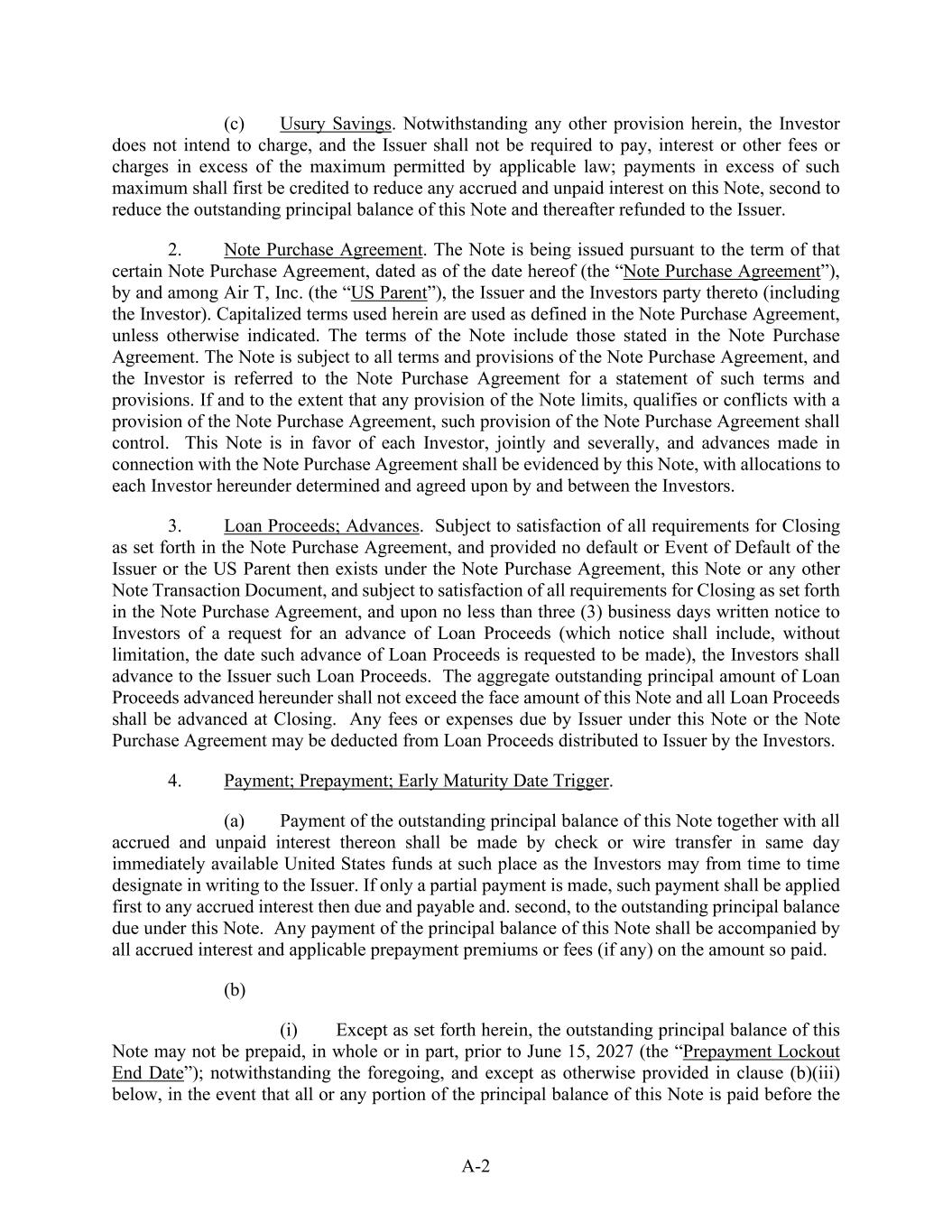 A-2 (c) Usury Savings. Notwithstanding any other provision herein, the Investor does not intend to charge, and the Issuer shall not be required to pay, interest or other fees or charges in excess of the maximum permitted by applicable law; payments in excess of such maximum shall first be credited to reduce any accrued and unpaid interest on this Note, second to reduce the outstanding principal balance of this Note and thereafter refunded to the Issuer. 2. Note Purchase Agreement. The Note is being issued pursuant to the term of that certain Note Purchase Agreement, dated as of the date hereof (the “Note Purchase Agreement”), by and among Air T, Inc. (the “US Parent”), the Issuer and the Investors party thereto (including the Investor). Capitalized terms used herein are used as defined in the Note Purchase Agreement, unless otherwise indicated. The terms of the Note include those stated in the Note Purchase Agreement. The Note is subject to all terms and provisions of the Note Purchase Agreement, and the Investor is referred to the Note Purchase Agreement for a statement of such terms and provisions. If and to the extent that any provision of the Note limits, qualifies or conflicts with a provision of the Note Purchase Agreement, such provision of the Note Purchase Agreement shall control. This Note is in favor of each Investor, jointly and severally, and advances made in connection with the Note Purchase Agreement shall be evidenced by this Note, with allocations to each Investor hereunder determined and agreed upon by and between the Investors. 3. Loan Proceeds; Advances. Subject to satisfaction of all requirements for Closing as set forth in the Note Purchase Agreement, and provided no default or Event of Default of the Issuer or the US Parent then exists under the Note Purchase Agreement, this Note or any other Note Transaction Document, and subject to satisfaction of all requirements for Closing as set forth in the Note Purchase Agreement, and upon no less than three (3) business days written notice to Investors of a request for an advance of Loan Proceeds (which notice shall include, without limitation, the date such advance of Loan Proceeds is requested to be made), the Investors shall advance to the Issuer such Loan Proceeds. The aggregate outstanding principal amount of Loan Proceeds advanced hereunder shall not exceed the face amount of this Note and all Loan Proceeds shall be advanced at Closing. Any fees or expenses due by Issuer under this Note or the Note Purchase Agreement may be deducted from Loan Proceeds distributed to Issuer by the Investors. 4. Payment; Prepayment; Early Maturity Date Trigger. (a) Payment of the outstanding principal balance of this Note together with all accrued and unpaid interest thereon shall be made by check or wire transfer in same day immediately available United States funds at such place as the Investors may from time to time designate in writing to the Issuer. If only a partial payment is made, such payment shall be applied first to any accrued interest then due and payable and. second, to the outstanding principal balance due under this Note. Any payment of the principal balance of this Note shall be accompanied by all accrued interest and applicable prepayment premiums or fees (if any) on the amount so paid. (b) (i) Except as set forth herein, the outstanding principal balance of this Note may not be prepaid, in whole or in part, prior to June 15, 2027 (the “Prepayment Lockout End Date”); notwithstanding the foregoing, and except as otherwise provided in clause (b)(iii) below, in the event that all or any portion of the principal balance of this Note is paid before the