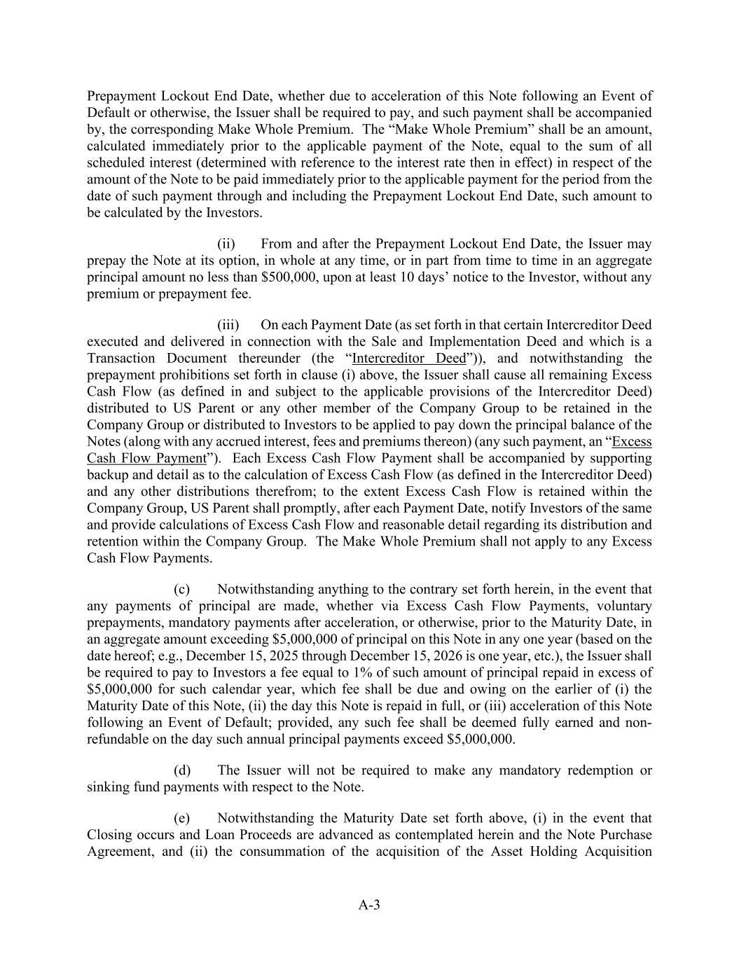 A-3 Prepayment Lockout End Date, whether due to acceleration of this Note following an Event of Default or otherwise, the Issuer shall be required to pay, and such payment shall be accompanied by, the corresponding Make Whole Premium. The “Make Whole Premium” shall be an amount, calculated immediately prior to the applicable payment of the Note, equal to the sum of all scheduled interest (determined with reference to the interest rate then in effect) in respect of the amount of the Note to be paid immediately prior to the applicable payment for the period from the date of such payment through and including the Prepayment Lockout End Date, such amount to be calculated by the Investors. (ii) From and after the Prepayment Lockout End Date, the Issuer may prepay the Note at its option, in whole at any time, or in part from time to time in an aggregate principal amount no less than $500,000, upon at least 10 days’ notice to the Investor, without any premium or prepayment fee. (iii) On each Payment Date (as set forth in that certain Intercreditor Deed executed and delivered in connection with the Sale and Implementation Deed and which is a Transaction Document thereunder (the “Intercreditor Deed”)), and notwithstanding the prepayment prohibitions set forth in clause (i) above, the Issuer shall cause all remaining Excess Cash Flow (as defined in and subject to the applicable provisions of the Intercreditor Deed) distributed to US Parent or any other member of the Company Group to be retained in the Company Group or distributed to Investors to be applied to pay down the principal balance of the Notes (along with any accrued interest, fees and premiums thereon) (any such payment, an “Excess Cash Flow Payment”). Each Excess Cash Flow Payment shall be accompanied by supporting backup and detail as to the calculation of Excess Cash Flow (as defined in the Intercreditor Deed) and any other distributions therefrom; to the extent Excess Cash Flow is retained within the Company Group, US Parent shall promptly, after each Payment Date, notify Investors of the same and provide calculations of Excess Cash Flow and reasonable detail regarding its distribution and retention within the Company Group. The Make Whole Premium shall not apply to any Excess Cash Flow Payments. (c) Notwithstanding anything to the contrary set forth herein, in the event that any payments of principal are made, whether via Excess Cash Flow Payments, voluntary prepayments, mandatory payments after acceleration, or otherwise, prior to the Maturity Date, in an aggregate amount exceeding $5,000,000 of principal on this Note in any one year (based on the date hereof; e.g., December 15, 2025 through December 15, 2026 is one year, etc.), the Issuer shall be required to pay to Investors a fee equal to 1% of such amount of principal repaid in excess of $5,000,000 for such calendar year, which fee shall be due and owing on the earlier of (i) the Maturity Date of this Note, (ii) the day this Note is repaid in full, or (iii) acceleration of this Note following an Event of Default; provided, any such fee shall be deemed fully earned and non- refundable on the day such annual principal payments exceed $5,000,000. (d) The Issuer will not be required to make any mandatory redemption or sinking fund payments with respect to the Note. (e) Notwithstanding the Maturity Date set forth above, (i) in the event that Closing occurs and Loan Proceeds are advanced as contemplated herein and the Note Purchase Agreement, and (ii) the consummation of the acquisition of the Asset Holding Acquisition