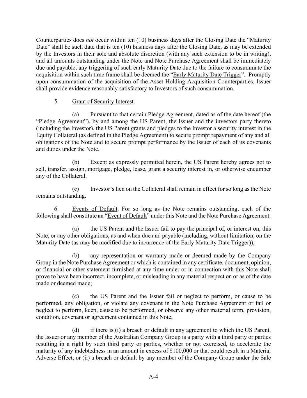A-4 Counterparties does not occur within ten (10) business days after the Closing Date the “Maturity Date” shall be such date that is ten (10) business days after the Closing Date, as may be extended by the Investors in their sole and absolute discretion (with any such extension to be in writing), and all amounts outstanding under the Note and Note Purchase Agreement shall be immediately due and payable; any triggering of such early Maturity Date due to the failure to consummate the acquisition within such time frame shall be deemed the “Early Maturity Date Trigger”. Promptly upon consummation of the acquisition of the Asset Holding Acquisition Counterparties, Issuer shall provide evidence reasonably satisfactory to Investors of such consummation. 5. Grant of Security Interest. (a) Pursuant to that certain Pledge Agreement, dated as of the date hereof (the “Pledge Agreement”), by and among the US Parent, the Issuer and the investors party thereto (including the Investor), the US Parent grants and pledges to the Investor a security interest in the Equity Collateral (as defined in the Pledge Agreement) to secure prompt repayment of any and all obligations of the Note and to secure prompt performance by the Issuer of each of its covenants and duties under the Note. (b) Except as expressly permitted herein, the US Parent hereby agrees not to sell, transfer, assign, mortgage, pledge, lease, grant a security interest in, or otherwise encumber any of the Collateral. (c) Investor’s lien on the Collateral shall remain in effect for so long as the Note remains outstanding. 6. Events of Default. For so long as the Note remains outstanding, each of the following shall constitute an “Event of Default” under this Note and the Note Purchase Agreement: (a) the US Parent and the Issuer fail to pay the principal of, or interest on, this Note, or any other obligations, as and when due and payable (including, without limitation, on the Maturity Date (as may be modified due to incurrence of the Early Maturity Date Trigger)); (b) any representation or warranty made or deemed made by the Company Group in the Note Purchase Agreement or which is contained in any certificate, document, opinion, or financial or other statement furnished at any time under or in connection with this Note shall prove to have been incorrect, incomplete, or misleading in any material respect on or as of the date made or deemed made; (c) the US Parent and the Issuer fail or neglect to perform, or cause to be performed, any obligation, or violate any covenant in the Note Purchase Agreement or fail or neglect to perform, keep, cause to be performed, or observe any other material term, provision, condition, covenant or agreement contained in this Note; (d) if there is (i) a breach or default in any agreement to which the US Parent. the Issuer or any member of the Australian Company Group is a party with a third party or parties resulting in a right by such third party or parties, whether or not exercised, to accelerate the maturity of any indebtedness in an amount in excess of $100,000 or that could result in a Material Adverse Effect, or (ii) a breach or default by any member of the Company Group under the Sale