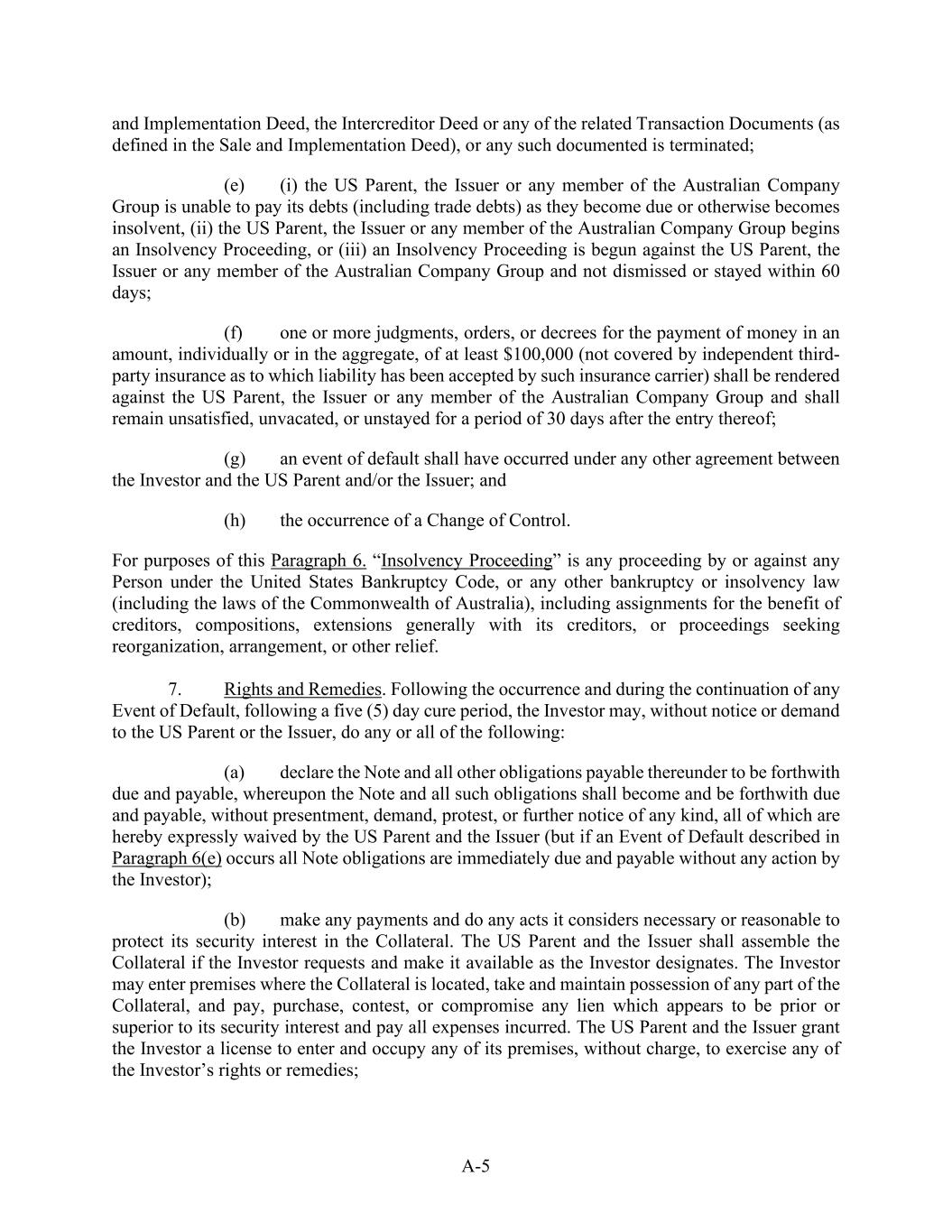 A-5 and Implementation Deed, the Intercreditor Deed or any of the related Transaction Documents (as defined in the Sale and Implementation Deed), or any such documented is terminated; (e) (i) the US Parent, the Issuer or any member of the Australian Company Group is unable to pay its debts (including trade debts) as they become due or otherwise becomes insolvent, (ii) the US Parent, the Issuer or any member of the Australian Company Group begins an Insolvency Proceeding, or (iii) an Insolvency Proceeding is begun against the US Parent, the Issuer or any member of the Australian Company Group and not dismissed or stayed within 60 days; (f) one or more judgments, orders, or decrees for the payment of money in an amount, individually or in the aggregate, of at least $100,000 (not covered by independent third- party insurance as to which liability has been accepted by such insurance carrier) shall be rendered against the US Parent, the Issuer or any member of the Australian Company Group and shall remain unsatisfied, unvacated, or unstayed for a period of 30 days after the entry thereof; (g) an event of default shall have occurred under any other agreement between the Investor and the US Parent and/or the Issuer; and (h) the occurrence of a Change of Control. For purposes of this Paragraph 6. “Insolvency Proceeding” is any proceeding by or against any Person under the United States Bankruptcy Code, or any other bankruptcy or insolvency law (including the laws of the Commonwealth of Australia), including assignments for the benefit of creditors, compositions, extensions generally with its creditors, or proceedings seeking reorganization, arrangement, or other relief. 7. Rights and Remedies. Following the occurrence and during the continuation of any Event of Default, following a five (5) day cure period, the Investor may, without notice or demand to the US Parent or the Issuer, do any or all of the following: (a) declare the Note and all other obligations payable thereunder to be forthwith due and payable, whereupon the Note and all such obligations shall become and be forthwith due and payable, without presentment, demand, protest, or further notice of any kind, all of which are hereby expressly waived by the US Parent and the Issuer (but if an Event of Default described in Paragraph 6(e) occurs all Note obligations are immediately due and payable without any action by the Investor); (b) make any payments and do any acts it considers necessary or reasonable to protect its security interest in the Collateral. The US Parent and the Issuer shall assemble the Collateral if the Investor requests and make it available as the Investor designates. The Investor may enter premises where the Collateral is located, take and maintain possession of any part of the Collateral, and pay, purchase, contest, or compromise any lien which appears to be prior or superior to its security interest and pay all expenses incurred. The US Parent and the Issuer grant the Investor a license to enter and occupy any of its premises, without charge, to exercise any of the Investor’s rights or remedies;