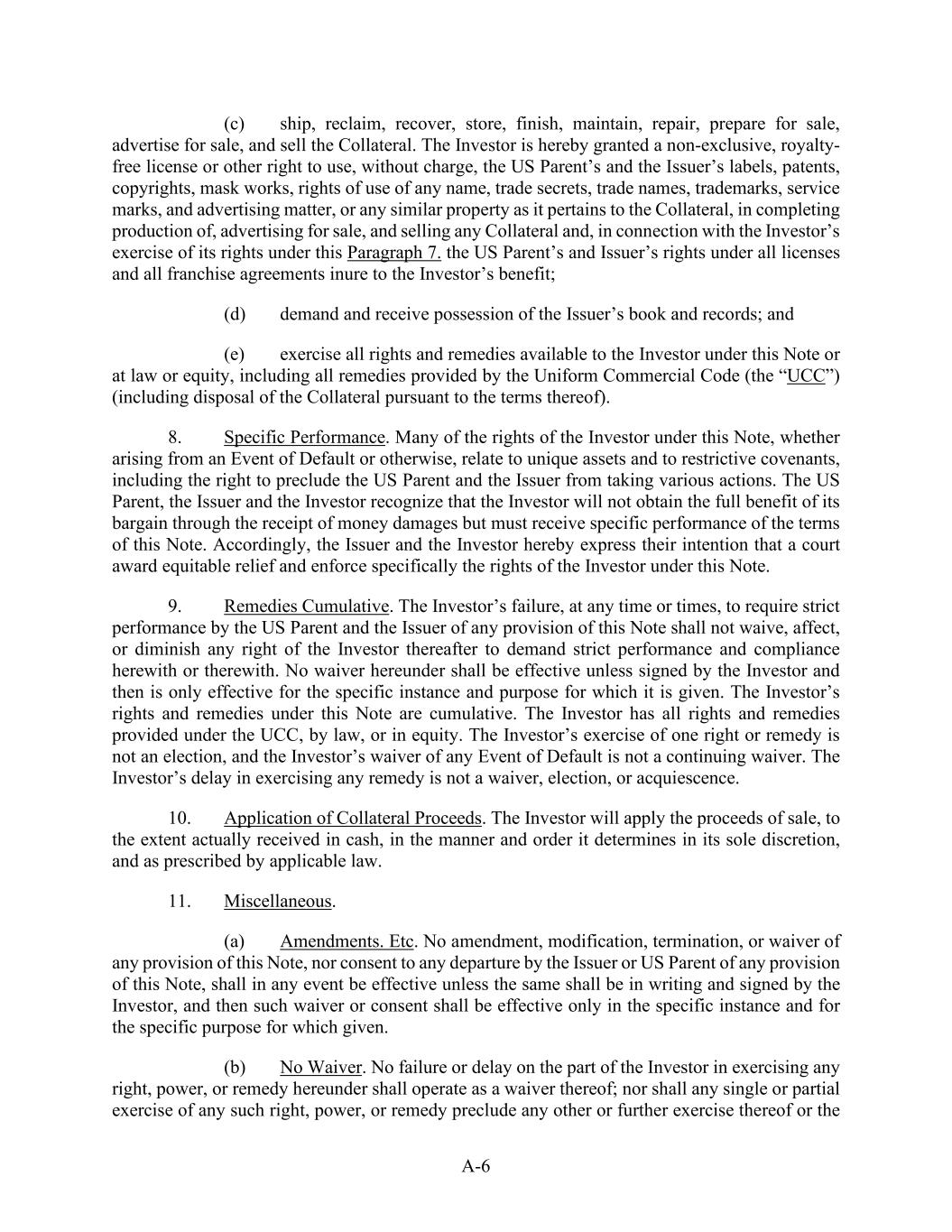 A-6 (c) ship, reclaim, recover, store, finish, maintain, repair, prepare for sale, advertise for sale, and sell the Collateral. The Investor is hereby granted a non-exclusive, royalty- free license or other right to use, without charge, the US Parent’s and the Issuer’s labels, patents, copyrights, mask works, rights of use of any name, trade secrets, trade names, trademarks, service marks, and advertising matter, or any similar property as it pertains to the Collateral, in completing production of, advertising for sale, and selling any Collateral and, in connection with the Investor’s exercise of its rights under this Paragraph 7. the US Parent’s and Issuer’s rights under all licenses and all franchise agreements inure to the Investor’s benefit; (d) demand and receive possession of the Issuer’s book and records; and (e) exercise all rights and remedies available to the Investor under this Note or at law or equity, including all remedies provided by the Uniform Commercial Code (the “UCC”) (including disposal of the Collateral pursuant to the terms thereof). 8. Specific Performance. Many of the rights of the Investor under this Note, whether arising from an Event of Default or otherwise, relate to unique assets and to restrictive covenants, including the right to preclude the US Parent and the Issuer from taking various actions. The US Parent, the Issuer and the Investor recognize that the Investor will not obtain the full benefit of its bargain through the receipt of money damages but must receive specific performance of the terms of this Note. Accordingly, the Issuer and the Investor hereby express their intention that a court award equitable relief and enforce specifically the rights of the Investor under this Note. 9. Remedies Cumulative. The Investor’s failure, at any time or times, to require strict performance by the US Parent and the Issuer of any provision of this Note shall not waive, affect, or diminish any right of the Investor thereafter to demand strict performance and compliance herewith or therewith. No waiver hereunder shall be effective unless signed by the Investor and then is only effective for the specific instance and purpose for which it is given. The Investor’s rights and remedies under this Note are cumulative. The Investor has all rights and remedies provided under the UCC, by law, or in equity. The Investor’s exercise of one right or remedy is not an election, and the Investor’s waiver of any Event of Default is not a continuing waiver. The Investor’s delay in exercising any remedy is not a waiver, election, or acquiescence. 10. Application of Collateral Proceeds. The Investor will apply the proceeds of sale, to the extent actually received in cash, in the manner and order it determines in its sole discretion, and as prescribed by applicable law. 11. Miscellaneous. (a) Amendments. Etc. No amendment, modification, termination, or waiver of any provision of this Note, nor consent to any departure by the Issuer or US Parent of any provision of this Note, shall in any event be effective unless the same shall be in writing and signed by the Investor, and then such waiver or consent shall be effective only in the specific instance and for the specific purpose for which given. (b) No Waiver. No failure or delay on the part of the Investor in exercising any right, power, or remedy hereunder shall operate as a waiver thereof; nor shall any single or partial exercise of any such right, power, or remedy preclude any other or further exercise thereof or the