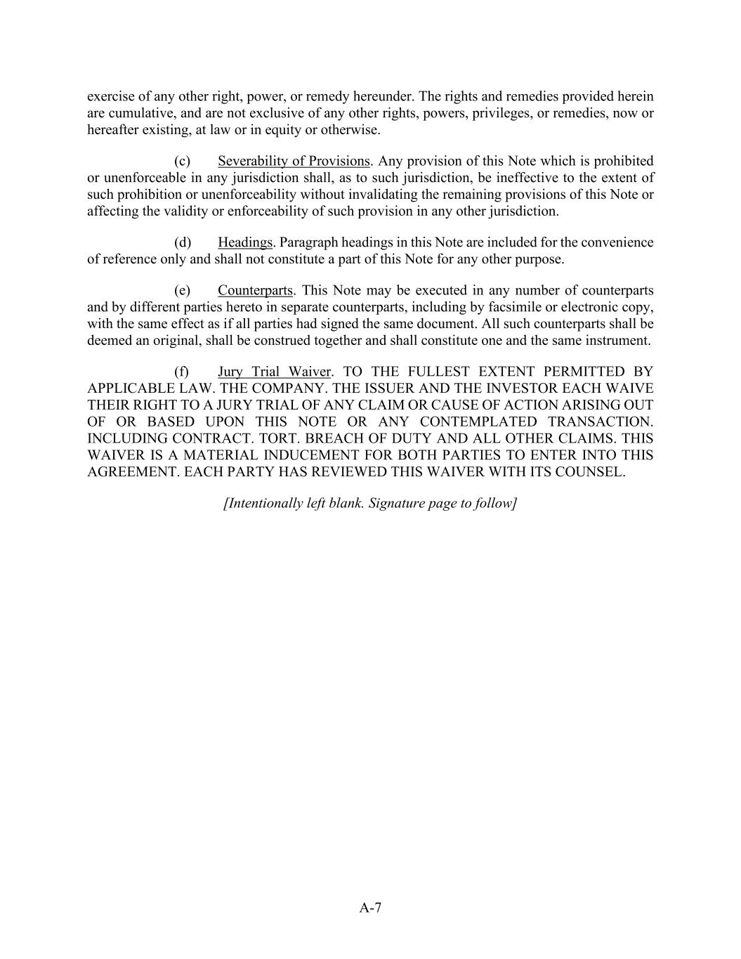 A-7 exercise of any other right, power, or remedy hereunder. The rights and remedies provided herein are cumulative, and are not exclusive of any other rights, powers, privileges, or remedies, now or hereafter existing, at law or in equity or otherwise. (c) Severability of Provisions. Any provision of this Note which is prohibited or unenforceable in any jurisdiction shall, as to such jurisdiction, be ineffective to the extent of such prohibition or unenforceability without invalidating the remaining provisions of this Note or affecting the validity or enforceability of such provision in any other jurisdiction. (d) Headings. Paragraph headings in this Note are included for the convenience of reference only and shall not constitute a part of this Note for any other purpose. (e) Counterparts. This Note may be executed in any number of counterparts and by different parties hereto in separate counterparts, including by facsimile or electronic copy, with the same effect as if all parties had signed the same document. All such counterparts shall be deemed an original, shall be construed together and shall constitute one and the same instrument. (f) Jury Trial Waiver. TO THE FULLEST EXTENT PERMITTED BY APPLICABLE LAW. THE COMPANY. THE ISSUER AND THE INVESTOR EACH WAIVE THEIR RIGHT TO A JURY TRIAL OF ANY CLAIM OR CAUSE OF ACTION ARISING OUT OF OR BASED UPON THIS NOTE OR ANY CONTEMPLATED TRANSACTION. INCLUDING CONTRACT. TORT. BREACH OF DUTY AND ALL OTHER CLAIMS. THIS WAIVER IS A MATERIAL INDUCEMENT FOR BOTH PARTIES TO ENTER INTO THIS AGREEMENT. EACH PARTY HAS REVIEWED THIS WAIVER WITH ITS COUNSEL. [Intentionally left blank. Signature page to follow]