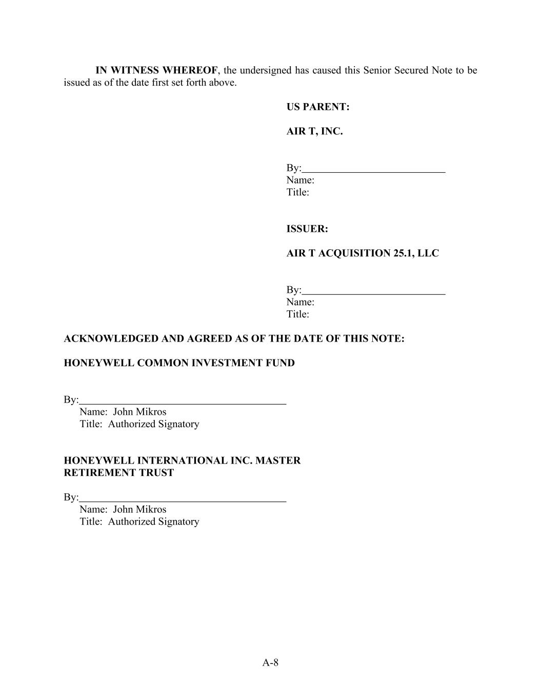 A-8 IN WITNESS WHEREOF, the undersigned has caused this Senior Secured Note to be issued as of the date first set forth above. US PARENT: AIR T, INC. By: Name: Title: ISSUER: AIR T ACQUISITION 25.1, LLC By: Name: Title: ACKNOWLEDGED AND AGREED AS OF THE DATE OF THIS NOTE: HONEYWELL COMMON INVESTMENT FUND By: Name: John Mikros Title: Authorized Signatory HONEYWELL INTERNATIONAL INC. MASTER RETIREMENT TRUST By: Name: John Mikros Title: Authorized Signatory