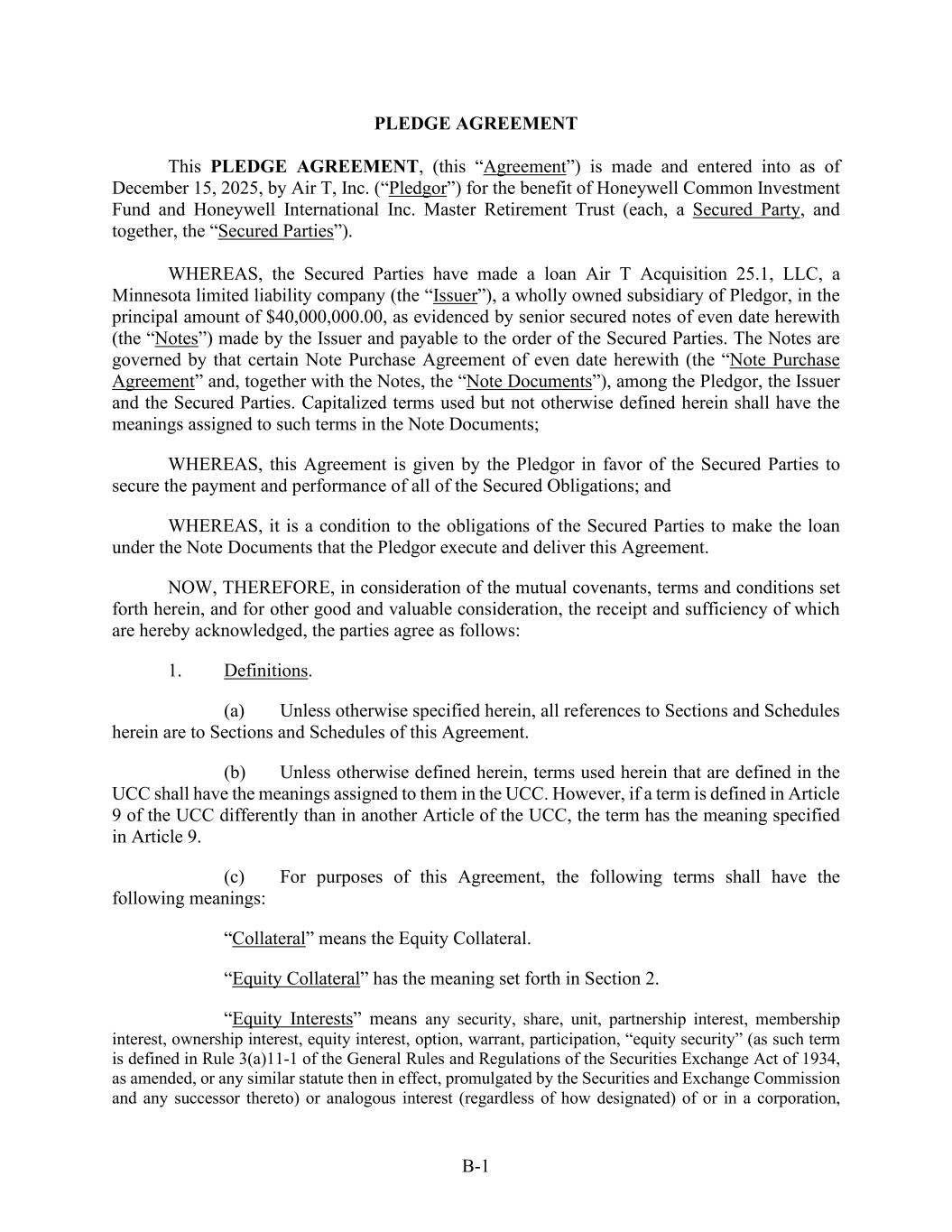 B-1 PLEDGE AGREEMENT This PLEDGE AGREEMENT, (this “Agreement”) is made and entered into as of December 15, 2025, by Air T, Inc. (“Pledgor”) for the benefit of Honeywell Common Investment Fund and Honeywell International Inc. Master Retirement Trust (each, a Secured Party, and together, the “Secured Parties”). WHEREAS, the Secured Parties have made a loan Air T Acquisition 25.1, LLC, a Minnesota limited liability company (the “Issuer”), a wholly owned subsidiary of Pledgor, in the principal amount of $40,000,000.00, as evidenced by senior secured notes of even date herewith (the “Notes”) made by the Issuer and payable to the order of the Secured Parties. The Notes are governed by that certain Note Purchase Agreement of even date herewith (the “Note Purchase Agreement” and, together with the Notes, the “Note Documents”), among the Pledgor, the Issuer and the Secured Parties. Capitalized terms used but not otherwise defined herein shall have the meanings assigned to such terms in the Note Documents; WHEREAS, this Agreement is given by the Pledgor in favor of the Secured Parties to secure the payment and performance of all of the Secured Obligations; and WHEREAS, it is a condition to the obligations of the Secured Parties to make the loan under the Note Documents that the Pledgor execute and deliver this Agreement. NOW, THEREFORE, in consideration of the mutual covenants, terms and conditions set forth herein, and for other good and valuable consideration, the receipt and sufficiency of which are hereby acknowledged, the parties agree as follows: 1. Definitions. (a) Unless otherwise specified herein, all references to Sections and Schedules herein are to Sections and Schedules of this Agreement. (b) Unless otherwise defined herein, terms used herein that are defined in the UCC shall have the meanings assigned to them in the UCC. However, if a term is defined in Article 9 of the UCC differently than in another Article of the UCC, the term has the meaning specified in Article 9. (c) For purposes of this Agreement, the following terms shall have the following meanings: “Collateral” means the Equity Collateral. “Equity Collateral” has the meaning set forth in Section 2. “Equity Interests” means any security, share, unit, partnership interest, membership interest, ownership interest, equity interest, option, warrant, participation, “equity security” (as such term is defined in Rule 3(a)11-1 of the General Rules and Regulations of the Securities Exchange Act of 1934, as amended, or any similar statute then in effect, promulgated by the Securities and Exchange Commission and any successor thereto) or analogous interest (regardless of how designated) of or in a corporation,