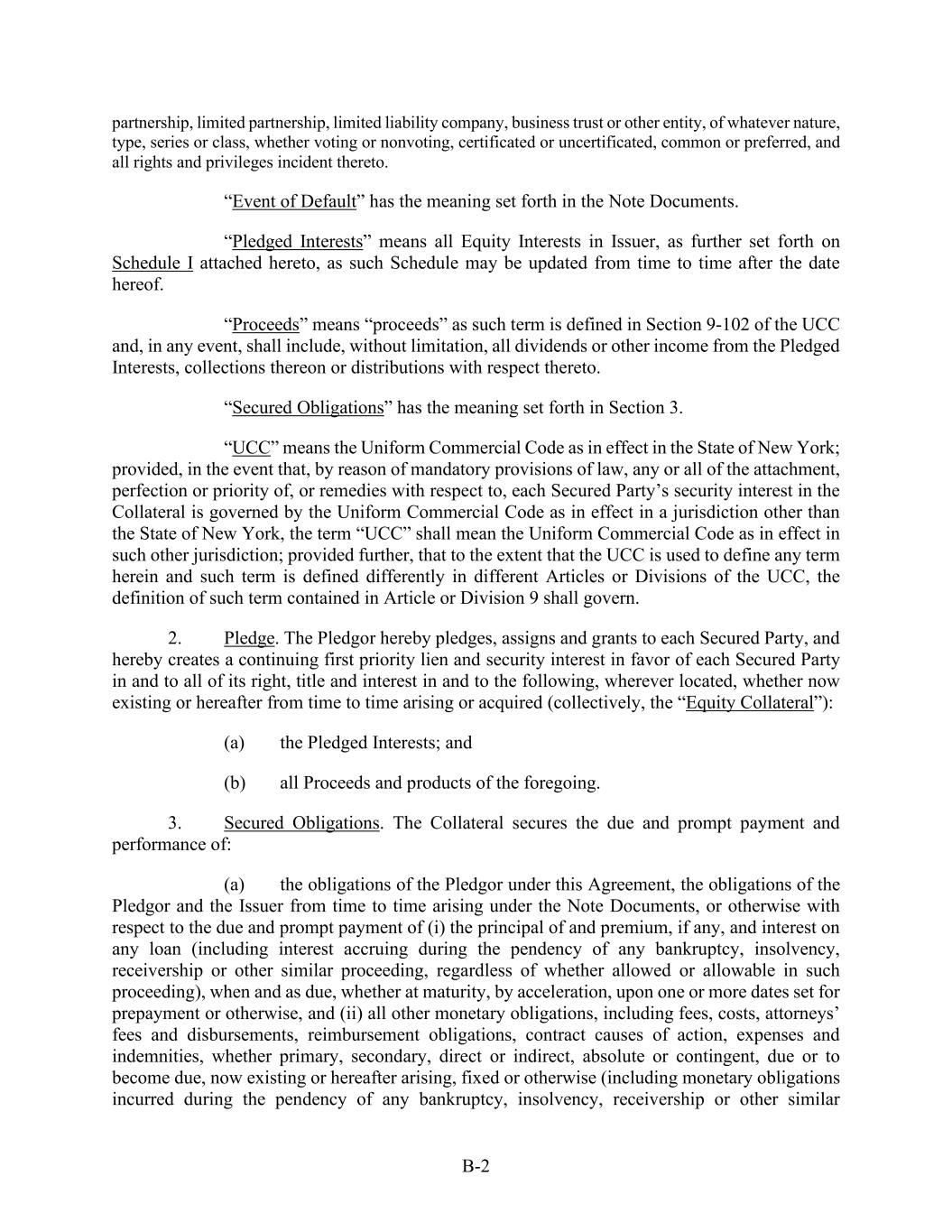 B-2 partnership, limited partnership, limited liability company, business trust or other entity, of whatever nature, type, series or class, whether voting or nonvoting, certificated or uncertificated, common or preferred, and all rights and privileges incident thereto. “Event of Default” has the meaning set forth in the Note Documents. “Pledged Interests” means all Equity Interests in Issuer, as further set forth on Schedule I attached hereto, as such Schedule may be updated from time to time after the date hereof. “Proceeds” means “proceeds” as such term is defined in Section 9-102 of the UCC and, in any event, shall include, without limitation, all dividends or other income from the Pledged Interests, collections thereon or distributions with respect thereto. “Secured Obligations” has the meaning set forth in Section 3. “UCC” means the Uniform Commercial Code as in effect in the State of New York; provided, in the event that, by reason of mandatory provisions of law, any or all of the attachment, perfection or priority of, or remedies with respect to, each Secured Party’s security interest in the Collateral is governed by the Uniform Commercial Code as in effect in a jurisdiction other than the State of New York, the term “UCC” shall mean the Uniform Commercial Code as in effect in such other jurisdiction; provided further, that to the extent that the UCC is used to define any term herein and such term is defined differently in different Articles or Divisions of the UCC, the definition of such term contained in Article or Division 9 shall govern. 2. Pledge. The Pledgor hereby pledges, assigns and grants to each Secured Party, and hereby creates a continuing first priority lien and security interest in favor of each Secured Party in and to all of its right, title and interest in and to the following, wherever located, whether now existing or hereafter from time to time arising or acquired (collectively, the “Equity Collateral”): (a) the Pledged Interests; and (b) all Proceeds and products of the foregoing. 3. Secured Obligations. The Collateral secures the due and prompt payment and performance of: (a) the obligations of the Pledgor under this Agreement, the obligations of the Pledgor and the Issuer from time to time arising under the Note Documents, or otherwise with respect to the due and prompt payment of (i) the principal of and premium, if any, and interest on any loan (including interest accruing during the pendency of any bankruptcy, insolvency, receivership or other similar proceeding, regardless of whether allowed or allowable in such proceeding), when and as due, whether at maturity, by acceleration, upon one or more dates set for prepayment or otherwise, and (ii) all other monetary obligations, including fees, costs, attorneys’ fees and disbursements, reimbursement obligations, contract causes of action, expenses and indemnities, whether primary, secondary, direct or indirect, absolute or contingent, due or to become due, now existing or hereafter arising, fixed or otherwise (including monetary obligations incurred during the pendency of any bankruptcy, insolvency, receivership or other similar