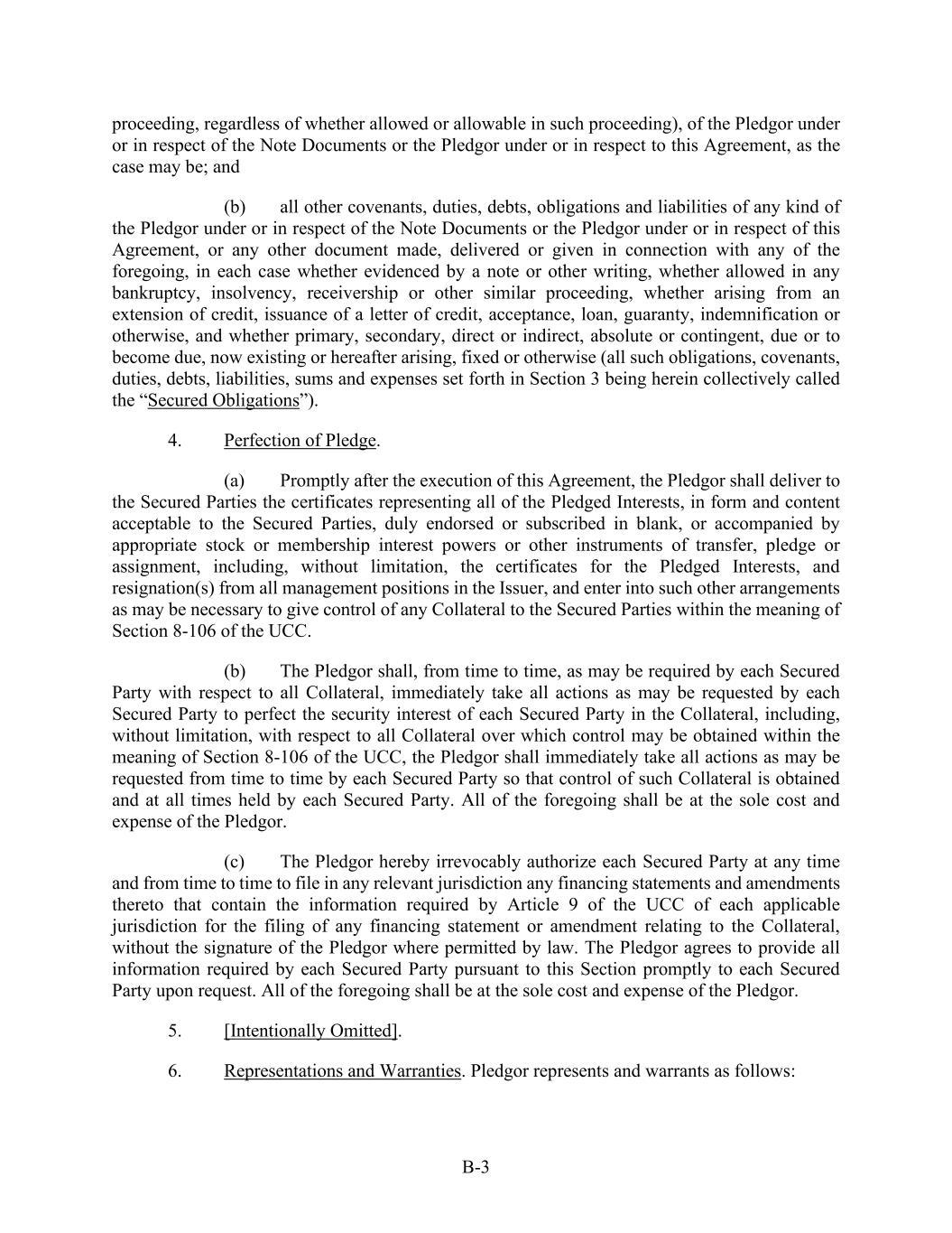 B-3 proceeding, regardless of whether allowed or allowable in such proceeding), of the Pledgor under or in respect of the Note Documents or the Pledgor under or in respect to this Agreement, as the case may be; and (b) all other covenants, duties, debts, obligations and liabilities of any kind of the Pledgor under or in respect of the Note Documents or the Pledgor under or in respect of this Agreement, or any other document made, delivered or given in connection with any of the foregoing, in each case whether evidenced by a note or other writing, whether allowed in any bankruptcy, insolvency, receivership or other similar proceeding, whether arising from an extension of credit, issuance of a letter of credit, acceptance, loan, guaranty, indemnification or otherwise, and whether primary, secondary, direct or indirect, absolute or contingent, due or to become due, now existing or hereafter arising, fixed or otherwise (all such obligations, covenants, duties, debts, liabilities, sums and expenses set forth in Section 3 being herein collectively called the “Secured Obligations”). 4. Perfection of Pledge. (a) Promptly after the execution of this Agreement, the Pledgor shall deliver to the Secured Parties the certificates representing all of the Pledged Interests, in form and content acceptable to the Secured Parties, duly endorsed or subscribed in blank, or accompanied by appropriate stock or membership interest powers or other instruments of transfer, pledge or assignment, including, without limitation, the certificates for the Pledged Interests, and resignation(s) from all management positions in the Issuer, and enter into such other arrangements as may be necessary to give control of any Collateral to the Secured Parties within the meaning of Section 8-106 of the UCC. (b) The Pledgor shall, from time to time, as may be required by each Secured Party with respect to all Collateral, immediately take all actions as may be requested by each Secured Party to perfect the security interest of each Secured Party in the Collateral, including, without limitation, with respect to all Collateral over which control may be obtained within the meaning of Section 8-106 of the UCC, the Pledgor shall immediately take all actions as may be requested from time to time by each Secured Party so that control of such Collateral is obtained and at all times held by each Secured Party. All of the foregoing shall be at the sole cost and expense of the Pledgor. (c) The Pledgor hereby irrevocably authorize each Secured Party at any time and from time to time to file in any relevant jurisdiction any financing statements and amendments thereto that contain the information required by Article 9 of the UCC of each applicable jurisdiction for the filing of any financing statement or amendment relating to the Collateral, without the signature of the Pledgor where permitted by law. The Pledgor agrees to provide all information required by each Secured Party pursuant to this Section promptly to each Secured Party upon request. All of the foregoing shall be at the sole cost and expense of the Pledgor. 5. [Intentionally Omitted]. 6. Representations and Warranties. Pledgor represents and warrants as follows: