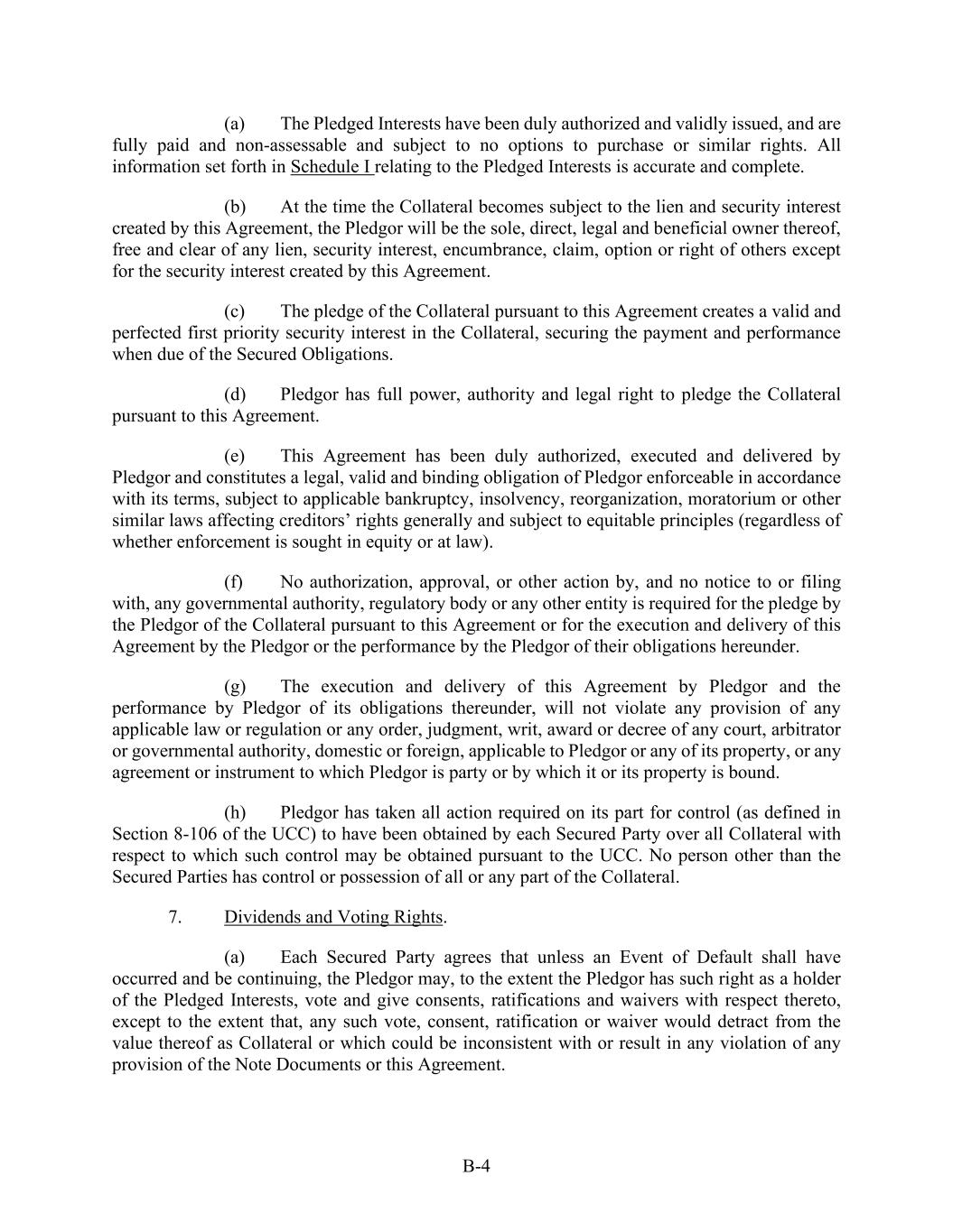B-4 (a) The Pledged Interests have been duly authorized and validly issued, and are fully paid and non-assessable and subject to no options to purchase or similar rights. All information set forth in Schedule I relating to the Pledged Interests is accurate and complete. (b) At the time the Collateral becomes subject to the lien and security interest created by this Agreement, the Pledgor will be the sole, direct, legal and beneficial owner thereof, free and clear of any lien, security interest, encumbrance, claim, option or right of others except for the security interest created by this Agreement. (c) The pledge of the Collateral pursuant to this Agreement creates a valid and perfected first priority security interest in the Collateral, securing the payment and performance when due of the Secured Obligations. (d) Pledgor has full power, authority and legal right to pledge the Collateral pursuant to this Agreement. (e) This Agreement has been duly authorized, executed and delivered by Pledgor and constitutes a legal, valid and binding obligation of Pledgor enforceable in accordance with its terms, subject to applicable bankruptcy, insolvency, reorganization, moratorium or other similar laws affecting creditors’ rights generally and subject to equitable principles (regardless of whether enforcement is sought in equity or at law). (f) No authorization, approval, or other action by, and no notice to or filing with, any governmental authority, regulatory body or any other entity is required for the pledge by the Pledgor of the Collateral pursuant to this Agreement or for the execution and delivery of this Agreement by the Pledgor or the performance by the Pledgor of their obligations hereunder. (g) The execution and delivery of this Agreement by Pledgor and the performance by Pledgor of its obligations thereunder, will not violate any provision of any applicable law or regulation or any order, judgment, writ, award or decree of any court, arbitrator or governmental authority, domestic or foreign, applicable to Pledgor or any of its property, or any agreement or instrument to which Pledgor is party or by which it or its property is bound. (h) Pledgor has taken all action required on its part for control (as defined in Section 8-106 of the UCC) to have been obtained by each Secured Party over all Collateral with respect to which such control may be obtained pursuant to the UCC. No person other than the Secured Parties has control or possession of all or any part of the Collateral. 7. Dividends and Voting Rights. (a) Each Secured Party agrees that unless an Event of Default shall have occurred and be continuing, the Pledgor may, to the extent the Pledgor has such right as a holder of the Pledged Interests, vote and give consents, ratifications and waivers with respect thereto, except to the extent that, any such vote, consent, ratification or waiver would detract from the value thereof as Collateral or which could be inconsistent with or result in any violation of any provision of the Note Documents or this Agreement.