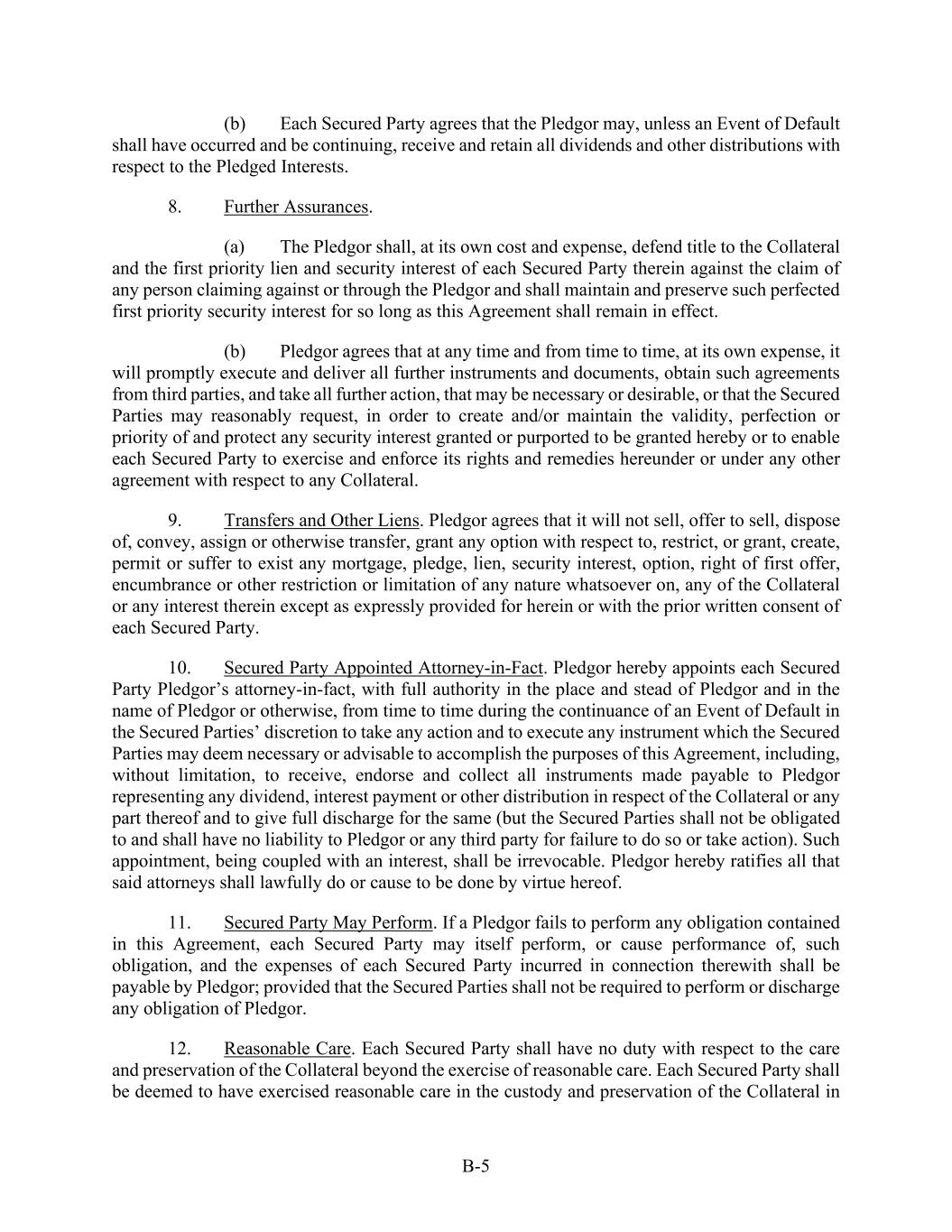 B-5 (b) Each Secured Party agrees that the Pledgor may, unless an Event of Default shall have occurred and be continuing, receive and retain all dividends and other distributions with respect to the Pledged Interests. 8. Further Assurances. (a) The Pledgor shall, at its own cost and expense, defend title to the Collateral and the first priority lien and security interest of each Secured Party therein against the claim of any person claiming against or through the Pledgor and shall maintain and preserve such perfected first priority security interest for so long as this Agreement shall remain in effect. (b) Pledgor agrees that at any time and from time to time, at its own expense, it will promptly execute and deliver all further instruments and documents, obtain such agreements from third parties, and take all further action, that may be necessary or desirable, or that the Secured Parties may reasonably request, in order to create and/or maintain the validity, perfection or priority of and protect any security interest granted or purported to be granted hereby or to enable each Secured Party to exercise and enforce its rights and remedies hereunder or under any other agreement with respect to any Collateral. 9. Transfers and Other Liens. Pledgor agrees that it will not sell, offer to sell, dispose of, convey, assign or otherwise transfer, grant any option with respect to, restrict, or grant, create, permit or suffer to exist any mortgage, pledge, lien, security interest, option, right of first offer, encumbrance or other restriction or limitation of any nature whatsoever on, any of the Collateral or any interest therein except as expressly provided for herein or with the prior written consent of each Secured Party. 10. Secured Party Appointed Attorney-in-Fact. Pledgor hereby appoints each Secured Party Pledgor’s attorney-in-fact, with full authority in the place and stead of Pledgor and in the name of Pledgor or otherwise, from time to time during the continuance of an Event of Default in the Secured Parties’ discretion to take any action and to execute any instrument which the Secured Parties may deem necessary or advisable to accomplish the purposes of this Agreement, including, without limitation, to receive, endorse and collect all instruments made payable to Pledgor representing any dividend, interest payment or other distribution in respect of the Collateral or any part thereof and to give full discharge for the same (but the Secured Parties shall not be obligated to and shall have no liability to Pledgor or any third party for failure to do so or take action). Such appointment, being coupled with an interest, shall be irrevocable. Pledgor hereby ratifies all that said attorneys shall lawfully do or cause to be done by virtue hereof. 11. Secured Party May Perform. If a Pledgor fails to perform any obligation contained in this Agreement, each Secured Party may itself perform, or cause performance of, such obligation, and the expenses of each Secured Party incurred in connection therewith shall be payable by Pledgor; provided that the Secured Parties shall not be required to perform or discharge any obligation of Pledgor. 12. Reasonable Care. Each Secured Party shall have no duty with respect to the care and preservation of the Collateral beyond the exercise of reasonable care. Each Secured Party shall be deemed to have exercised reasonable care in the custody and preservation of the Collateral in