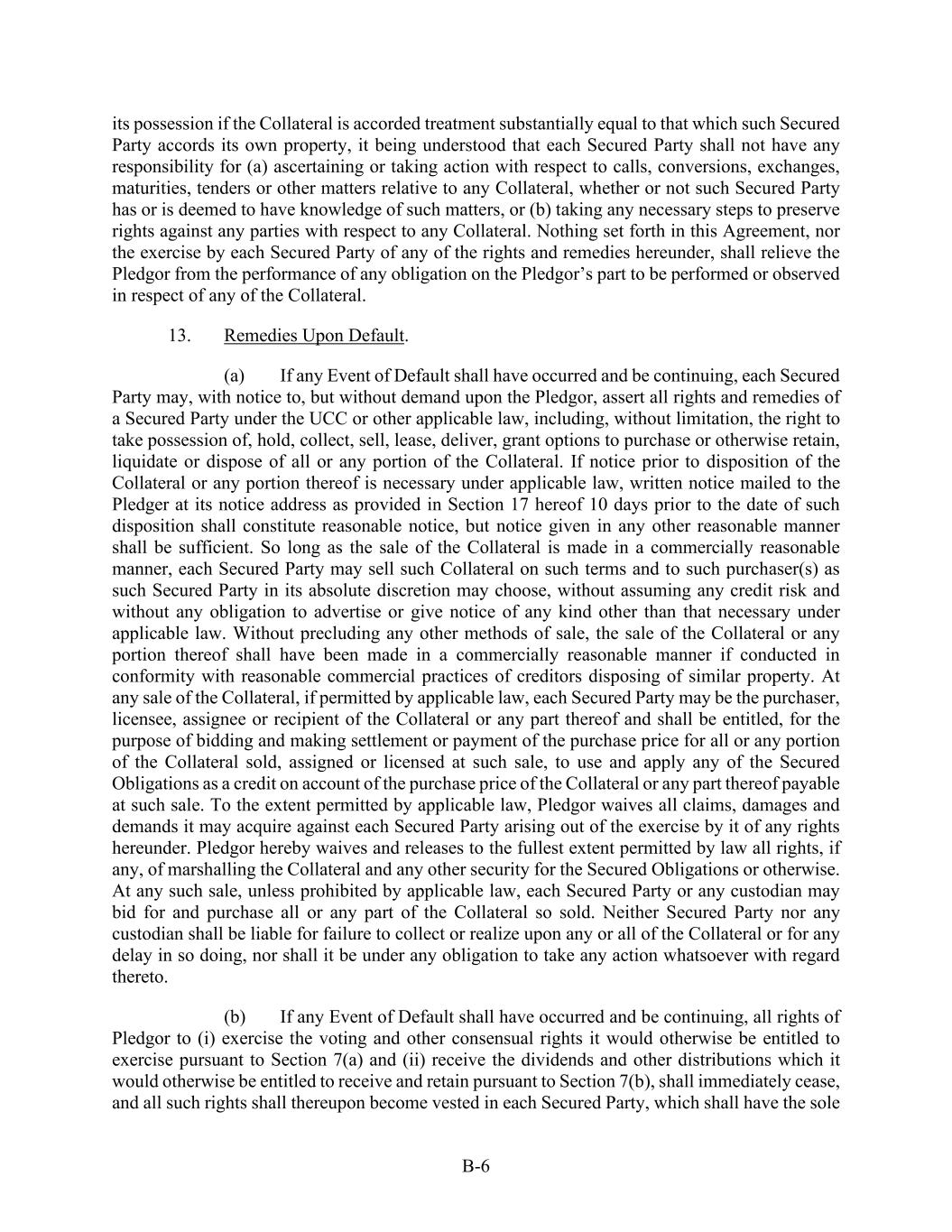 B-6 its possession if the Collateral is accorded treatment substantially equal to that which such Secured Party accords its own property, it being understood that each Secured Party shall not have any responsibility for (a) ascertaining or taking action with respect to calls, conversions, exchanges, maturities, tenders or other matters relative to any Collateral, whether or not such Secured Party has or is deemed to have knowledge of such matters, or (b) taking any necessary steps to preserve rights against any parties with respect to any Collateral. Nothing set forth in this Agreement, nor the exercise by each Secured Party of any of the rights and remedies hereunder, shall relieve the Pledgor from the performance of any obligation on the Pledgor’s part to be performed or observed in respect of any of the Collateral. 13. Remedies Upon Default. (a) If any Event of Default shall have occurred and be continuing, each Secured Party may, with notice to, but without demand upon the Pledgor, assert all rights and remedies of a Secured Party under the UCC or other applicable law, including, without limitation, the right to take possession of, hold, collect, sell, lease, deliver, grant options to purchase or otherwise retain, liquidate or dispose of all or any portion of the Collateral. If notice prior to disposition of the Collateral or any portion thereof is necessary under applicable law, written notice mailed to the Pledger at its notice address as provided in Section 17 hereof 10 days prior to the date of such disposition shall constitute reasonable notice, but notice given in any other reasonable manner shall be sufficient. So long as the sale of the Collateral is made in a commercially reasonable manner, each Secured Party may sell such Collateral on such terms and to such purchaser(s) as such Secured Party in its absolute discretion may choose, without assuming any credit risk and without any obligation to advertise or give notice of any kind other than that necessary under applicable law. Without precluding any other methods of sale, the sale of the Collateral or any portion thereof shall have been made in a commercially reasonable manner if conducted in conformity with reasonable commercial practices of creditors disposing of similar property. At any sale of the Collateral, if permitted by applicable law, each Secured Party may be the purchaser, licensee, assignee or recipient of the Collateral or any part thereof and shall be entitled, for the purpose of bidding and making settlement or payment of the purchase price for all or any portion of the Collateral sold, assigned or licensed at such sale, to use and apply any of the Secured Obligations as a credit on account of the purchase price of the Collateral or any part thereof payable at such sale. To the extent permitted by applicable law, Pledgor waives all claims, damages and demands it may acquire against each Secured Party arising out of the exercise by it of any rights hereunder. Pledgor hereby waives and releases to the fullest extent permitted by law all rights, if any, of marshalling the Collateral and any other security for the Secured Obligations or otherwise. At any such sale, unless prohibited by applicable law, each Secured Party or any custodian may bid for and purchase all or any part of the Collateral so sold. Neither Secured Party nor any custodian shall be liable for failure to collect or realize upon any or all of the Collateral or for any delay in so doing, nor shall it be under any obligation to take any action whatsoever with regard thereto. (b) If any Event of Default shall have occurred and be continuing, all rights of Pledgor to (i) exercise the voting and other consensual rights it would otherwise be entitled to exercise pursuant to Section 7(a) and (ii) receive the dividends and other distributions which it would otherwise be entitled to receive and retain pursuant to Section 7(b), shall immediately cease, and all such rights shall thereupon become vested in each Secured Party, which shall have the sole