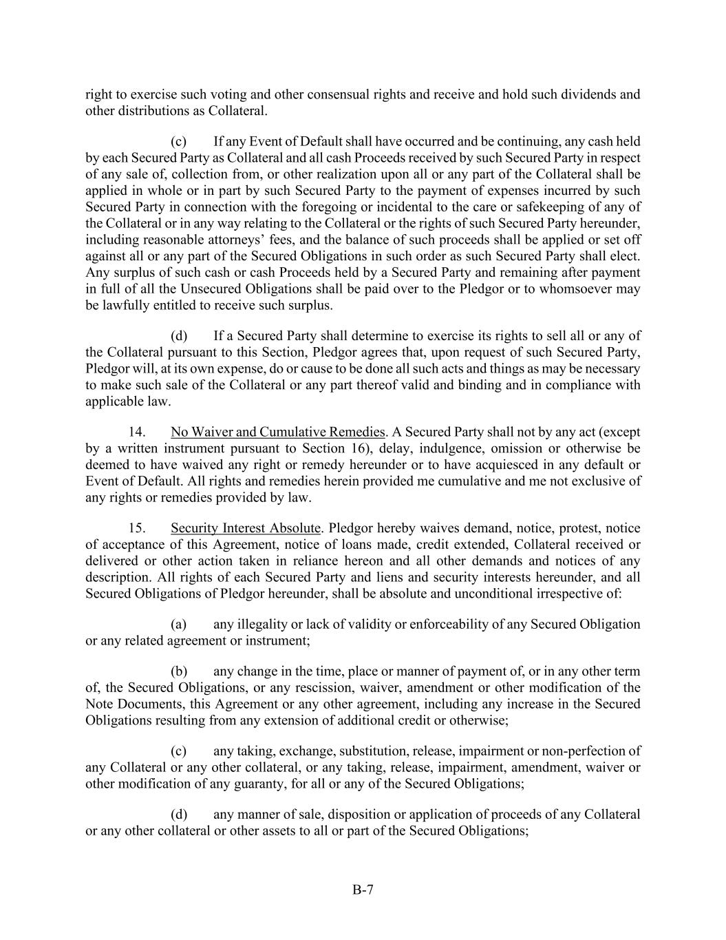 B-7 right to exercise such voting and other consensual rights and receive and hold such dividends and other distributions as Collateral. (c) If any Event of Default shall have occurred and be continuing, any cash held by each Secured Party as Collateral and all cash Proceeds received by such Secured Party in respect of any sale of, collection from, or other realization upon all or any part of the Collateral shall be applied in whole or in part by such Secured Party to the payment of expenses incurred by such Secured Party in connection with the foregoing or incidental to the care or safekeeping of any of the Collateral or in any way relating to the Collateral or the rights of such Secured Party hereunder, including reasonable attorneys’ fees, and the balance of such proceeds shall be applied or set off against all or any part of the Secured Obligations in such order as such Secured Party shall elect. Any surplus of such cash or cash Proceeds held by a Secured Party and remaining after payment in full of all the Unsecured Obligations shall be paid over to the Pledgor or to whomsoever may be lawfully entitled to receive such surplus. (d) If a Secured Party shall determine to exercise its rights to sell all or any of the Collateral pursuant to this Section, Pledgor agrees that, upon request of such Secured Party, Pledgor will, at its own expense, do or cause to be done all such acts and things as may be necessary to make such sale of the Collateral or any part thereof valid and binding and in compliance with applicable law. 14. No Waiver and Cumulative Remedies. A Secured Party shall not by any act (except by a written instrument pursuant to Section 16), delay, indulgence, omission or otherwise be deemed to have waived any right or remedy hereunder or to have acquiesced in any default or Event of Default. All rights and remedies herein provided me cumulative and me not exclusive of any rights or remedies provided by law. 15. Security Interest Absolute. Pledgor hereby waives demand, notice, protest, notice of acceptance of this Agreement, notice of loans made, credit extended, Collateral received or delivered or other action taken in reliance hereon and all other demands and notices of any description. All rights of each Secured Party and liens and security interests hereunder, and all Secured Obligations of Pledgor hereunder, shall be absolute and unconditional irrespective of: (a) any illegality or lack of validity or enforceability of any Secured Obligation or any related agreement or instrument; (b) any change in the time, place or manner of payment of, or in any other term of, the Secured Obligations, or any rescission, waiver, amendment or other modification of the Note Documents, this Agreement or any other agreement, including any increase in the Secured Obligations resulting from any extension of additional credit or otherwise; (c) any taking, exchange, substitution, release, impairment or non-perfection of any Collateral or any other collateral, or any taking, release, impairment, amendment, waiver or other modification of any guaranty, for all or any of the Secured Obligations; (d) any manner of sale, disposition or application of proceeds of any Collateral or any other collateral or other assets to all or part of the Secured Obligations;