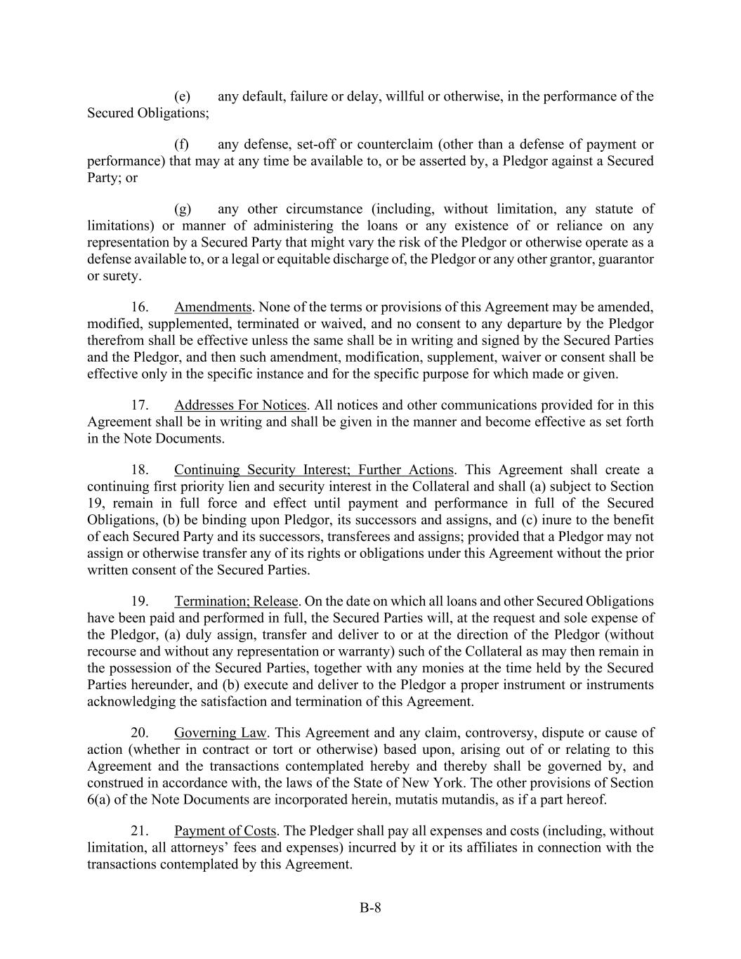 B-8 (e) any default, failure or delay, willful or otherwise, in the performance of the Secured Obligations; (f) any defense, set-off or counterclaim (other than a defense of payment or performance) that may at any time be available to, or be asserted by, a Pledgor against a Secured Party; or (g) any other circumstance (including, without limitation, any statute of limitations) or manner of administering the loans or any existence of or reliance on any representation by a Secured Party that might vary the risk of the Pledgor or otherwise operate as a defense available to, or a legal or equitable discharge of, the Pledgor or any other grantor, guarantor or surety. 16. Amendments. None of the terms or provisions of this Agreement may be amended, modified, supplemented, terminated or waived, and no consent to any departure by the Pledgor therefrom shall be effective unless the same shall be in writing and signed by the Secured Parties and the Pledgor, and then such amendment, modification, supplement, waiver or consent shall be effective only in the specific instance and for the specific purpose for which made or given. 17. Addresses For Notices. All notices and other communications provided for in this Agreement shall be in writing and shall be given in the manner and become effective as set forth in the Note Documents. 18. Continuing Security Interest; Further Actions. This Agreement shall create a continuing first priority lien and security interest in the Collateral and shall (a) subject to Section 19, remain in full force and effect until payment and performance in full of the Secured Obligations, (b) be binding upon Pledgor, its successors and assigns, and (c) inure to the benefit of each Secured Party and its successors, transferees and assigns; provided that a Pledgor may not assign or otherwise transfer any of its rights or obligations under this Agreement without the prior written consent of the Secured Parties. 19. Termination; Release. On the date on which all loans and other Secured Obligations have been paid and performed in full, the Secured Parties will, at the request and sole expense of the Pledgor, (a) duly assign, transfer and deliver to or at the direction of the Pledgor (without recourse and without any representation or warranty) such of the Collateral as may then remain in the possession of the Secured Parties, together with any monies at the time held by the Secured Parties hereunder, and (b) execute and deliver to the Pledgor a proper instrument or instruments acknowledging the satisfaction and termination of this Agreement. 20. Governing Law. This Agreement and any claim, controversy, dispute or cause of action (whether in contract or tort or otherwise) based upon, arising out of or relating to this Agreement and the transactions contemplated hereby and thereby shall be governed by, and construed in accordance with, the laws of the State of New York. The other provisions of Section 6(a) of the Note Documents are incorporated herein, mutatis mutandis, as if a part hereof. 21. Payment of Costs. The Pledger shall pay all expenses and costs (including, without limitation, all attorneys’ fees and expenses) incurred by it or its affiliates in connection with the transactions contemplated by this Agreement.