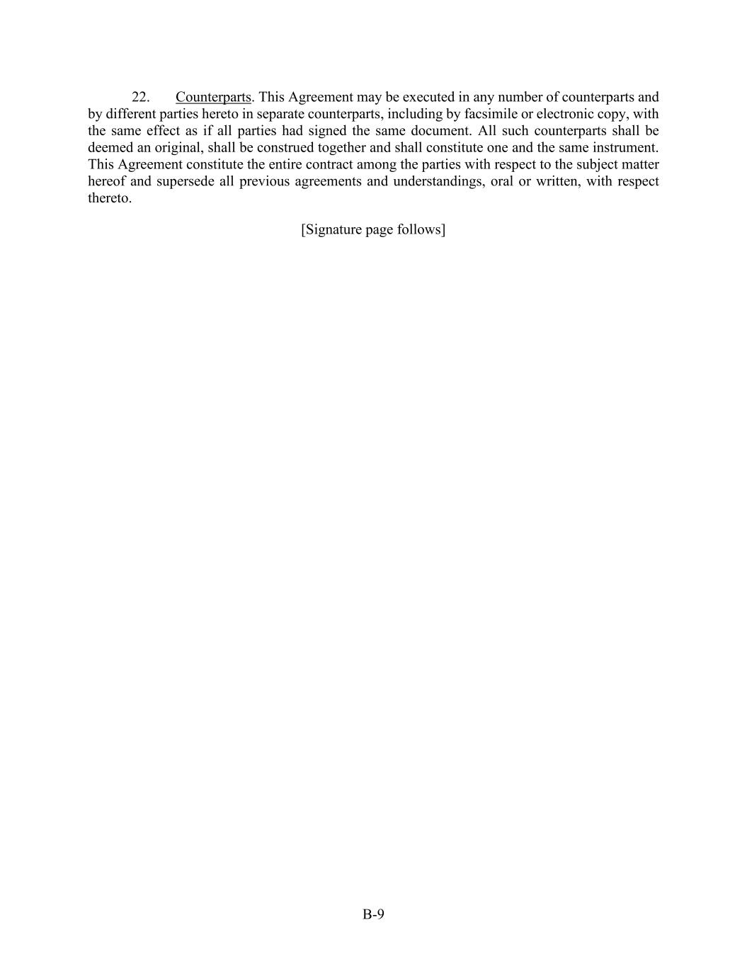B-9 22. Counterparts. This Agreement may be executed in any number of counterparts and by different parties hereto in separate counterparts, including by facsimile or electronic copy, with the same effect as if all parties had signed the same document. All such counterparts shall be deemed an original, shall be construed together and shall constitute one and the same instrument. This Agreement constitute the entire contract among the parties with respect to the subject matter hereof and supersede all previous agreements and understandings, oral or written, with respect thereto. [Signature page follows]