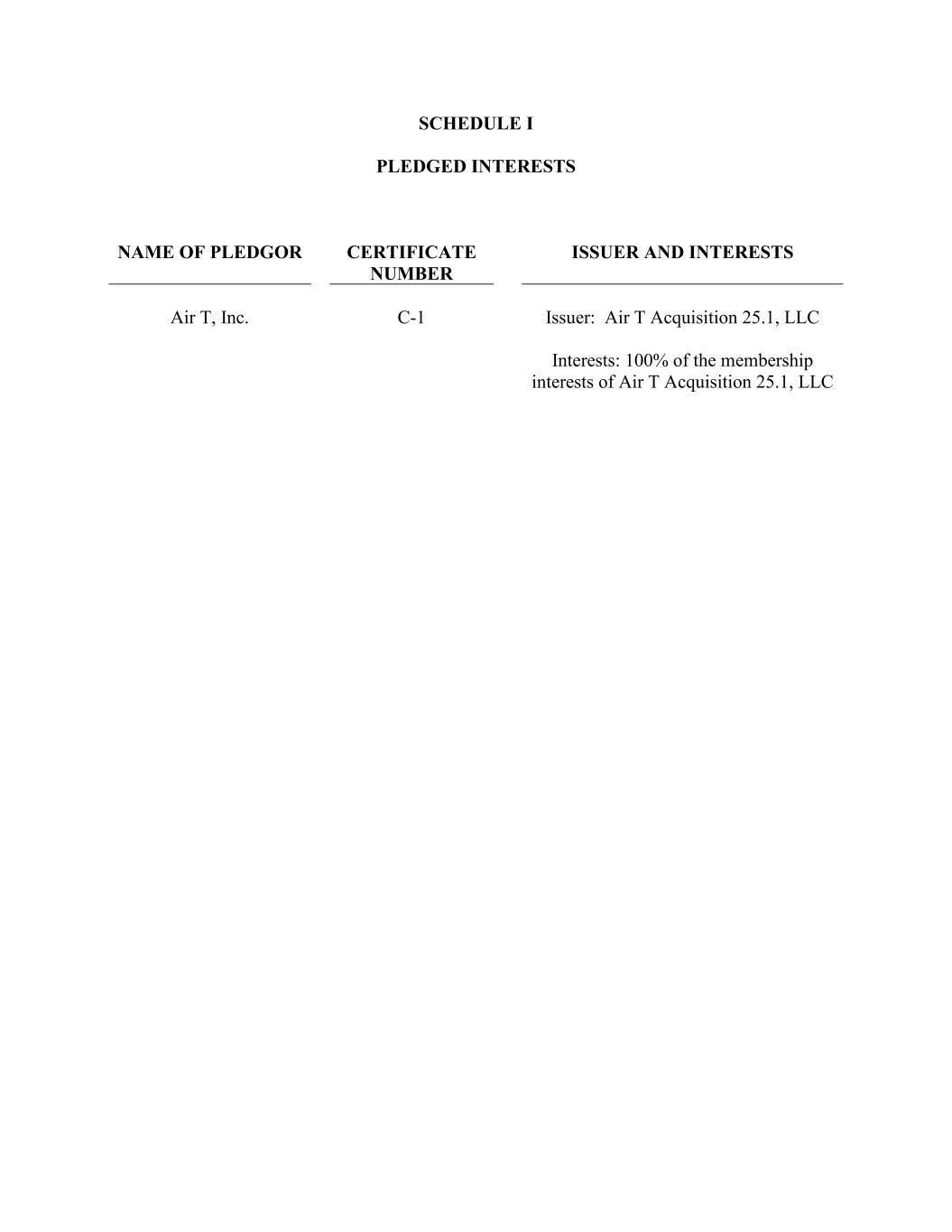 SCHEDULE I PLEDGED INTERESTS NAME OF PLEDGOR CERTIFICATE NUMBER ISSUER AND INTERESTS Air T, Inc. C-1 Issuer: Air T Acquisition 25.1, LLC Interests: 100% of the membership interests of Air T Acquisition 25.1, LLC