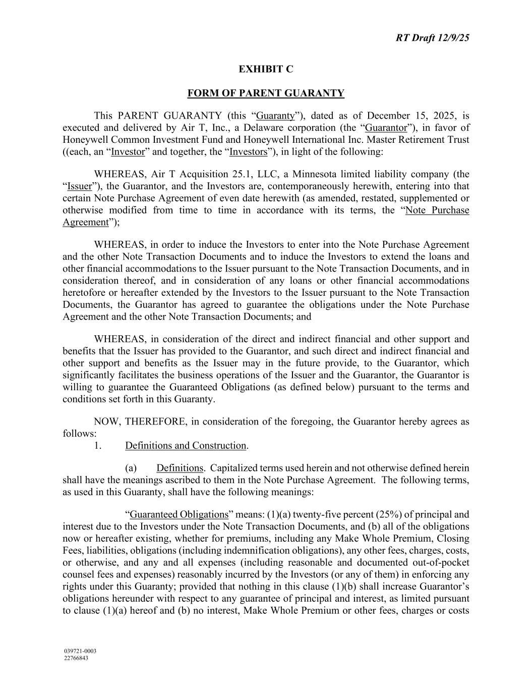 RT Draft 12/9/25 039721-0003 22766843 EXHIBIT C FORM OF PARENT GUARANTY This PARENT GUARANTY (this “Guaranty”), dated as of December 15, 2025, is executed and delivered by Air T, Inc., a Delaware corporation (the “Guarantor”), in favor of Honeywell Common Investment Fund and Honeywell International Inc. Master Retirement Trust ((each, an “Investor” and together, the “Investors”), in light of the following: WHEREAS, Air T Acquisition 25.1, LLC, a Minnesota limited liability company (the “Issuer”), the Guarantor, and the Investors are, contemporaneously herewith, entering into that certain Note Purchase Agreement of even date herewith (as amended, restated, supplemented or otherwise modified from time to time in accordance with its terms, the “Note Purchase Agreement”); WHEREAS, in order to induce the Investors to enter into the Note Purchase Agreement and the other Note Transaction Documents and to induce the Investors to extend the loans and other financial accommodations to the Issuer pursuant to the Note Transaction Documents, and in consideration thereof, and in consideration of any loans or other financial accommodations heretofore or hereafter extended by the Investors to the Issuer pursuant to the Note Transaction Documents, the Guarantor has agreed to guarantee the obligations under the Note Purchase Agreement and the other Note Transaction Documents; and WHEREAS, in consideration of the direct and indirect financial and other support and benefits that the Issuer has provided to the Guarantor, and such direct and indirect financial and other support and benefits as the Issuer may in the future provide, to the Guarantor, which significantly facilitates the business operations of the Issuer and the Guarantor, the Guarantor is willing to guarantee the Guaranteed Obligations (as defined below) pursuant to the terms and conditions set forth in this Guaranty. NOW, THEREFORE, in consideration of the foregoing, the Guarantor hereby agrees as follows: 1. Definitions and Construction. (a) Definitions. Capitalized terms used herein and not otherwise defined herein shall have the meanings ascribed to them in the Note Purchase Agreement. The following terms, as used in this Guaranty, shall have the following meanings: “Guaranteed Obligations” means: (1)(a) twenty-five percent (25%) of principal and interest due to the Investors under the Note Transaction Documents, and (b) all of the obligations now or hereafter existing, whether for premiums, including any Make Whole Premium, Closing Fees, liabilities, obligations (including indemnification obligations), any other fees, charges, costs, or otherwise, and any and all expenses (including reasonable and documented out-of-pocket counsel fees and expenses) reasonably incurred by the Investors (or any of them) in enforcing any rights under this Guaranty; provided that nothing in this clause (1)(b) shall increase Guarantor’s obligations hereunder with respect to any guarantee of principal and interest, as limited pursuant to clause (1)(a) hereof and (b) no interest, Make Whole Premium or other fees, charges or costs
