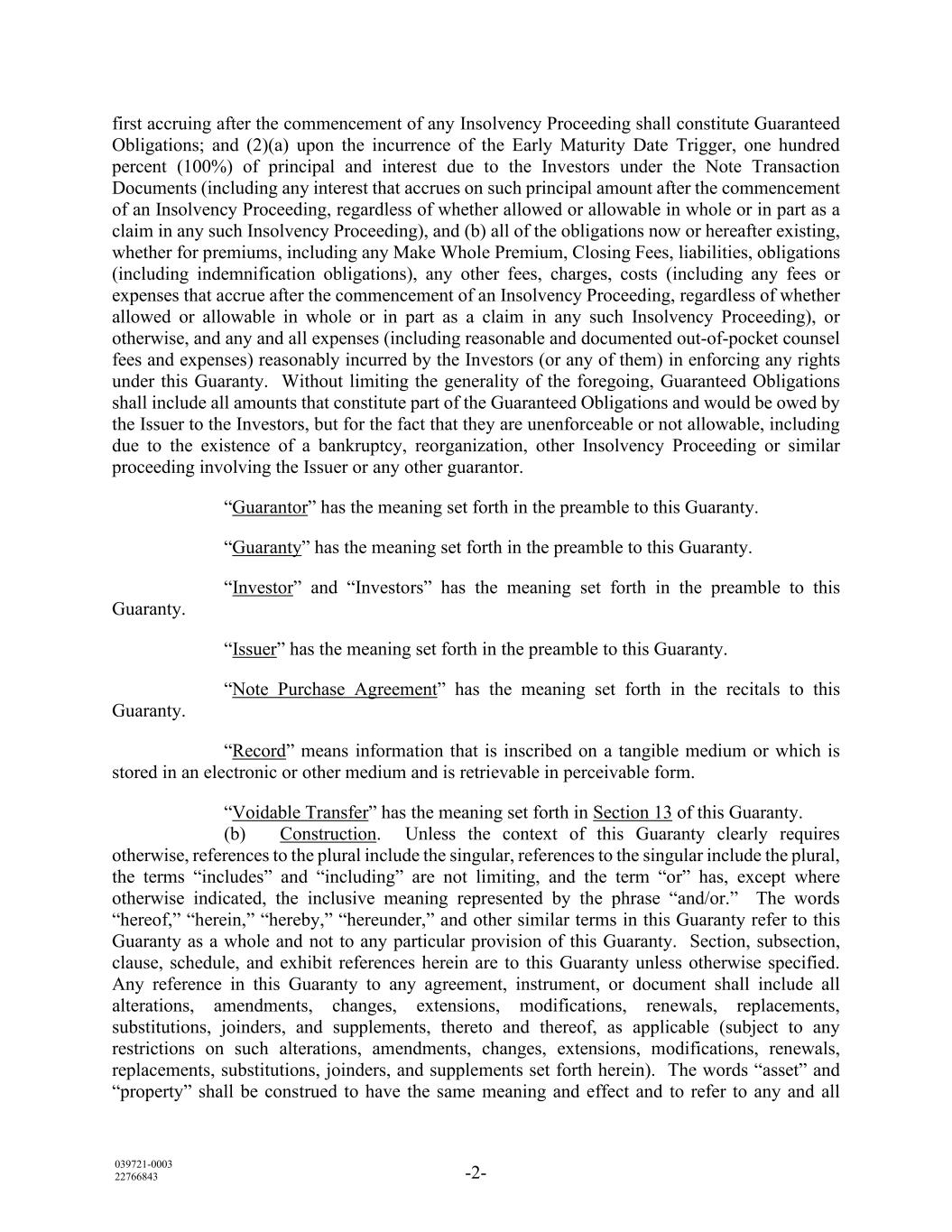 039721-0003 22766843 -2- first accruing after the commencement of any Insolvency Proceeding shall constitute Guaranteed Obligations; and (2)(a) upon the incurrence of the Early Maturity Date Trigger, one hundred percent (100%) of principal and interest due to the Investors under the Note Transaction Documents (including any interest that accrues on such principal amount after the commencement of an Insolvency Proceeding, regardless of whether allowed or allowable in whole or in part as a claim in any such Insolvency Proceeding), and (b) all of the obligations now or hereafter existing, whether for premiums, including any Make Whole Premium, Closing Fees, liabilities, obligations (including indemnification obligations), any other fees, charges, costs (including any fees or expenses that accrue after the commencement of an Insolvency Proceeding, regardless of whether allowed or allowable in whole or in part as a claim in any such Insolvency Proceeding), or otherwise, and any and all expenses (including reasonable and documented out-of-pocket counsel fees and expenses) reasonably incurred by the Investors (or any of them) in enforcing any rights under this Guaranty. Without limiting the generality of the foregoing, Guaranteed Obligations shall include all amounts that constitute part of the Guaranteed Obligations and would be owed by the Issuer to the Investors, but for the fact that they are unenforceable or not allowable, including due to the existence of a bankruptcy, reorganization, other Insolvency Proceeding or similar proceeding involving the Issuer or any other guarantor. “Guarantor” has the meaning set forth in the preamble to this Guaranty. “Guaranty” has the meaning set forth in the preamble to this Guaranty. “Investor” and “Investors” has the meaning set forth in the preamble to this Guaranty. “Issuer” has the meaning set forth in the preamble to this Guaranty. “Note Purchase Agreement” has the meaning set forth in the recitals to this Guaranty. “Record” means information that is inscribed on a tangible medium or which is stored in an electronic or other medium and is retrievable in perceivable form. “Voidable Transfer” has the meaning set forth in Section 13 of this Guaranty. (b) Construction. Unless the context of this Guaranty clearly requires otherwise, references to the plural include the singular, references to the singular include the plural, the terms “includes” and “including” are not limiting, and the term “or” has, except where otherwise indicated, the inclusive meaning represented by the phrase “and/or.” The words “hereof,” “herein,” “hereby,” “hereunder,” and other similar terms in this Guaranty refer to this Guaranty as a whole and not to any particular provision of this Guaranty. Section, subsection, clause, schedule, and exhibit references herein are to this Guaranty unless otherwise specified. Any reference in this Guaranty to any agreement, instrument, or document shall include all alterations, amendments, changes, extensions, modifications, renewals, replacements, substitutions, joinders, and supplements, thereto and thereof, as applicable (subject to any restrictions on such alterations, amendments, changes, extensions, modifications, renewals, replacements, substitutions, joinders, and supplements set forth herein). The words “asset” and “property” shall be construed to have the same meaning and effect and to refer to any and all