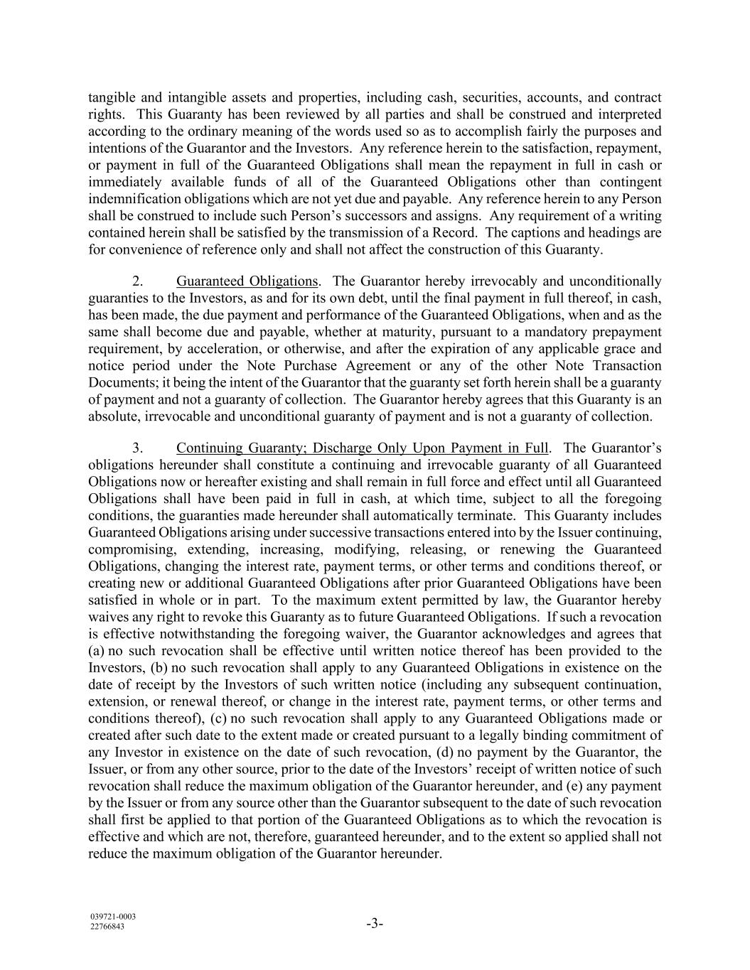 039721-0003 22766843 -3- tangible and intangible assets and properties, including cash, securities, accounts, and contract rights. This Guaranty has been reviewed by all parties and shall be construed and interpreted according to the ordinary meaning of the words used so as to accomplish fairly the purposes and intentions of the Guarantor and the Investors. Any reference herein to the satisfaction, repayment, or payment in full of the Guaranteed Obligations shall mean the repayment in full in cash or immediately available funds of all of the Guaranteed Obligations other than contingent indemnification obligations which are not yet due and payable. Any reference herein to any Person shall be construed to include such Person’s successors and assigns. Any requirement of a writing contained herein shall be satisfied by the transmission of a Record. The captions and headings are for convenience of reference only and shall not affect the construction of this Guaranty. 2. Guaranteed Obligations. The Guarantor hereby irrevocably and unconditionally guaranties to the Investors, as and for its own debt, until the final payment in full thereof, in cash, has been made, the due payment and performance of the Guaranteed Obligations, when and as the same shall become due and payable, whether at maturity, pursuant to a mandatory prepayment requirement, by acceleration, or otherwise, and after the expiration of any applicable grace and notice period under the Note Purchase Agreement or any of the other Note Transaction Documents; it being the intent of the Guarantor that the guaranty set forth herein shall be a guaranty of payment and not a guaranty of collection. The Guarantor hereby agrees that this Guaranty is an absolute, irrevocable and unconditional guaranty of payment and is not a guaranty of collection. 3. Continuing Guaranty; Discharge Only Upon Payment in Full. The Guarantor’s obligations hereunder shall constitute a continuing and irrevocable guaranty of all Guaranteed Obligations now or hereafter existing and shall remain in full force and effect until all Guaranteed Obligations shall have been paid in full in cash, at which time, subject to all the foregoing conditions, the guaranties made hereunder shall automatically terminate. This Guaranty includes Guaranteed Obligations arising under successive transactions entered into by the Issuer continuing, compromising, extending, increasing, modifying, releasing, or renewing the Guaranteed Obligations, changing the interest rate, payment terms, or other terms and conditions thereof, or creating new or additional Guaranteed Obligations after prior Guaranteed Obligations have been satisfied in whole or in part. To the maximum extent permitted by law, the Guarantor hereby waives any right to revoke this Guaranty as to future Guaranteed Obligations. If such a revocation is effective notwithstanding the foregoing waiver, the Guarantor acknowledges and agrees that (a) no such revocation shall be effective until written notice thereof has been provided to the Investors, (b) no such revocation shall apply to any Guaranteed Obligations in existence on the date of receipt by the Investors of such written notice (including any subsequent continuation, extension, or renewal thereof, or change in the interest rate, payment terms, or other terms and conditions thereof), (c) no such revocation shall apply to any Guaranteed Obligations made or created after such date to the extent made or created pursuant to a legally binding commitment of any Investor in existence on the date of such revocation, (d) no payment by the Guarantor, the Issuer, or from any other source, prior to the date of the Investors’ receipt of written notice of such revocation shall reduce the maximum obligation of the Guarantor hereunder, and (e) any payment by the Issuer or from any source other than the Guarantor subsequent to the date of such revocation shall first be applied to that portion of the Guaranteed Obligations as to which the revocation is effective and which are not, therefore, guaranteed hereunder, and to the extent so applied shall not reduce the maximum obligation of the Guarantor hereunder.