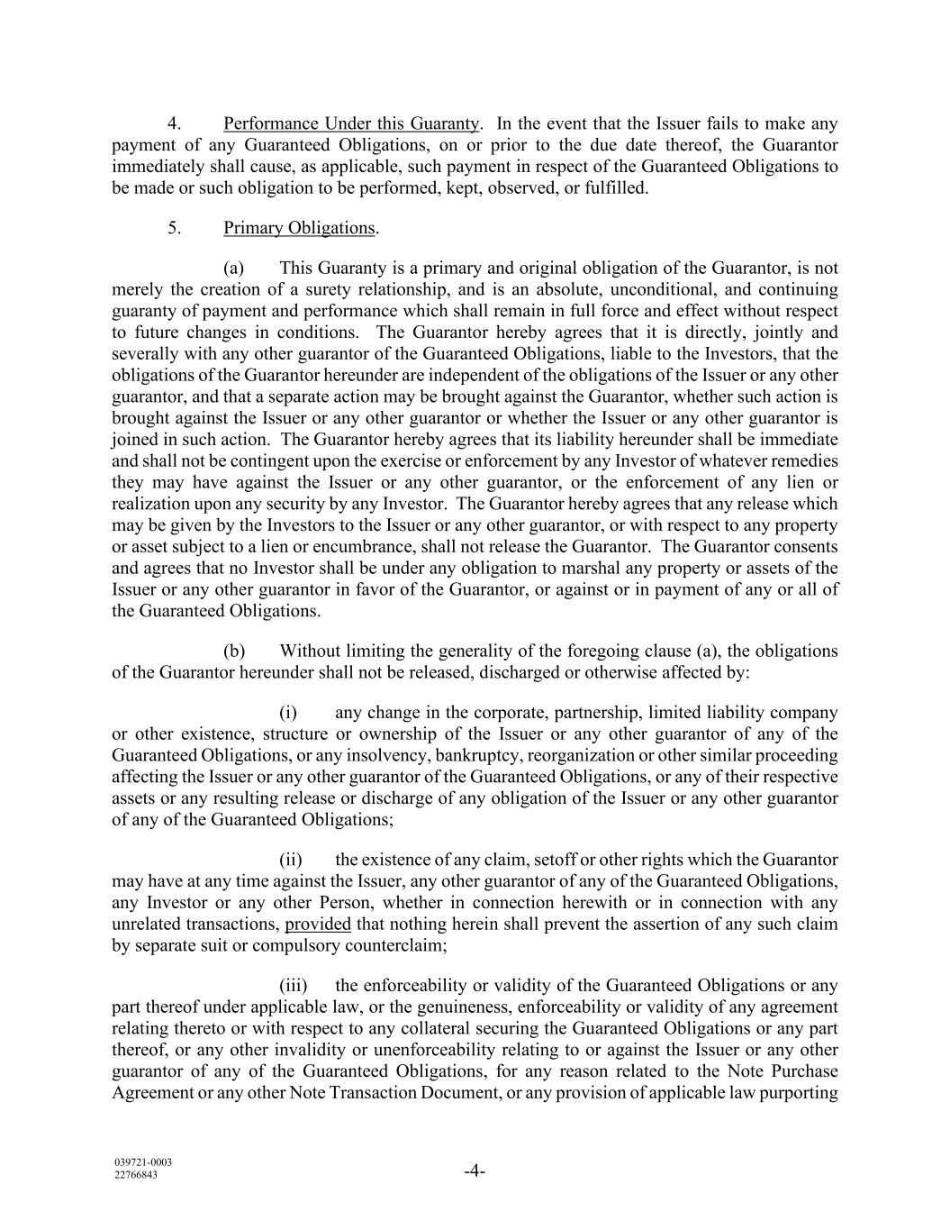 039721-0003 22766843 -4- 4. Performance Under this Guaranty. In the event that the Issuer fails to make any payment of any Guaranteed Obligations, on or prior to the due date thereof, the Guarantor immediately shall cause, as applicable, such payment in respect of the Guaranteed Obligations to be made or such obligation to be performed, kept, observed, or fulfilled. 5. Primary Obligations. (a) This Guaranty is a primary and original obligation of the Guarantor, is not merely the creation of a surety relationship, and is an absolute, unconditional, and continuing guaranty of payment and performance which shall remain in full force and effect without respect to future changes in conditions. The Guarantor hereby agrees that it is directly, jointly and severally with any other guarantor of the Guaranteed Obligations, liable to the Investors, that the obligations of the Guarantor hereunder are independent of the obligations of the Issuer or any other guarantor, and that a separate action may be brought against the Guarantor, whether such action is brought against the Issuer or any other guarantor or whether the Issuer or any other guarantor is joined in such action. The Guarantor hereby agrees that its liability hereunder shall be immediate and shall not be contingent upon the exercise or enforcement by any Investor of whatever remedies they may have against the Issuer or any other guarantor, or the enforcement of any lien or realization upon any security by any Investor. The Guarantor hereby agrees that any release which may be given by the Investors to the Issuer or any other guarantor, or with respect to any property or asset subject to a lien or encumbrance, shall not release the Guarantor. The Guarantor consents and agrees that no Investor shall be under any obligation to marshal any property or assets of the Issuer or any other guarantor in favor of the Guarantor, or against or in payment of any or all of the Guaranteed Obligations. (b) Without limiting the generality of the foregoing clause (a), the obligations of the Guarantor hereunder shall not be released, discharged or otherwise affected by: (i) any change in the corporate, partnership, limited liability company or other existence, structure or ownership of the Issuer or any other guarantor of any of the Guaranteed Obligations, or any insolvency, bankruptcy, reorganization or other similar proceeding affecting the Issuer or any other guarantor of the Guaranteed Obligations, or any of their respective assets or any resulting release or discharge of any obligation of the Issuer or any other guarantor of any of the Guaranteed Obligations; (ii) the existence of any claim, setoff or other rights which the Guarantor may have at any time against the Issuer, any other guarantor of any of the Guaranteed Obligations, any Investor or any other Person, whether in connection herewith or in connection with any unrelated transactions, provided that nothing herein shall prevent the assertion of any such claim by separate suit or compulsory counterclaim; (iii) the enforceability or validity of the Guaranteed Obligations or any part thereof under applicable law, or the genuineness, enforceability or validity of any agreement relating thereto or with respect to any collateral securing the Guaranteed Obligations or any part thereof, or any other invalidity or unenforceability relating to or against the Issuer or any other guarantor of any of the Guaranteed Obligations, for any reason related to the Note Purchase Agreement or any other Note Transaction Document, or any provision of applicable law purporting