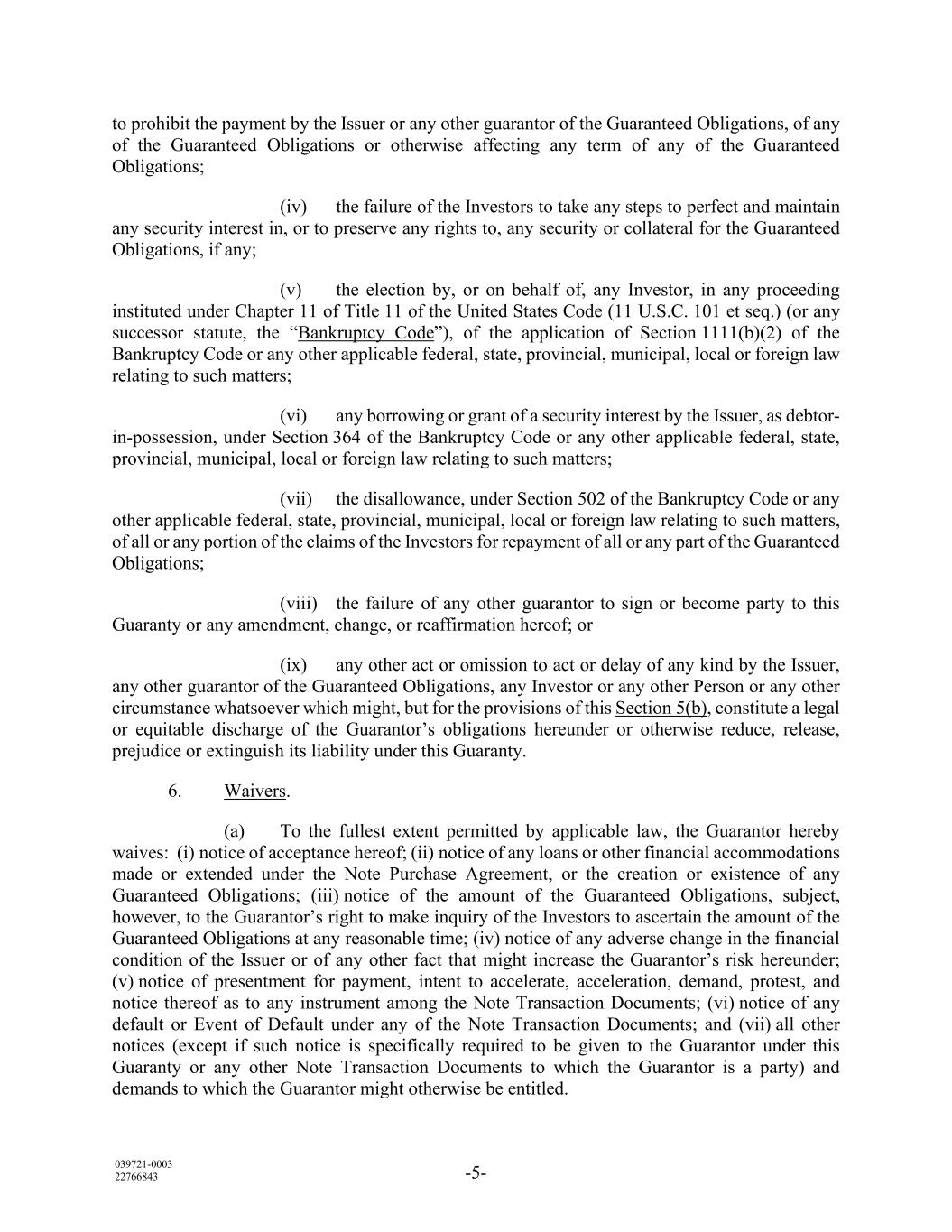 039721-0003 22766843 -5- to prohibit the payment by the Issuer or any other guarantor of the Guaranteed Obligations, of any of the Guaranteed Obligations or otherwise affecting any term of any of the Guaranteed Obligations; (iv) the failure of the Investors to take any steps to perfect and maintain any security interest in, or to preserve any rights to, any security or collateral for the Guaranteed Obligations, if any; (v) the election by, or on behalf of, any Investor, in any proceeding instituted under Chapter 11 of Title 11 of the United States Code (11 U.S.C. 101 et seq.) (or any successor statute, the “Bankruptcy Code”), of the application of Section 1111(b)(2) of the Bankruptcy Code or any other applicable federal, state, provincial, municipal, local or foreign law relating to such matters; (vi) any borrowing or grant of a security interest by the Issuer, as debtor- in-possession, under Section 364 of the Bankruptcy Code or any other applicable federal, state, provincial, municipal, local or foreign law relating to such matters; (vii) the disallowance, under Section 502 of the Bankruptcy Code or any other applicable federal, state, provincial, municipal, local or foreign law relating to such matters, of all or any portion of the claims of the Investors for repayment of all or any part of the Guaranteed Obligations; (viii) the failure of any other guarantor to sign or become party to this Guaranty or any amendment, change, or reaffirmation hereof; or (ix) any other act or omission to act or delay of any kind by the Issuer, any other guarantor of the Guaranteed Obligations, any Investor or any other Person or any other circumstance whatsoever which might, but for the provisions of this Section 5(b), constitute a legal or equitable discharge of the Guarantor’s obligations hereunder or otherwise reduce, release, prejudice or extinguish its liability under this Guaranty. 6. Waivers. (a) To the fullest extent permitted by applicable law, the Guarantor hereby waives: (i) notice of acceptance hereof; (ii) notice of any loans or other financial accommodations made or extended under the Note Purchase Agreement, or the creation or existence of any Guaranteed Obligations; (iii) notice of the amount of the Guaranteed Obligations, subject, however, to the Guarantor’s right to make inquiry of the Investors to ascertain the amount of the Guaranteed Obligations at any reasonable time; (iv) notice of any adverse change in the financial condition of the Issuer or of any other fact that might increase the Guarantor’s risk hereunder; (v) notice of presentment for payment, intent to accelerate, acceleration, demand, protest, and notice thereof as to any instrument among the Note Transaction Documents; (vi) notice of any default or Event of Default under any of the Note Transaction Documents; and (vii) all other notices (except if such notice is specifically required to be given to the Guarantor under this Guaranty or any other Note Transaction Documents to which the Guarantor is a party) and demands to which the Guarantor might otherwise be entitled.