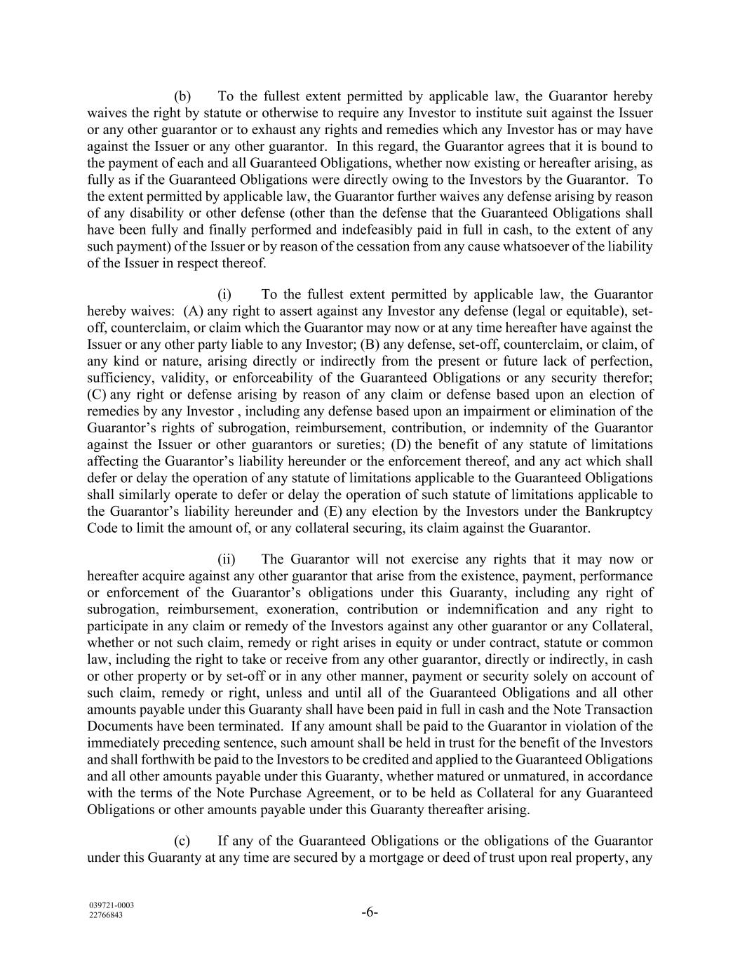 039721-0003 22766843 -6- (b) To the fullest extent permitted by applicable law, the Guarantor hereby waives the right by statute or otherwise to require any Investor to institute suit against the Issuer or any other guarantor or to exhaust any rights and remedies which any Investor has or may have against the Issuer or any other guarantor. In this regard, the Guarantor agrees that it is bound to the payment of each and all Guaranteed Obligations, whether now existing or hereafter arising, as fully as if the Guaranteed Obligations were directly owing to the Investors by the Guarantor. To the extent permitted by applicable law, the Guarantor further waives any defense arising by reason of any disability or other defense (other than the defense that the Guaranteed Obligations shall have been fully and finally performed and indefeasibly paid in full in cash, to the extent of any such payment) of the Issuer or by reason of the cessation from any cause whatsoever of the liability of the Issuer in respect thereof. (i) To the fullest extent permitted by applicable law, the Guarantor hereby waives: (A) any right to assert against any Investor any defense (legal or equitable), set- off, counterclaim, or claim which the Guarantor may now or at any time hereafter have against the Issuer or any other party liable to any Investor; (B) any defense, set-off, counterclaim, or claim, of any kind or nature, arising directly or indirectly from the present or future lack of perfection, sufficiency, validity, or enforceability of the Guaranteed Obligations or any security therefor; (C) any right or defense arising by reason of any claim or defense based upon an election of remedies by any Investor , including any defense based upon an impairment or elimination of the Guarantor’s rights of subrogation, reimbursement, contribution, or indemnity of the Guarantor against the Issuer or other guarantors or sureties; (D) the benefit of any statute of limitations affecting the Guarantor’s liability hereunder or the enforcement thereof, and any act which shall defer or delay the operation of any statute of limitations applicable to the Guaranteed Obligations shall similarly operate to defer or delay the operation of such statute of limitations applicable to the Guarantor’s liability hereunder and (E) any election by the Investors under the Bankruptcy Code to limit the amount of, or any collateral securing, its claim against the Guarantor. (ii) The Guarantor will not exercise any rights that it may now or hereafter acquire against any other guarantor that arise from the existence, payment, performance or enforcement of the Guarantor’s obligations under this Guaranty, including any right of subrogation, reimbursement, exoneration, contribution or indemnification and any right to participate in any claim or remedy of the Investors against any other guarantor or any Collateral, whether or not such claim, remedy or right arises in equity or under contract, statute or common law, including the right to take or receive from any other guarantor, directly or indirectly, in cash or other property or by set-off or in any other manner, payment or security solely on account of such claim, remedy or right, unless and until all of the Guaranteed Obligations and all other amounts payable under this Guaranty shall have been paid in full in cash and the Note Transaction Documents have been terminated. If any amount shall be paid to the Guarantor in violation of the immediately preceding sentence, such amount shall be held in trust for the benefit of the Investors and shall forthwith be paid to the Investors to be credited and applied to the Guaranteed Obligations and all other amounts payable under this Guaranty, whether matured or unmatured, in accordance with the terms of the Note Purchase Agreement, or to be held as Collateral for any Guaranteed Obligations or other amounts payable under this Guaranty thereafter arising. (c) If any of the Guaranteed Obligations or the obligations of the Guarantor under this Guaranty at any time are secured by a mortgage or deed of trust upon real property, any
